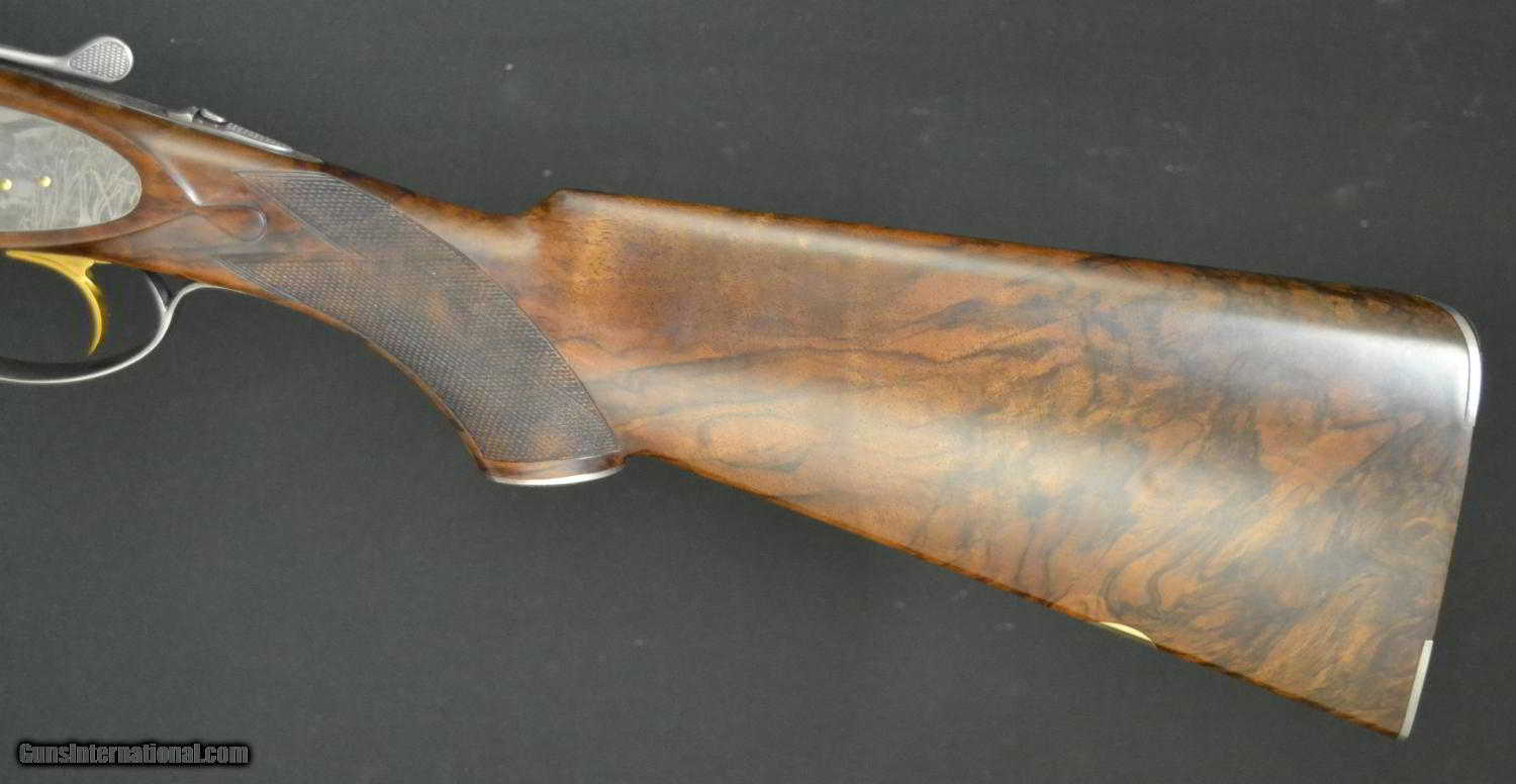Description: CSMC- A10 New Platinum Model - 20ga. 28” barrels with screw in choke tubes, highly marblecaked exhibition Turkish Circassian walnut, capped Prince of Wales long tang grip, drop-point stock, checkered butt with heel and toe plates, London oil finish, target forend, gold oval, vent rib, automatic ejectors, automatic safety, single selective trigger, full sidelock shotgun with hand detachable locks, new engraving pattern of the most incredibly highly detailed bulino engraved game vignettes of setter and Labrador retriever and ducks in marsh surrounded by full coverage miniature scroll, frame is French grayed and plasma hardened, includes makers’ travel case, available for immediate delivery. Base Price- $15,000.00, small frame $500.00 Exhibition Turkish Walnut- $2,000.00, Custom Shop- $1,000.00, drop points- $700.00, Long Tang- $700.00, heel & toe plates $900.00, Gold Oval- $350.00, S&H- $50.00.