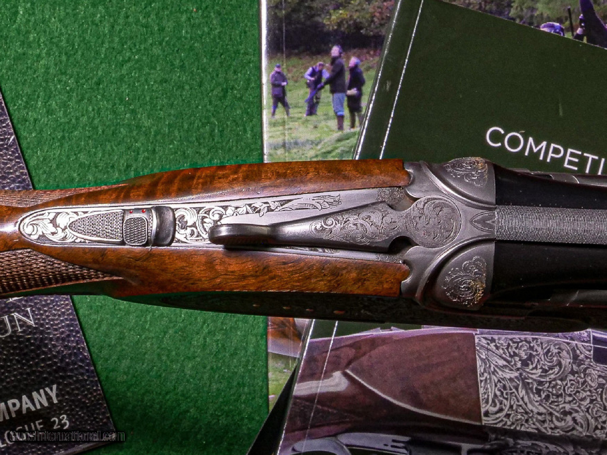 Description: CSMC - A10, O/U Sidelock, Platinum Ornamental, 12ga. 30" Barrels with Screw-in Choke Tubes. Exhibition full feathercrotch walnut target pistol grip stock, target forend, TruOil finish, automatic ejectors, automatic safety, single selective trigger, adjustable trigger, factory pad, vent rib, stunning full coverage ornamental engraving pattern with a French grayed and plasma hardened frame, full side lock shotgun with hand detachable locks, includes maker's case with a nylon cover, available for immediate delivery. Base Price - $23,000.00, Options Include: Exhibition Walnut - $900.00, TruOil Finish - $500.00, S & H- $50.00. Inv: 88925 7 lbs. 10 oz. 14 7/8” x 1 ½” x 2 3/8” $24,450.00 We only sell direct; we use no dealers. You get the maximum value this way without any additional markup. All of our guns are made in the USA, in one facility, designed and built, with a lifetime warranty which no one else can offer. A dealer will sell you the gun he makes the most money on, which generally means less money going into the gun. Price: $24,450.00 Contact Seller |