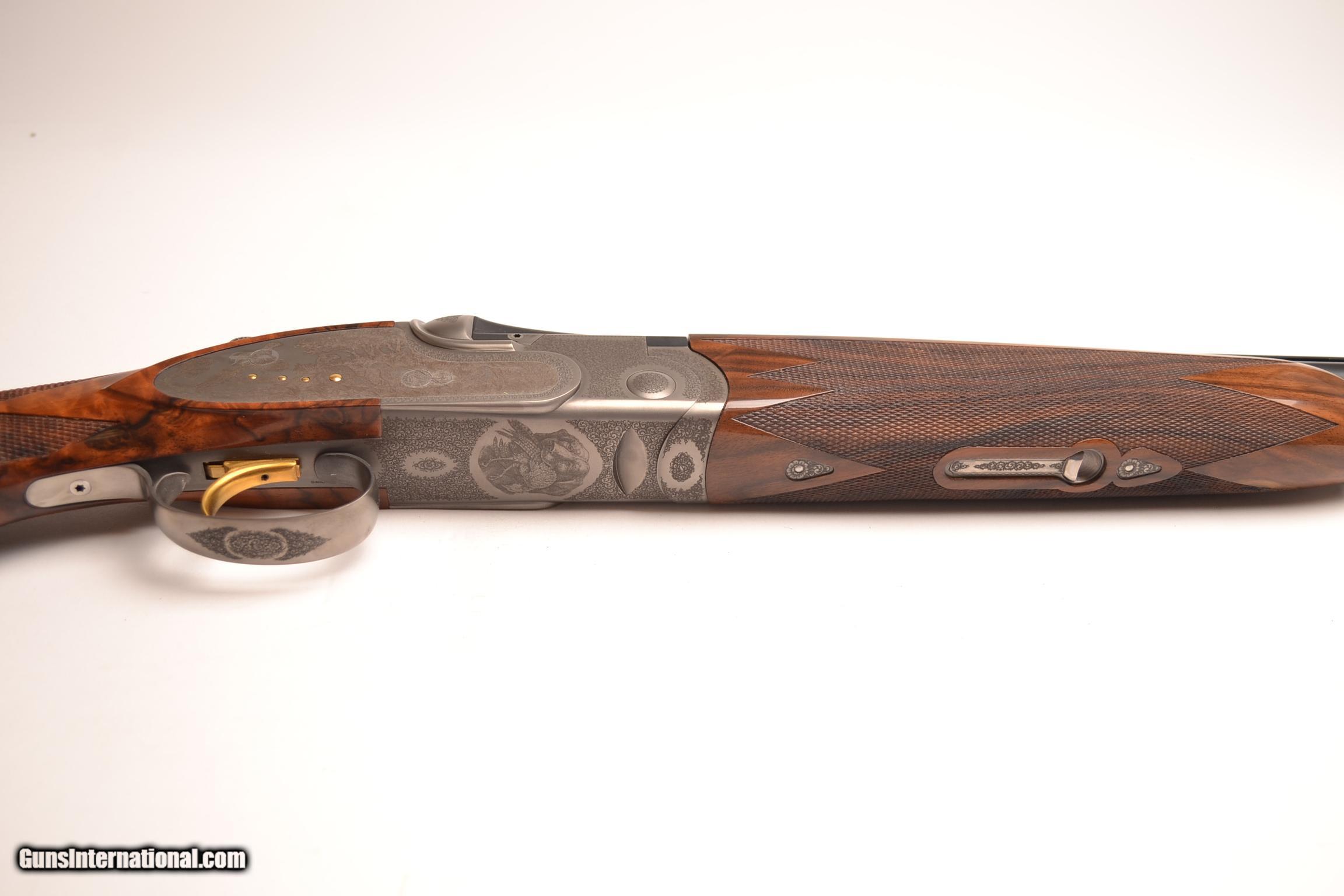 Description: A10 – Platinum, 12ga., 30” barrels, TruLock chokes, stunning Turkish Circassian walnut exhibition wood, target grip, hunting forend, Truoil finish, leather covered pad, gold single selective trigger, vent rib, adjustable trigger, full side lock shotgun with hand detachable locks, marvelous game scene engraving surrounded by full coverage scroll over a coined finish, includes makers case with canvas cover, available for immediate delivery, limited availability. Base price- $20,000, options include: Exhibition wood upgrade – $2,000, leather covered pad $500, TruOil finish – $500, S&H- $50.00. Inv# 30049 7 lbs. 12 oz. 14 ¼”- 14 ¾” x 1 1/2″ x 2 1/2″ $23,050.00 SOLD |