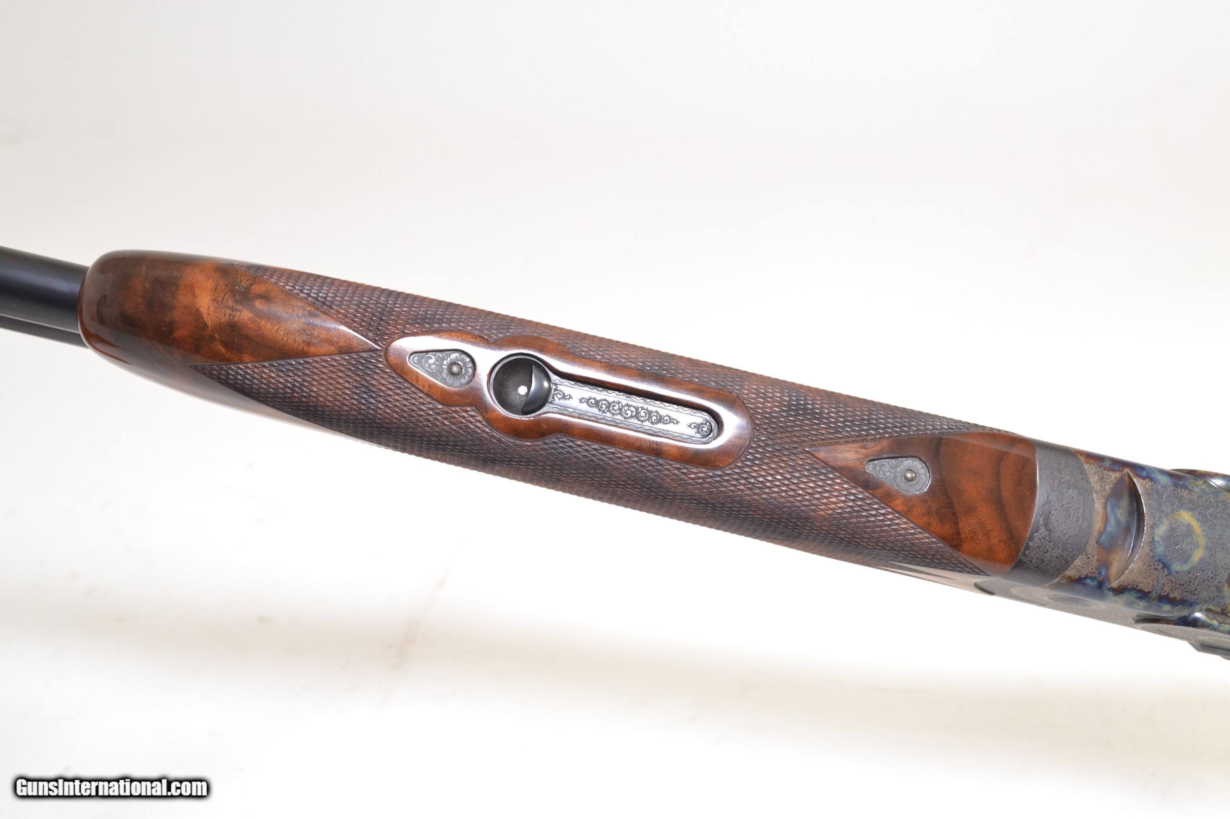 Description: CSMC - A10 - Rose & Scroll, 28ga. 30" Barrels. Screw-in chokes, spectacular 4x Turkish walnut round knob pistol grip stock, hunting forend, single selective trigger, 2 3/4” chambers, automatic ejectors, automatic safety, rubber recoil pad, adjustable trigger, vent rib, full side lock shotgun with hand detachable locks, exceptional full coverage rose & scroll engraving over traditional bone and charcoal case coloring, available for immediate delivery. Inv: 36026 6 lbs. 5 oz. 14 5/8” x 1 ½” x 2 1/4” $20,450.00 SOLD |