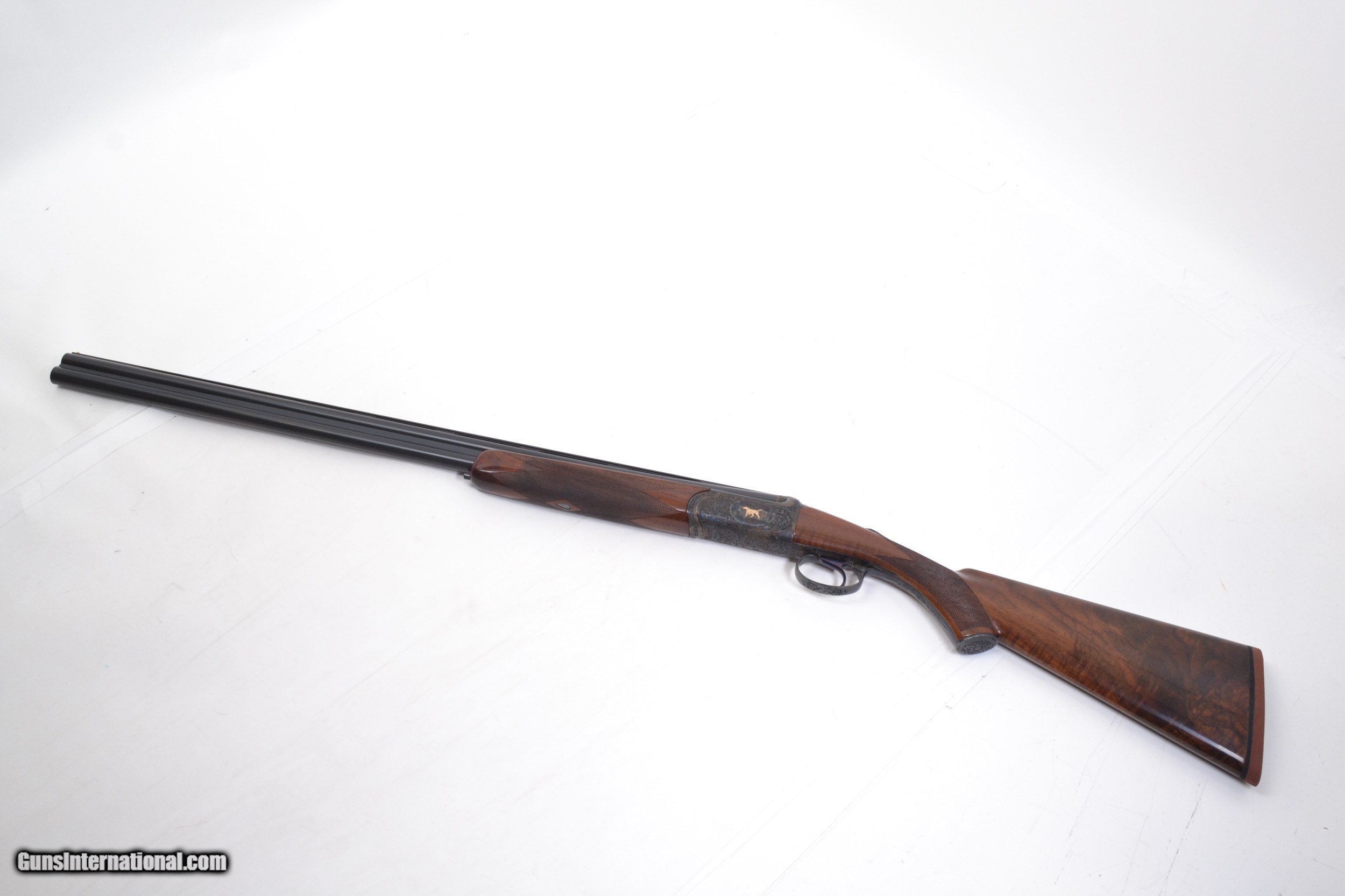 Description: CSMC - Inverness, Deluxe, Round Body, 20ga. 30" Barrels with Screw-in Choke Tubes. Vent rib, long tang capped pistol grip 4x exhibition Turkish walnut, beautiful full coverage ornamental engraving with gold inlayed pointer and setter over a bone and charcoal color case hardened finish, factory screw-in chokes, 3" chambers, fire blued single selective trigger, field forend, Truoil finish, thin factory recoil pad, 100% new gun available for immediate delivery. Base - $12,500.00, Options Include: TruOil Finish - $500.00, Long Tang Trigger Guard - $700.00, Case Coloring - $500.00, Turkish Walnut - $1,100.00, S & H - $50.00. Inv: 44731 6 lbs. 6 oz. 14 3/8" x 1 3/8" x 2 3/8" $15,350.00 SOLD |