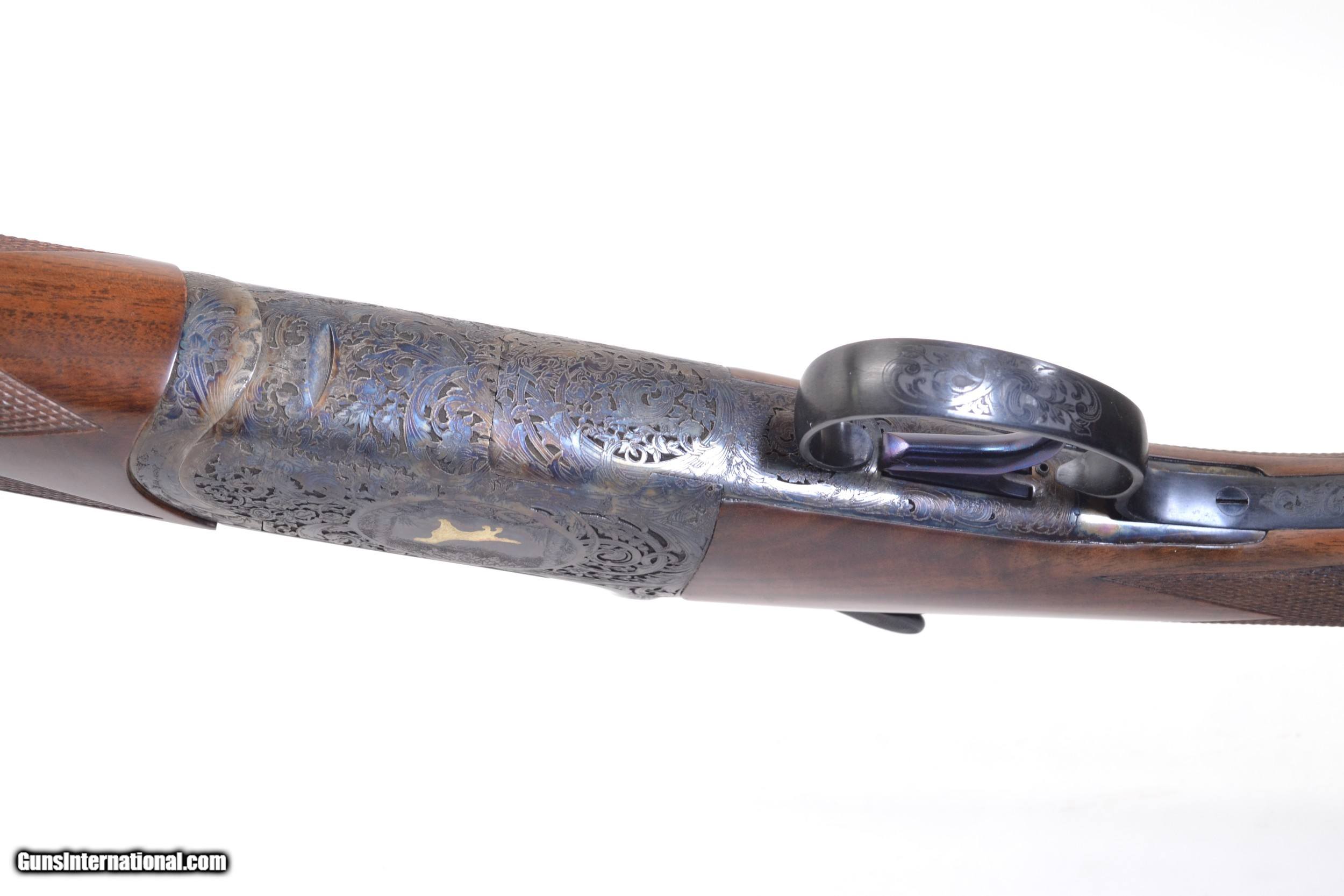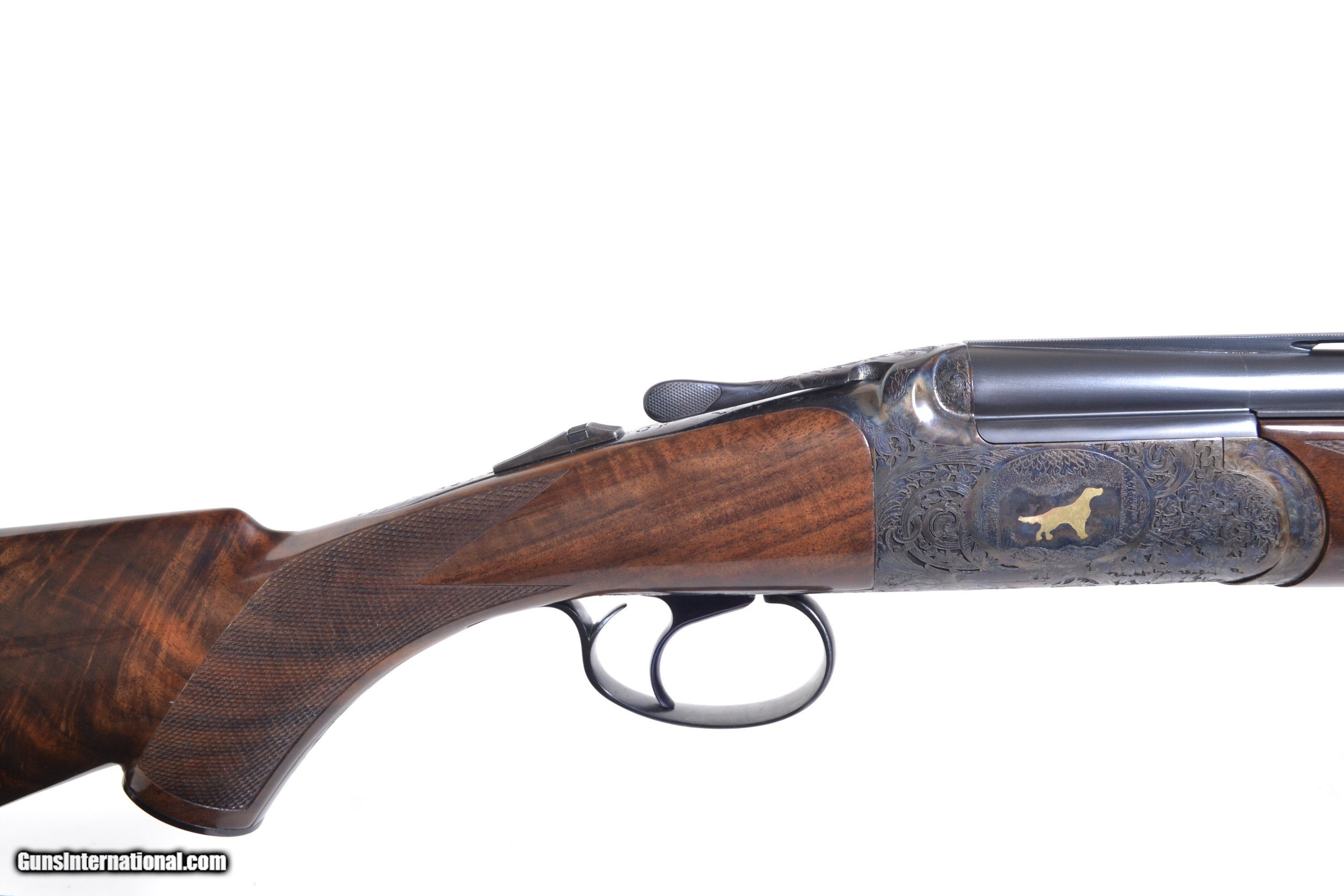 Description: CSMC - Inverness, Deluxe, Round Body, 20ga. 30" Barrels with Screw-in Choke Tubes. Vent rib, long tang capped pistol grip stock with exhibition full feathercrotch American black walnut, beautiful full coverage ornamental engraving with gold inlayed pointer and setter over a bone and charcoal color case hardened finish, screw-in choke tubes, 3” chambers, fire blued single selective trigger, field forend, Truoil finish, thin factory leather covered recoil pad, 100% new gun available for immediate delivery. Base Price - $12,500.00, Options Include: Exhibition American Black Walnut - $900.00, Long Tang Trigger Guard - $700.00, Case Coloring - $500,00, Leather Covered Pad - $500.00, TruOil Finish - $500.00, S & H - $50.00. Inv: 44732 6 lbs. 12 oz. 14 3/8” x 1 3/8” x 2 3/8” $15,650.00 SOLD |