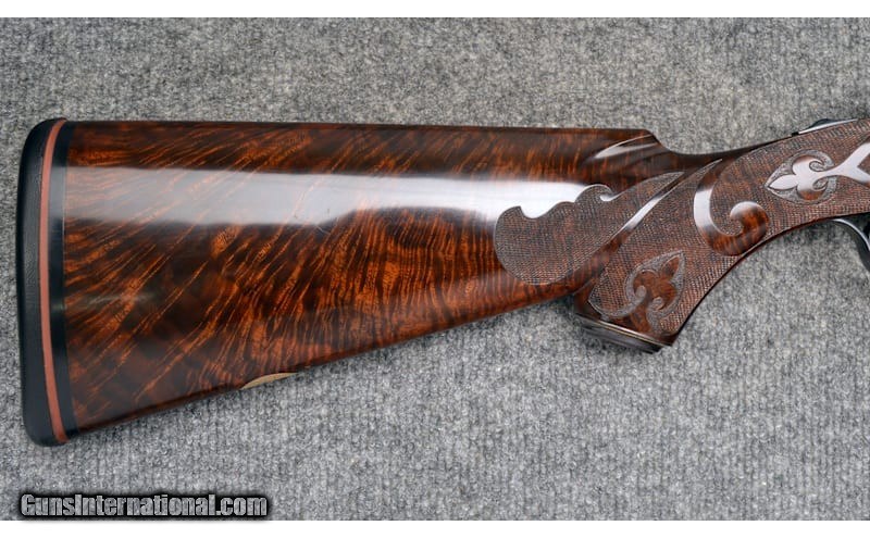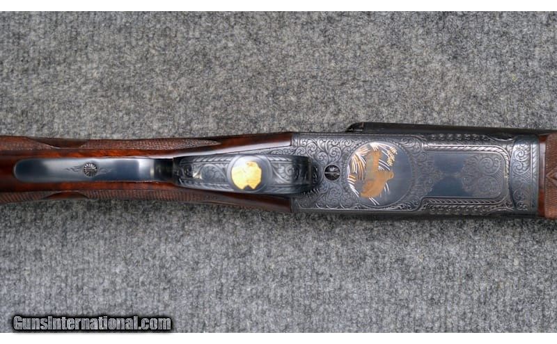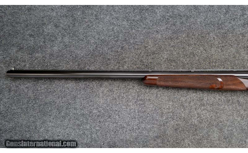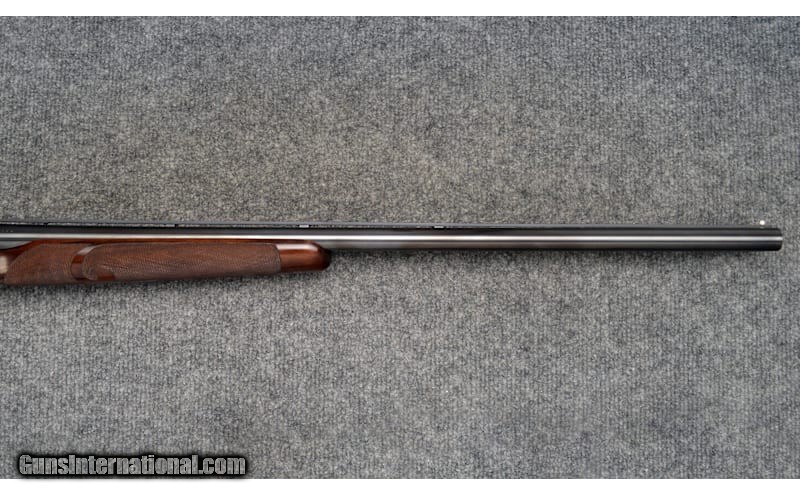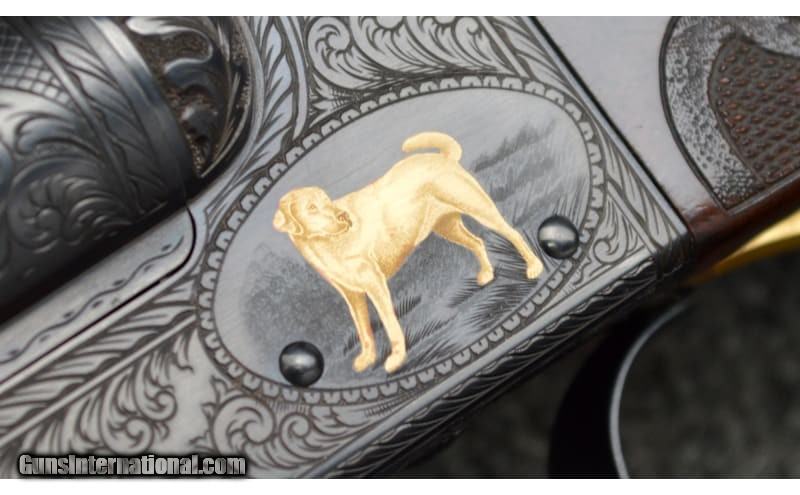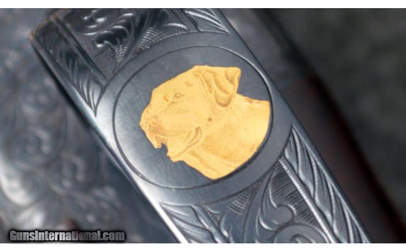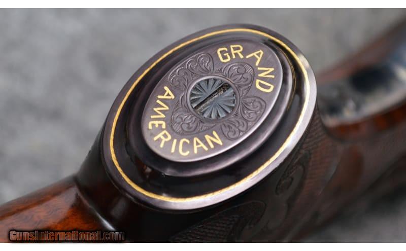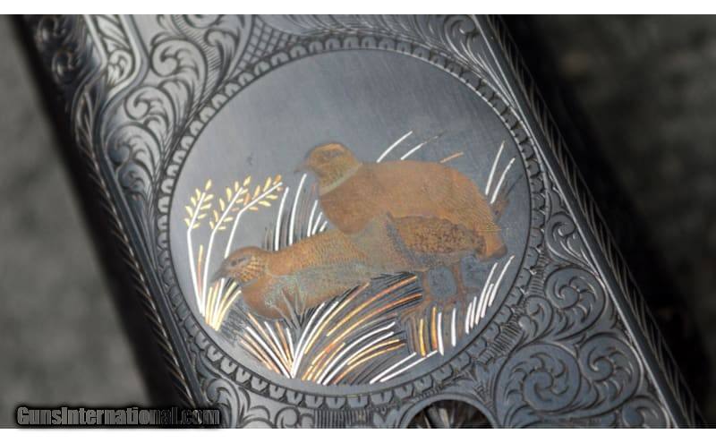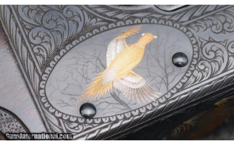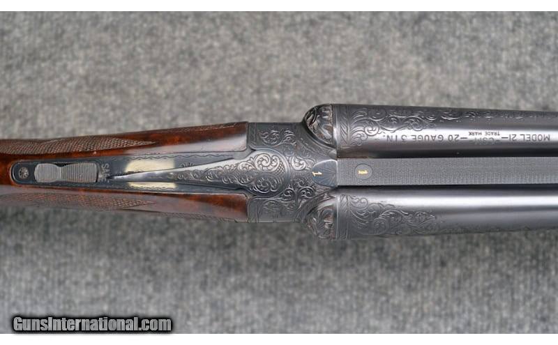 Description: For your consideration, a Connecticut Shotgun Manufacturing Co. model 21 "Grand American" chambered in 20 Gauge. Features include automatic ejectors, an automatic safety, a mechanical trigger with integral selector, and fully jeweled water table and breech face. The AAA fancy full feathercrotch American black walnut furniture is hand checkered with fleur-de-lis insets and is appointed with a leathered rubber pad, steel grip cap with gold inlays, and an ebony tip to the beavertail forearm. The receiver, trigger guard, and chambers are gorgeously engraved with scrollwork and gilded vignettes of Labrador retrievers, pheasant, and partridges. Deeply relieved oak leaves against background stippling decorate the fences. There is an ovoid escutcheon inset along the stock toeline engraved with a previous owner's initials. The 26" barrel is choked Mod, left and IC right, while the 28" is Full, left and Mod right. Stock dimensions are as follows: 14 1/2" LOP, 1 5/8" drop at comb, and 1 7/8" at heel with a slight cast off. 20 Gauge SOLD Chambers: 3 Metal Condition: Excellent Wood Condition: Excellent Bore Condition: Excellent Barrels: 26" / 28 Triggers: "Single, Mechanical Stock Dimensions: 14.5" LOP Fore End: Checkered Butt Pad: Leathered Rubber Weight: 6.25 lbs Sights: White Bead Chokes: See Description Item Location: Hamburg, PA |