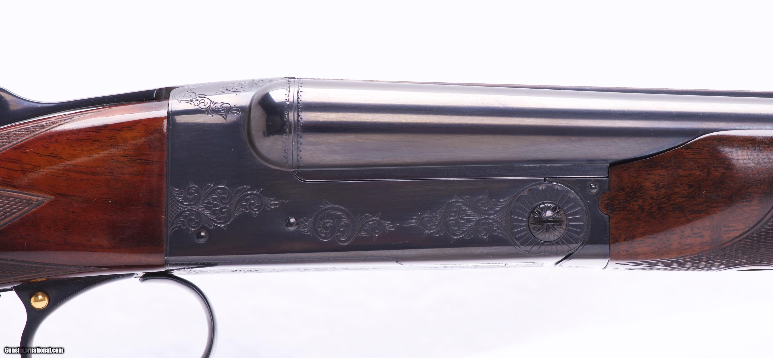 Description: CSMC Model 21 20 gauge SxS shotgun. A 21-1 grade beautiful model 21 built in the classic configuration of straight grip stock, single trigger, beavertail forearm, matted/solid rib and select/finely figured walnut. Where this gun deviates from the norm is that it was special ordered with 29” barrels choked WS-1 & WS-2 which I often nickname “Bird 1 and Bird 2” because these chokes are absolutely ideal for upland bird hunting; also these chokes would work well for sporting clays. Stock dimensions are: 1 ½” DAC, 2 ½” DAH with 15” LOP with a slight right hand cast over a 1” Pachmayr decelerator presentation pad. The gun weighs 7 lbs. 2 oz. and balances at the hinge pin. This is the ultimate, classic American bird gun. SOLD |