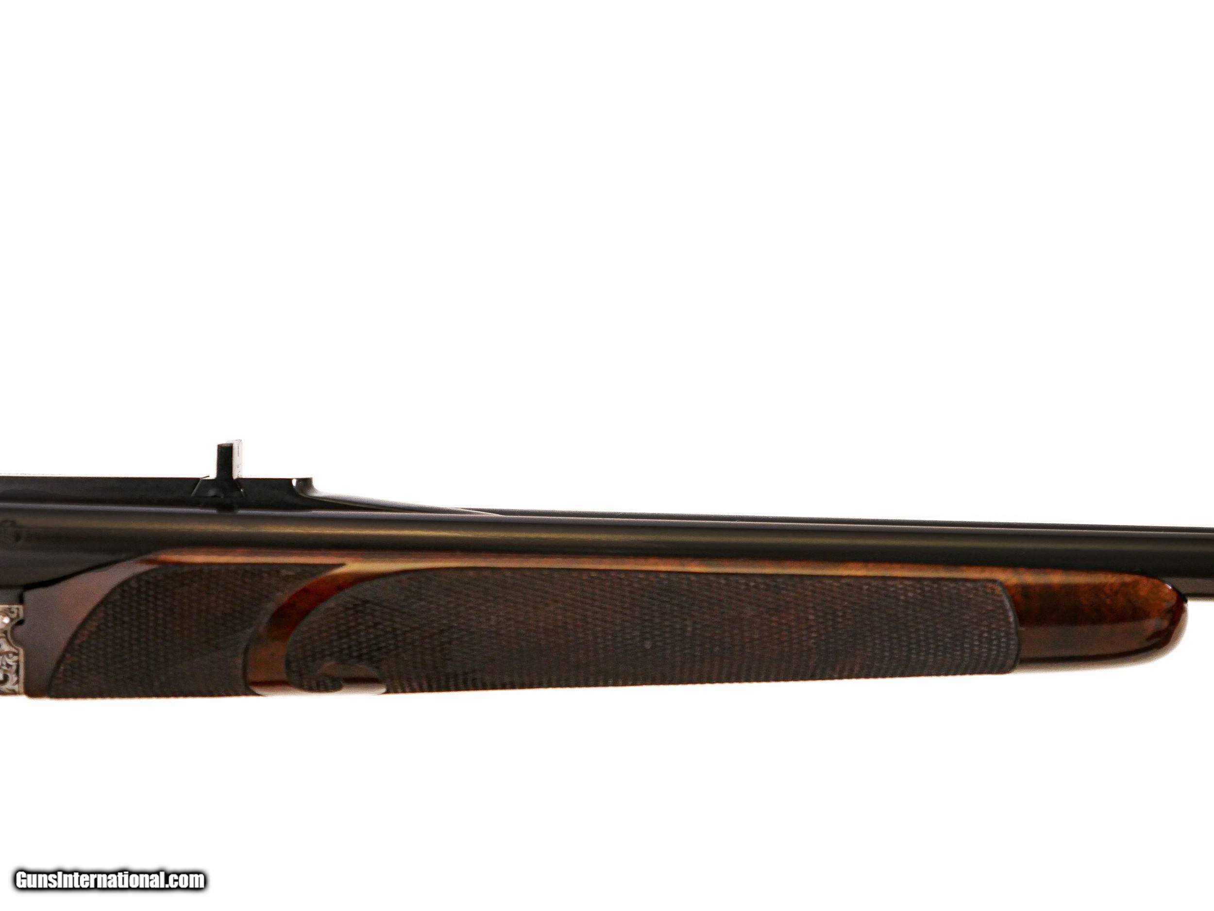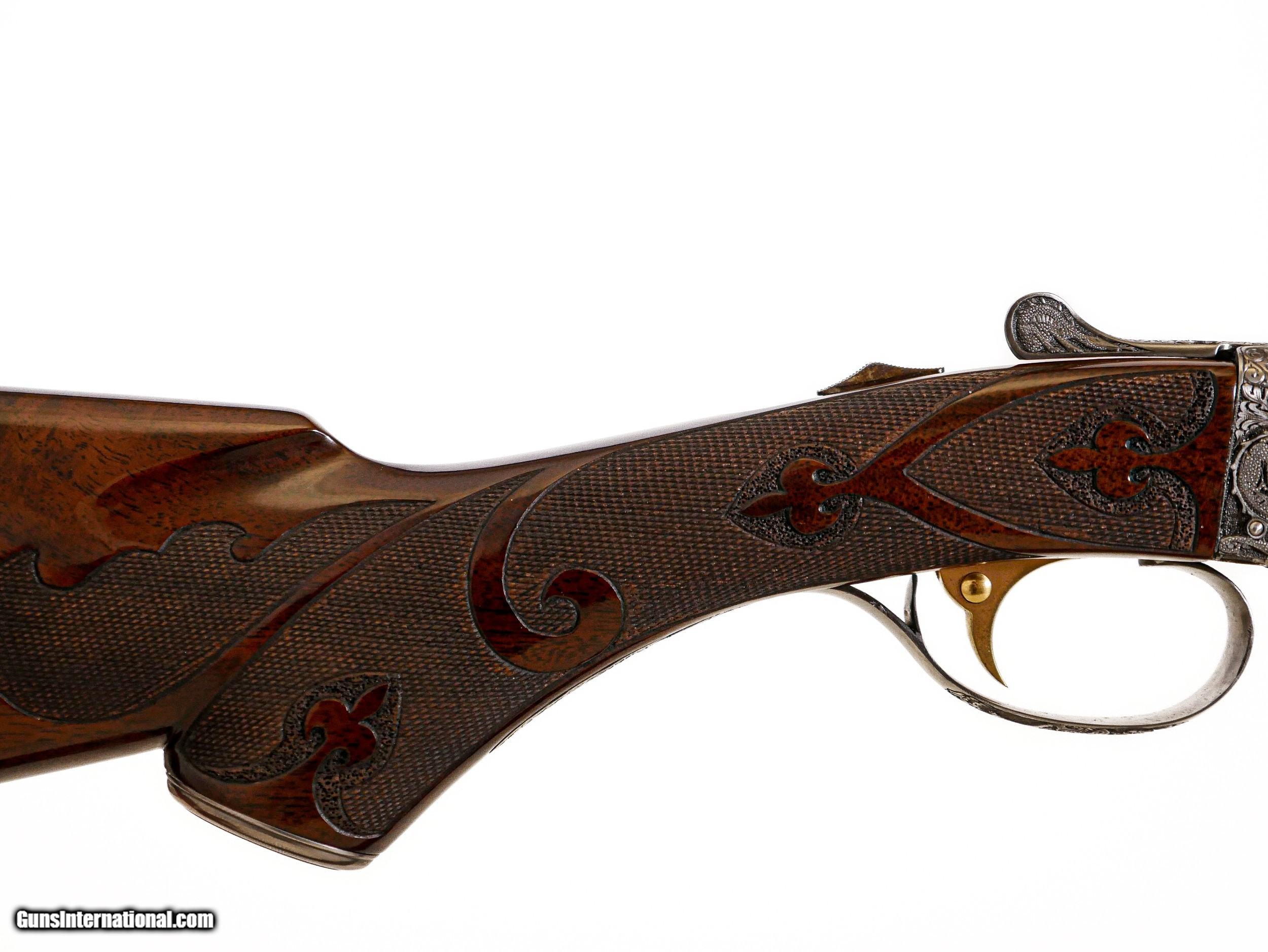 Description: CSMC - Model 21, Baby Frame, Double Rifle, Exhibition Grade, .22 LR. 22" Barrels. The most tiny and diminutive gun ever devised, stunning Winchester cut full feathercrotch American black walnut, metal capped pistol grip walnut, heel and toe plates, gold oval, gold single selective trigger, automatic ejectors, open sights, slender scaled beavertail forend with ebony insert, cheekpiece, B carve checkering, highest possible workmanship throughout made by the master gunsmiths at CSMC, incredible full coverage deep chiseled gargoyle fantasy engraving, stunning gun, available for immediate delivery. Inv: 51924 5 lbs. 2 oz. 14 3/8” LOP Price Upon Request SOLD |