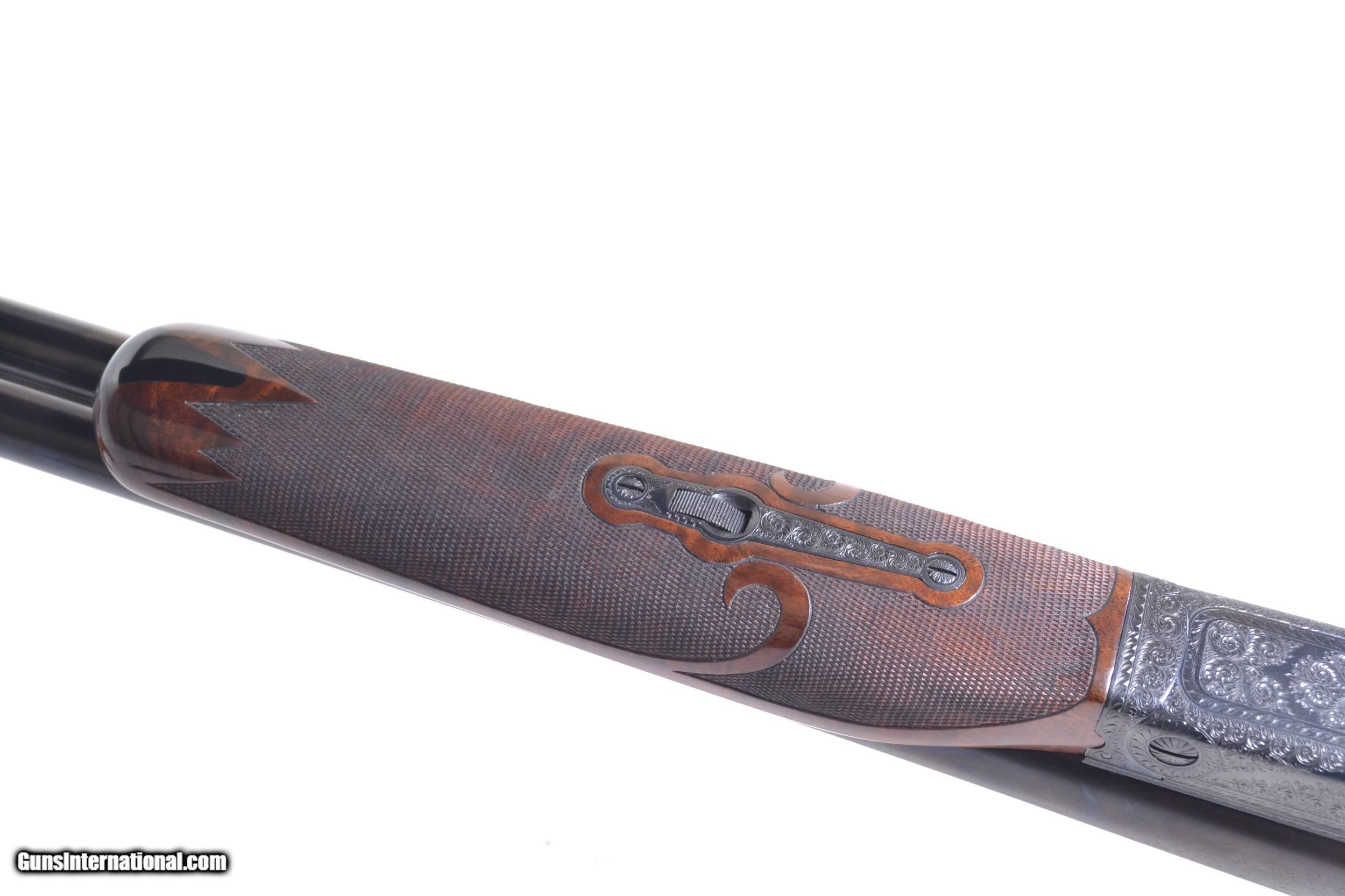 Description: CSMC - Model 21, Grand American, 12ga. 29" Barrels Choked IC/M. Full feathercroth AAA fancy American black walnut metal capped pistol grip stock, Winchester style leather covered pad, A-carve checkering pattern, beavertail forend with ebony insert, gold oval, jeweled flats, gold Grand American script on pistol grip cap, flatside roundframe receiver, double triggers, automatic ejectors, solid matte rib, stunning Grand American engraving pattern with highly detailed gold setters, gold rooster pheasant, and gold rooster pheasant bust surrounded by Grand American scroll pattern engraved by the Master Jim Demunk, this is the very best, gun remains as-new and features a full lifetime warranty, available for immediate delivery. Inv: 44468 7 lbs. 11 oz. 15" X 1 ½" X 2 ½" $19,999.00 SOLD |