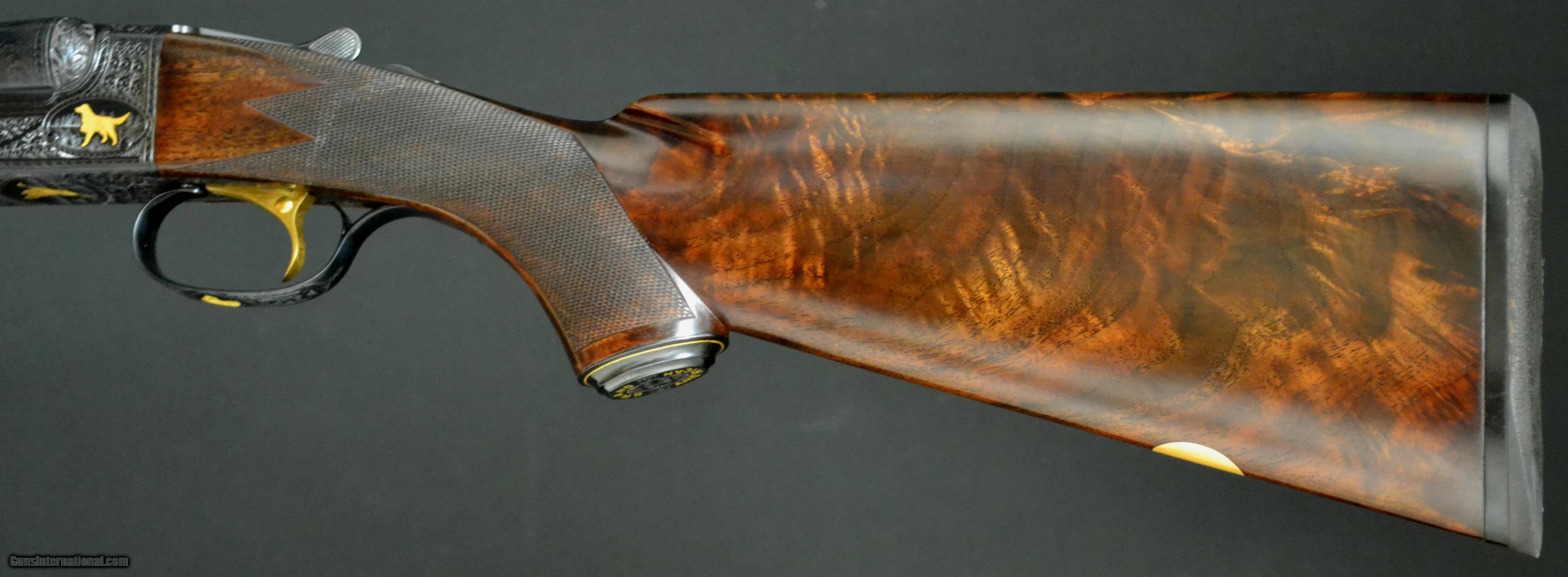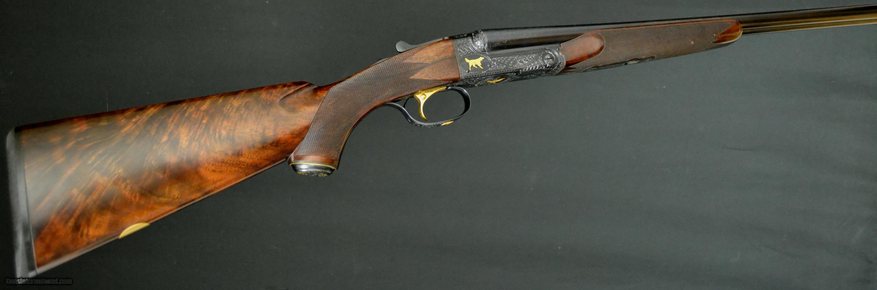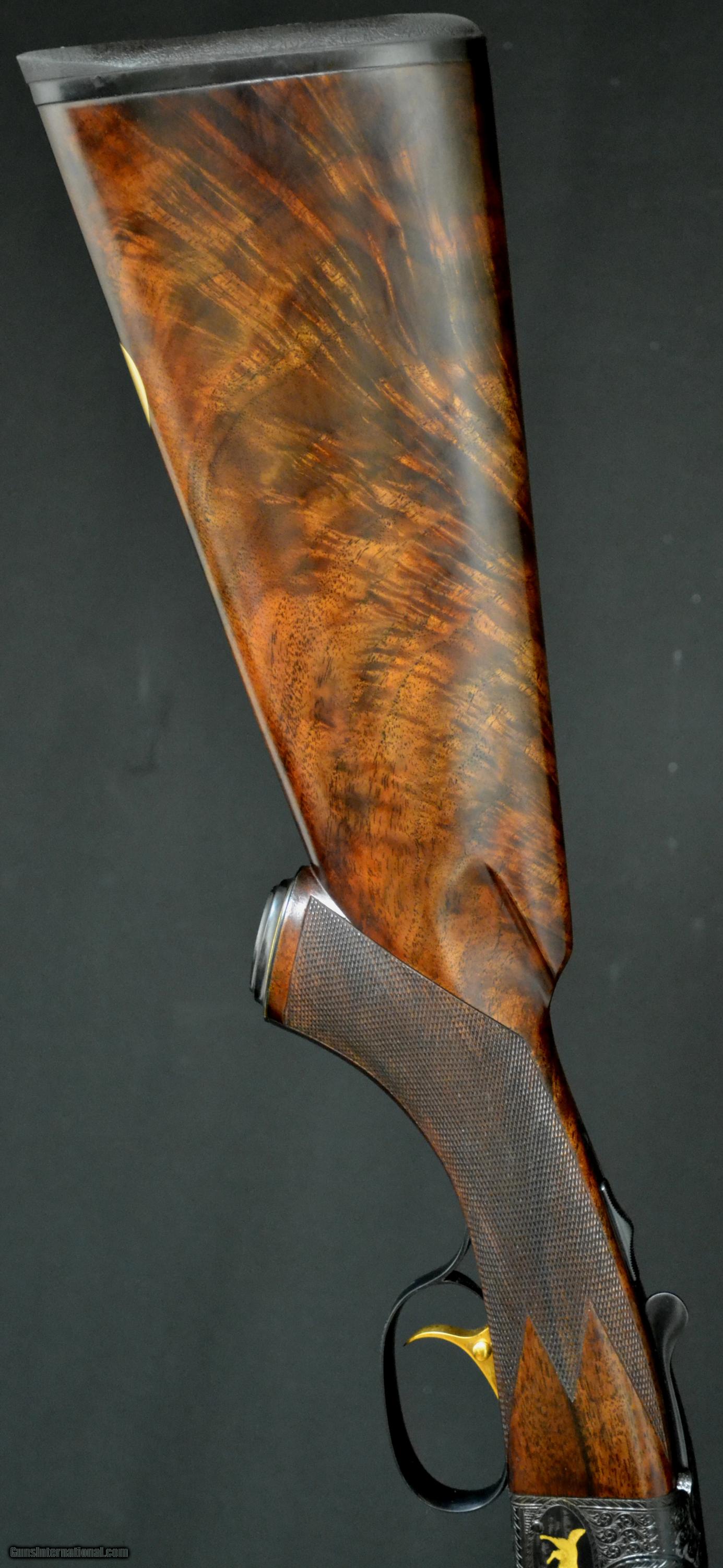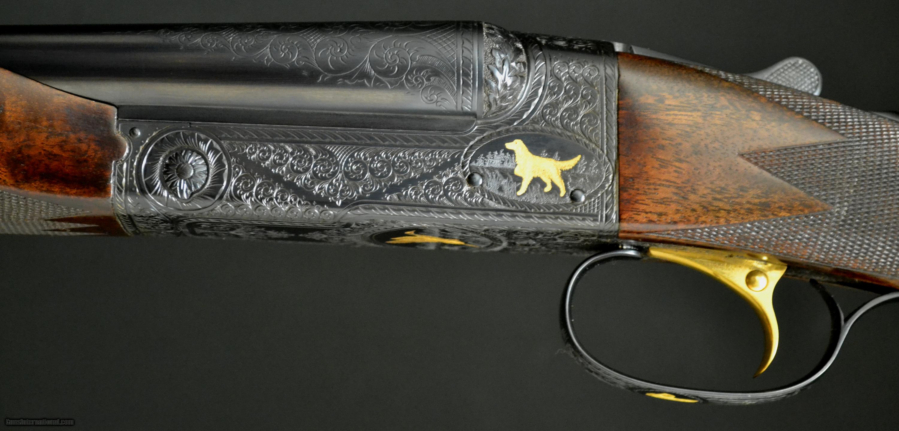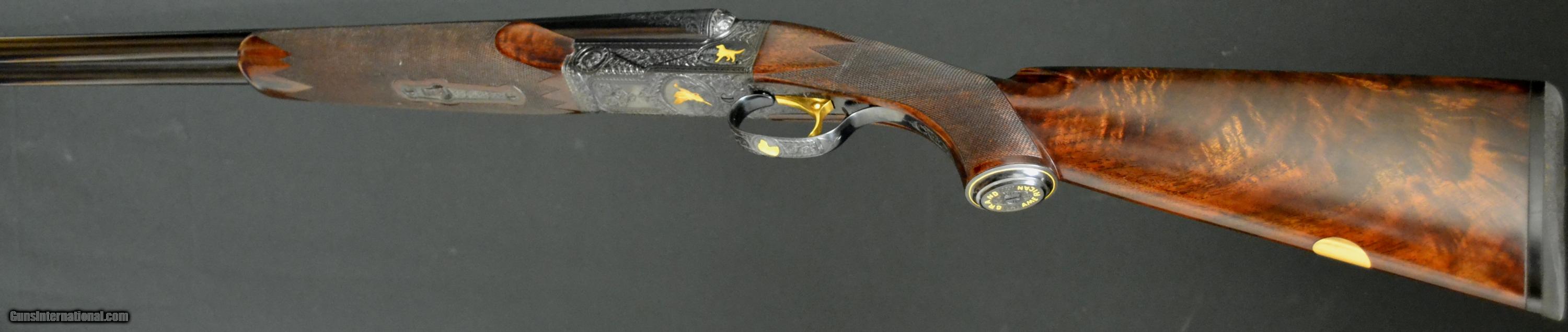 Description: CSMC Model 21, Grand American, 16ga. 29” barrels, choked IM/M. Engraved in the Grand American pattern, with highest quality, lifelike, setters and duck by the world renowned engraver DeMunck. Unused gun, deep checkering, gold oval, gold single trigger, beavertail forend and vent rib. This is one of the finest, most elegant Model 21's we’ve made and has many great features. Inventory # 35117 14" x 1 3/8" x 2 1/4" 7lbs., 6oz. Price - $24,995.00 SOLD |