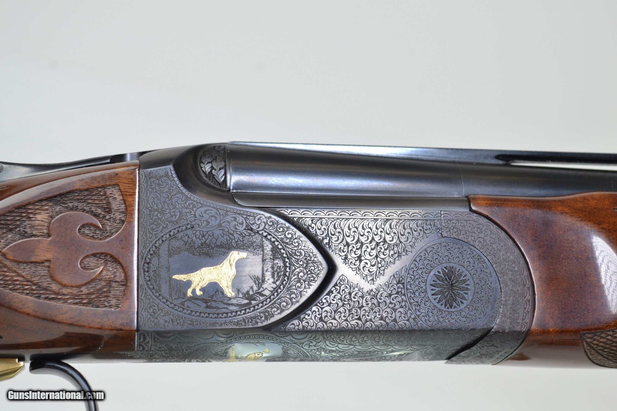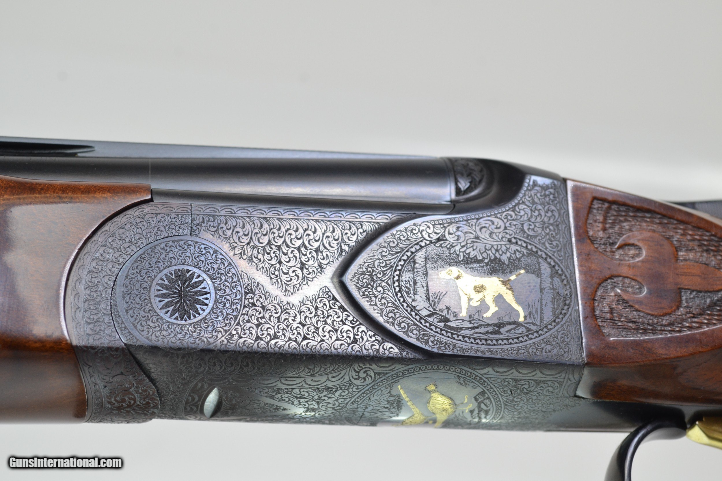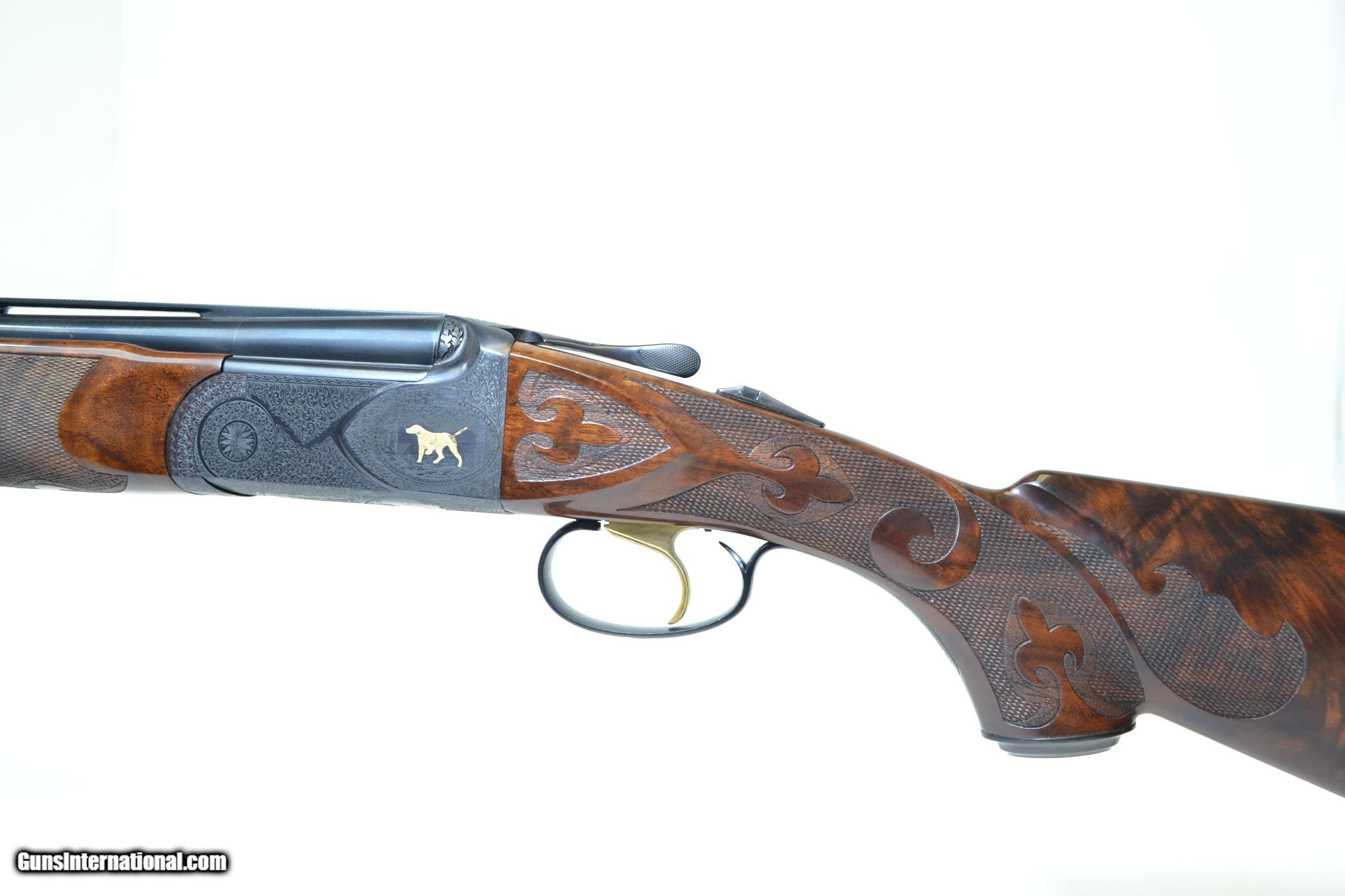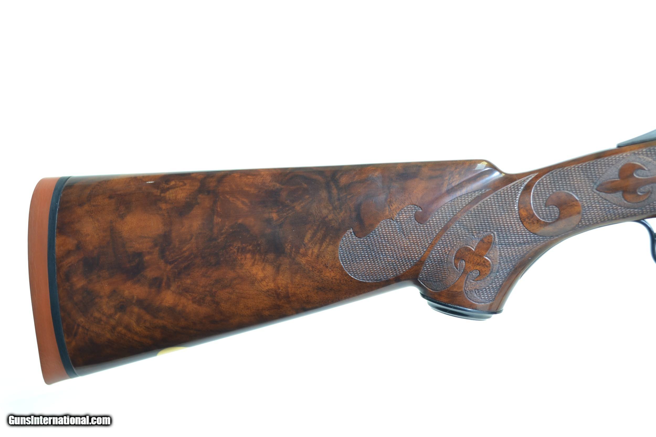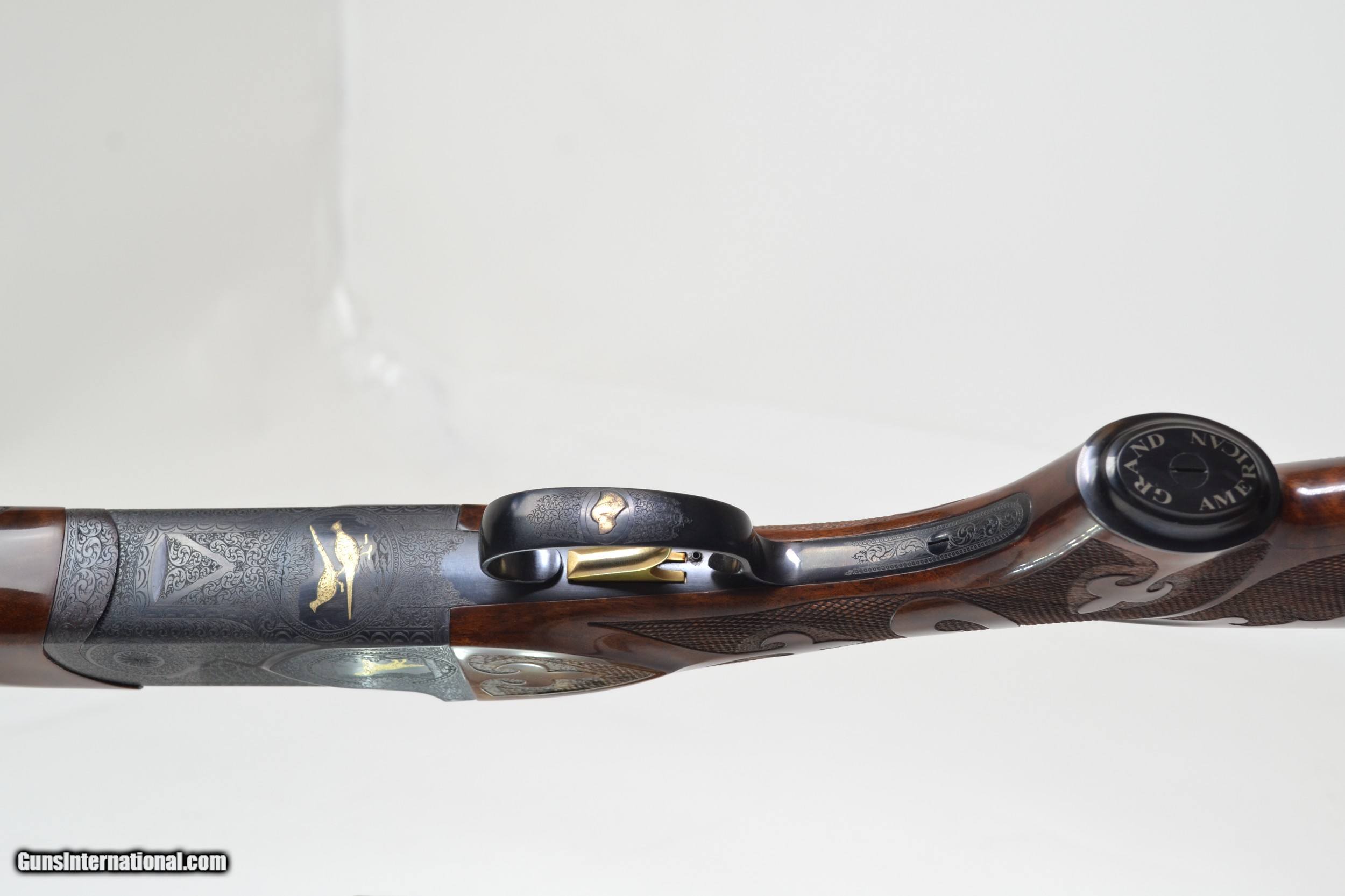 Description: CSMC- Model 21 Grand American O/U 20ga. 30” barrel with choke tubes, full feather crotch exhibition American black walnut, B-carve checkering, pistol grip stock with Grand American engraved in gold on grip cap, single selective trigger, vent rib, automatic ejectors, automatic safety, Winchester recoil pad, Tru-Oil finish, the engraving features a classic Grand American pattern with a pointer on one side a setter on the other and pheasants on the bottom of the receiver, available for immediate delivery, Base Price- $12,500.00, options include- Tru-Oil- $500.00, S&H- $50.00, available for immediate delivery. Inv# 44482 6lbs. 7oz. 14 3/8” x 1 ½” x 2 ¼” $13,000.00 SOLD |