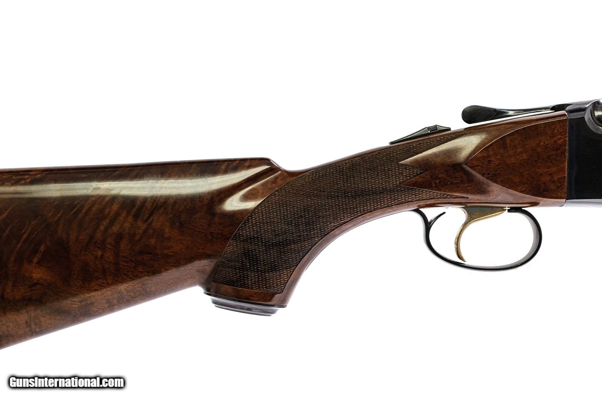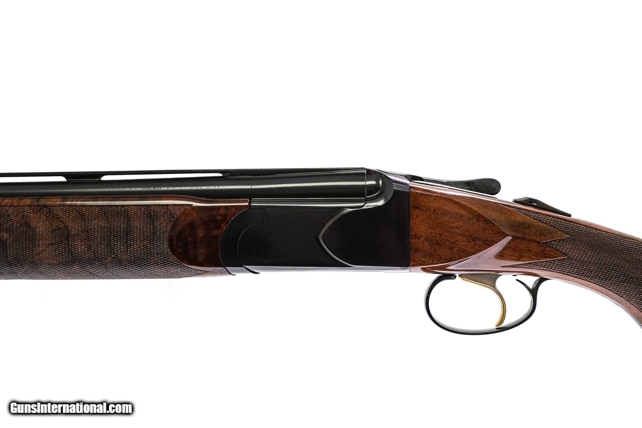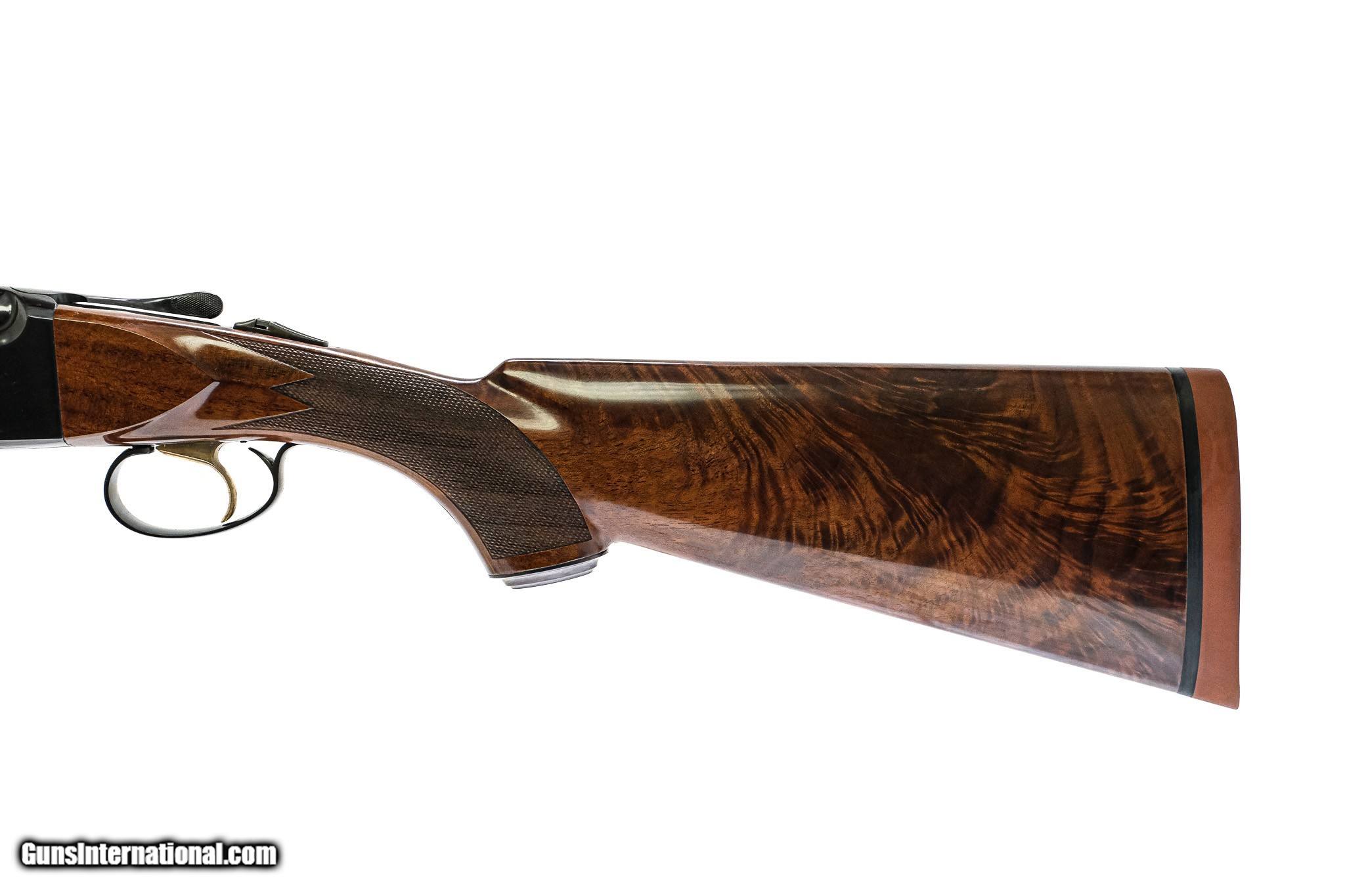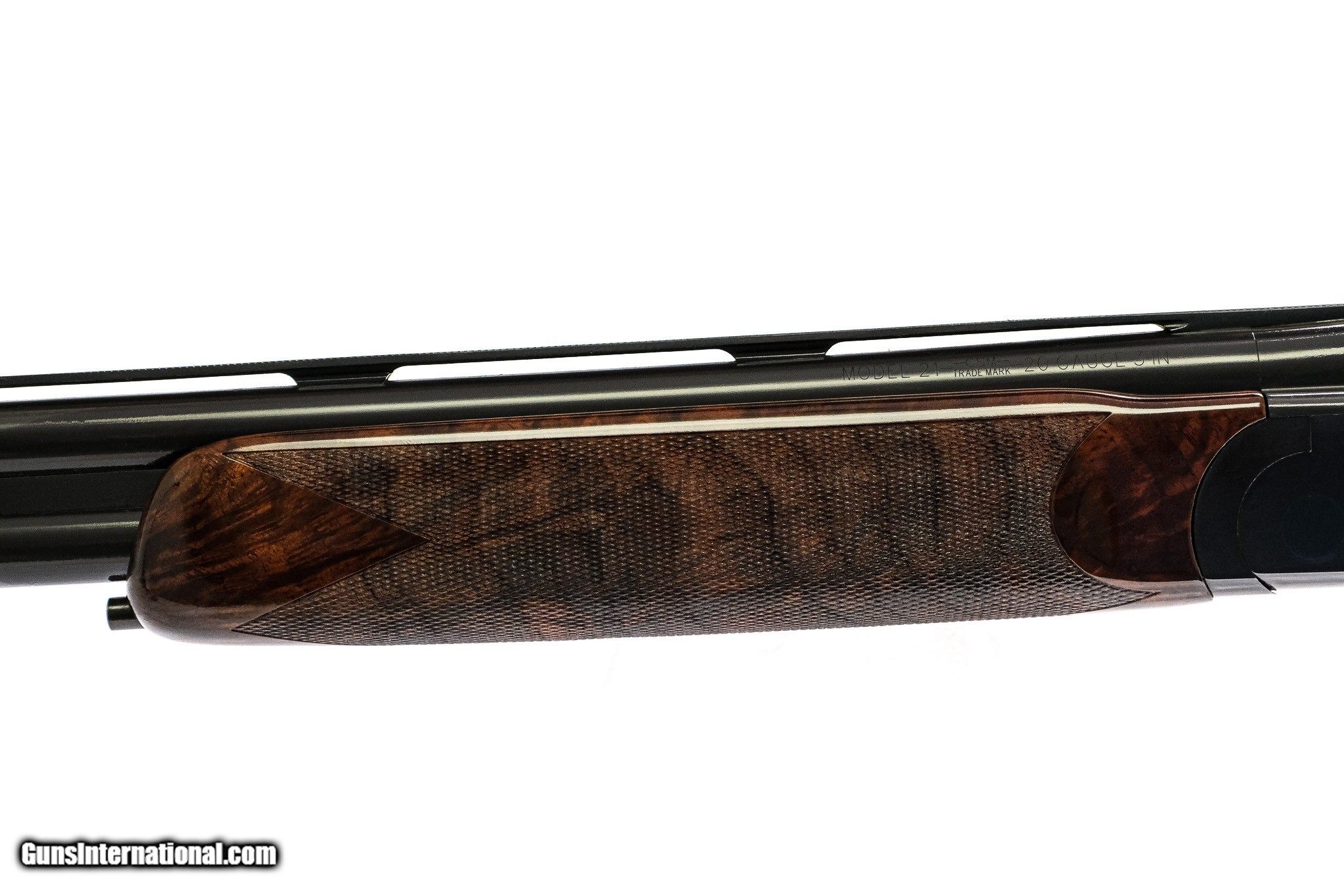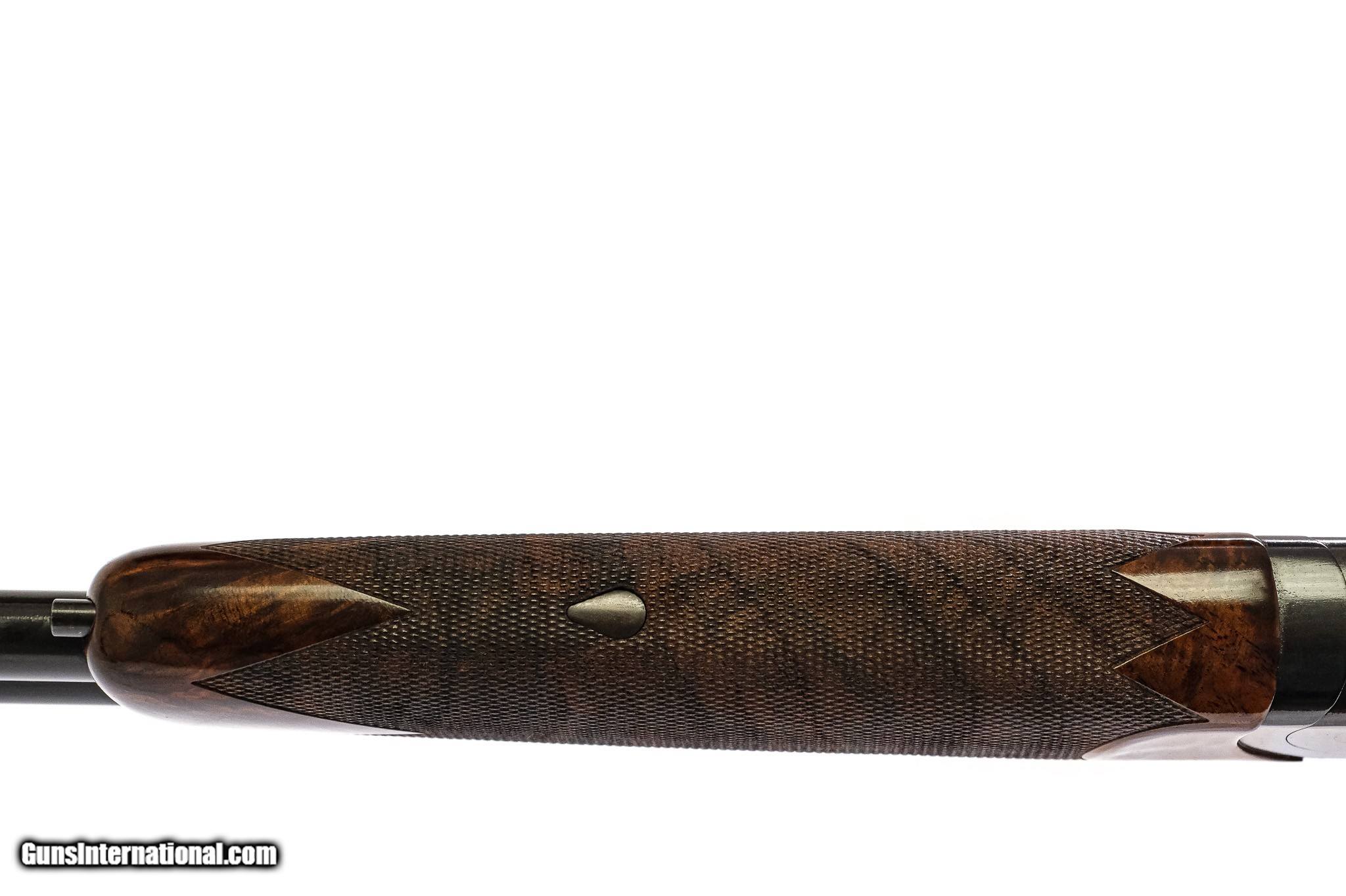 Description: CSMC - Model 21, O/U, Custom Grade, 20ga. 28" Barrels with Screw-in Choke Tubes. Stunning full feathercrotch American black walnut, metal capped pistol grip stock with deluxe checkering, single trigger, vent rib, TruOil finish, automatic ejectors, automatic safety, Winchester recoil pad, a wonderful chance to own the Model 21. Ready for immediate delivery. Inv: 34886 6 lbs. 6 oz. 14 3/8" x 1 1/2" x 2" $5,395.00 SOLD |