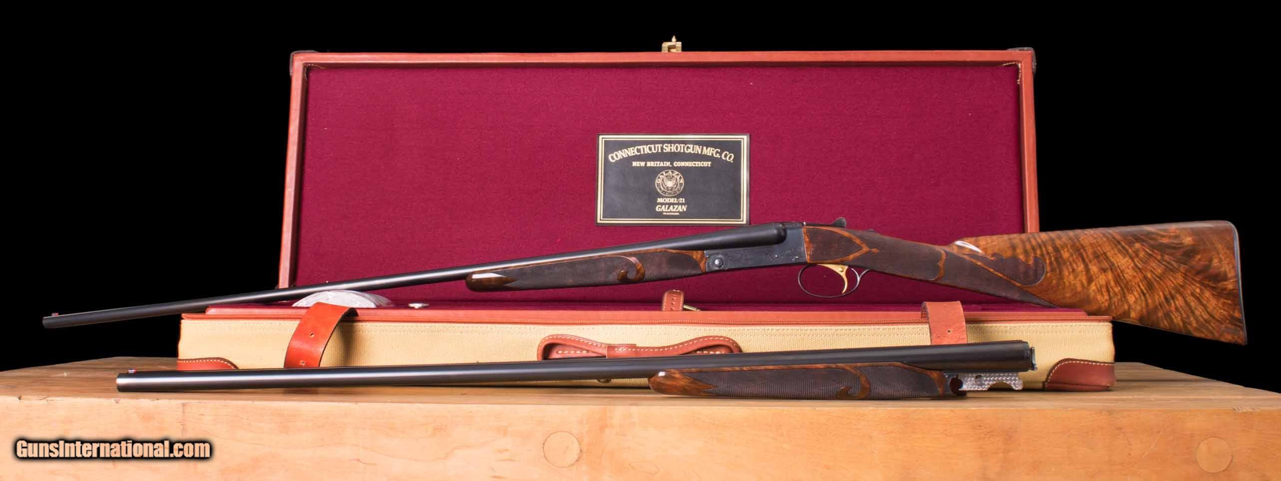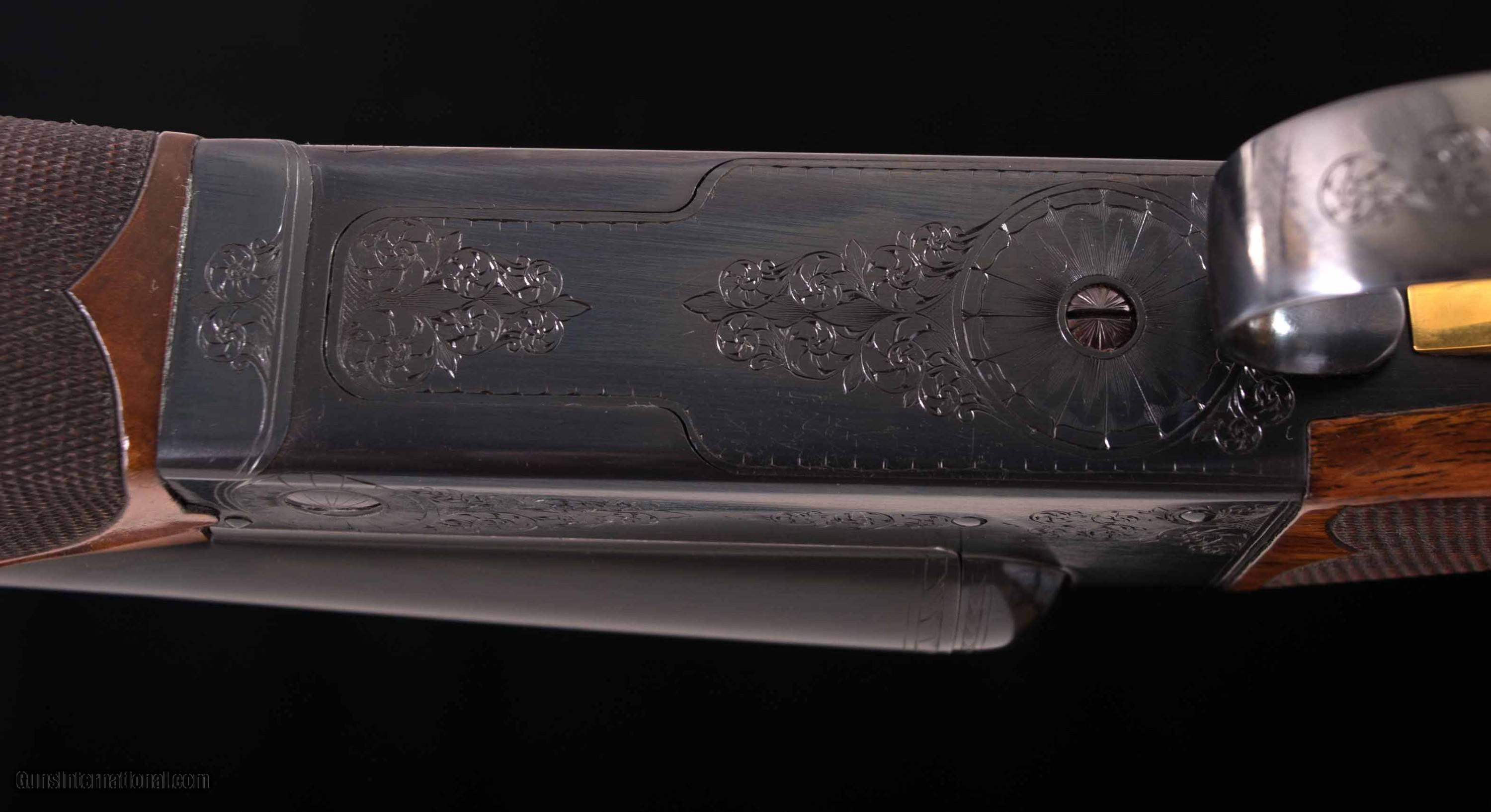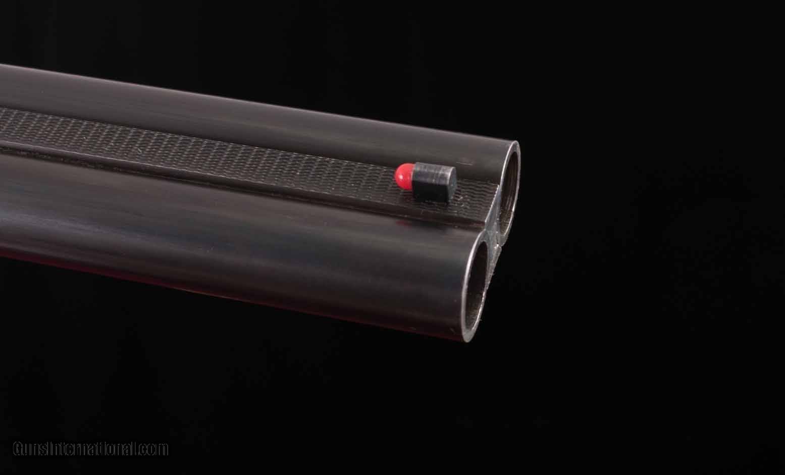 Description: CSMC Model 21 Baby Frame 28 gauge, .410 Bore, Choked Skeet In /Skeet Out, LOP 15", DAH 2 1/4", DAC 1 1/2” This CSMC Model 21, snW38736, is a spectacular example of a Galazan Baby Frame Model 21. Purpose built as an elegant sub-gauge Skeet set, you can easily transform this gun into the perfect Upland hunter with a flick of the selective trigger. This gun shows As New with not a mark nor any sign of wear. The wood is spectacular, the wood-to-metal fit, checkering, mechanics… are all perfect. Custom ordered with 30” 28ga. and 30” .410 barrel, each with their own Hessian style “slim” beavertail forend. Simple but elegant #1 engraving. “A” carved fancy checkering on the exhibition American Black Walnut flame-figured stock ending with a skeleton butt plate. Ribbons intertwined in the forend checkering with an ebony tip. There is jeweling throughout the water table, standing breech, barrel flats, and forend iron. The extra cost options on this gun include a second barrel set (with forend), Exhibition wood, “A" carving, skeletal butt plate, leather case with accessories and canvas cover. If you were to order this gun today it would exceed $37K with a wait time of over 1 year. Discounted 33%, $25,499.00 shipped insured to your FFL. More photos on request Barrel Length: 30" both sets Weight: 28 Gauge 5lbs 13 oz, .410 6 lb Chokes: 28 gauge .003/.007 SK/IC .410 .005/.011 IC/M Bores: perfect mirror Bore Diameter: .551/.551, .406/.407 Wall Thickness: .028/.029 % Blue: 100% Chambers: 2 3/4”, 3" Ribs: tight Sights: single middle, red Bradley front Action Action: tight, lever way right of center Ejectors: strong, timed Case Color: receiver blue 100% factory Screws: perfect Engraving: clear sharp embellished No. 1 pattern Trigger Type: single selective trigger, crisp Stock Type: English stock / Hessian beavertail forends, Exhibition Black Walnut; Tru oil finish LOP: 15" DAH: 2 1/4" DAC: 1 1/2" Cast: 0 Checkering Condition: “A” carved, 28 lines per inch Butt Treatment: skeletal butt plate SOLD |