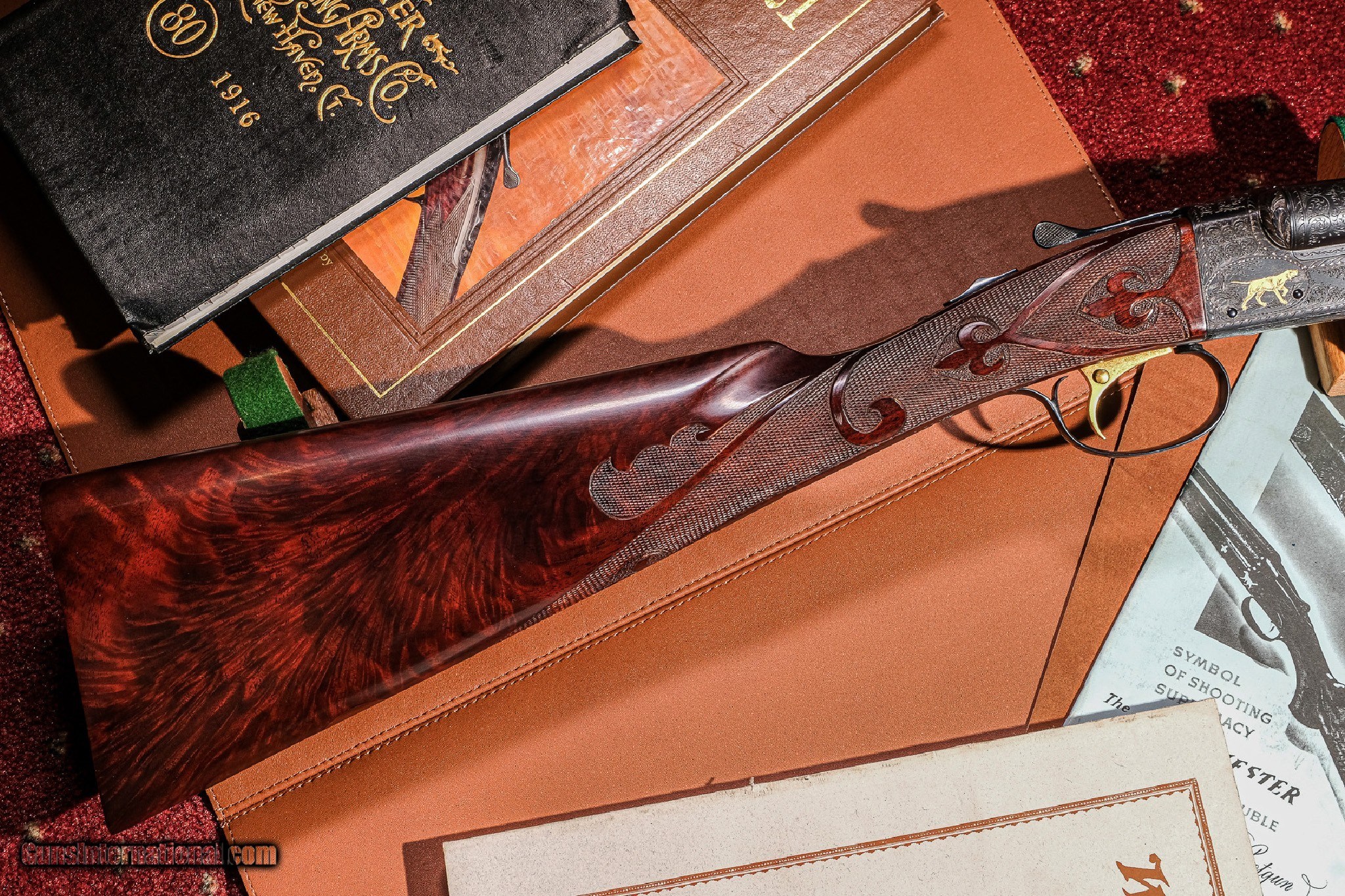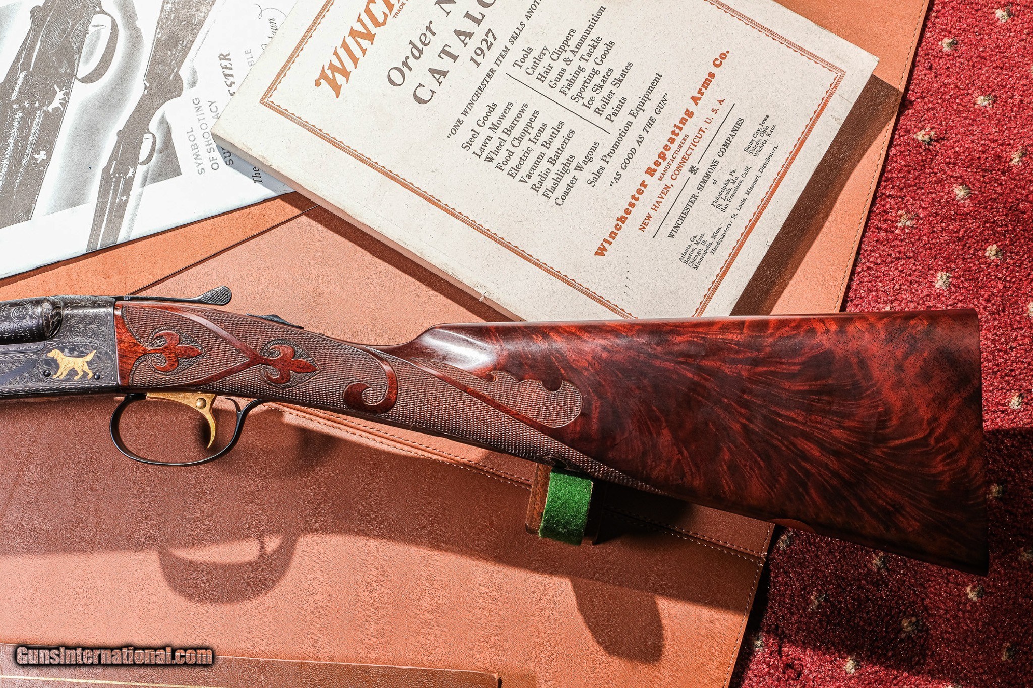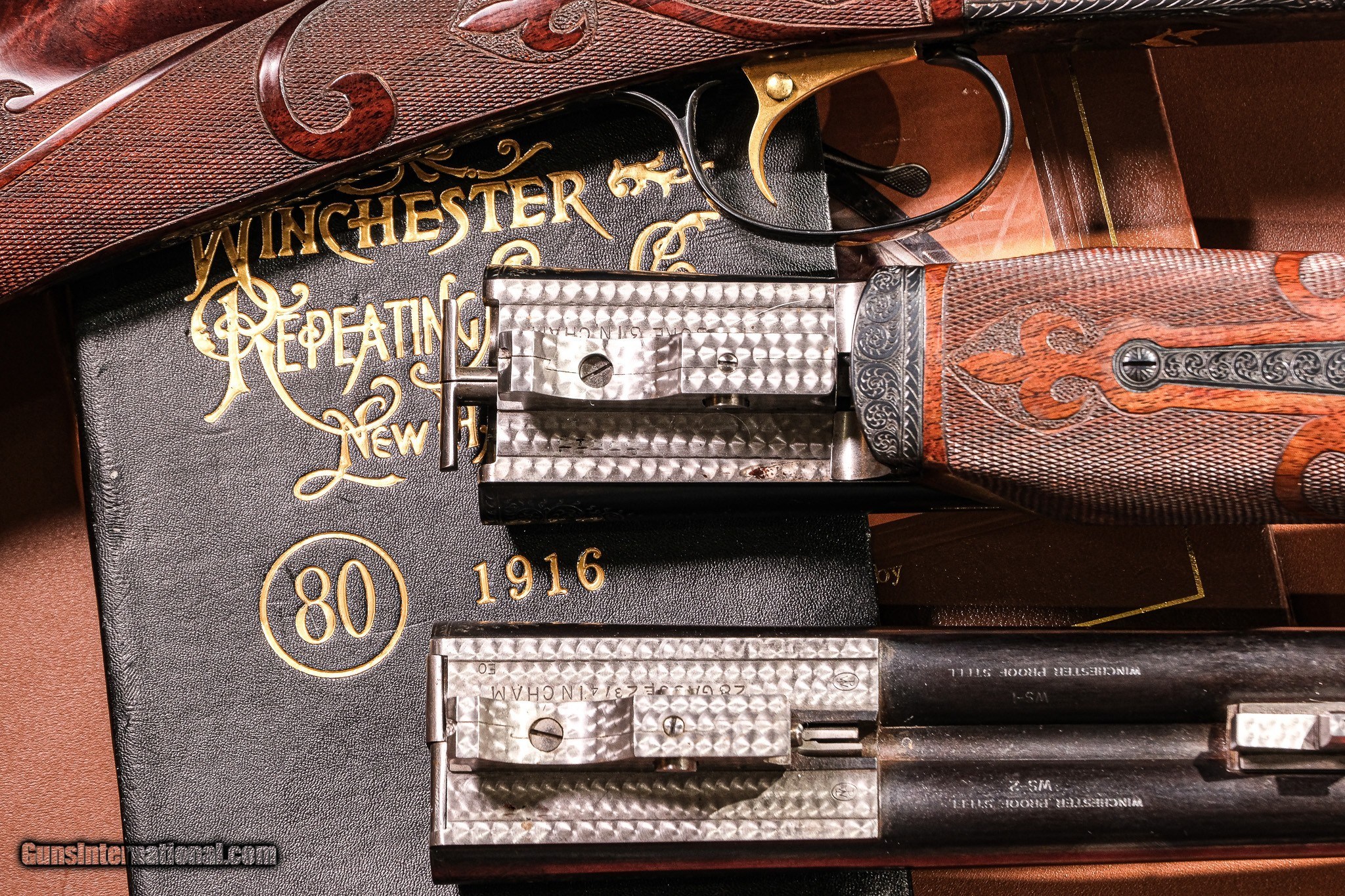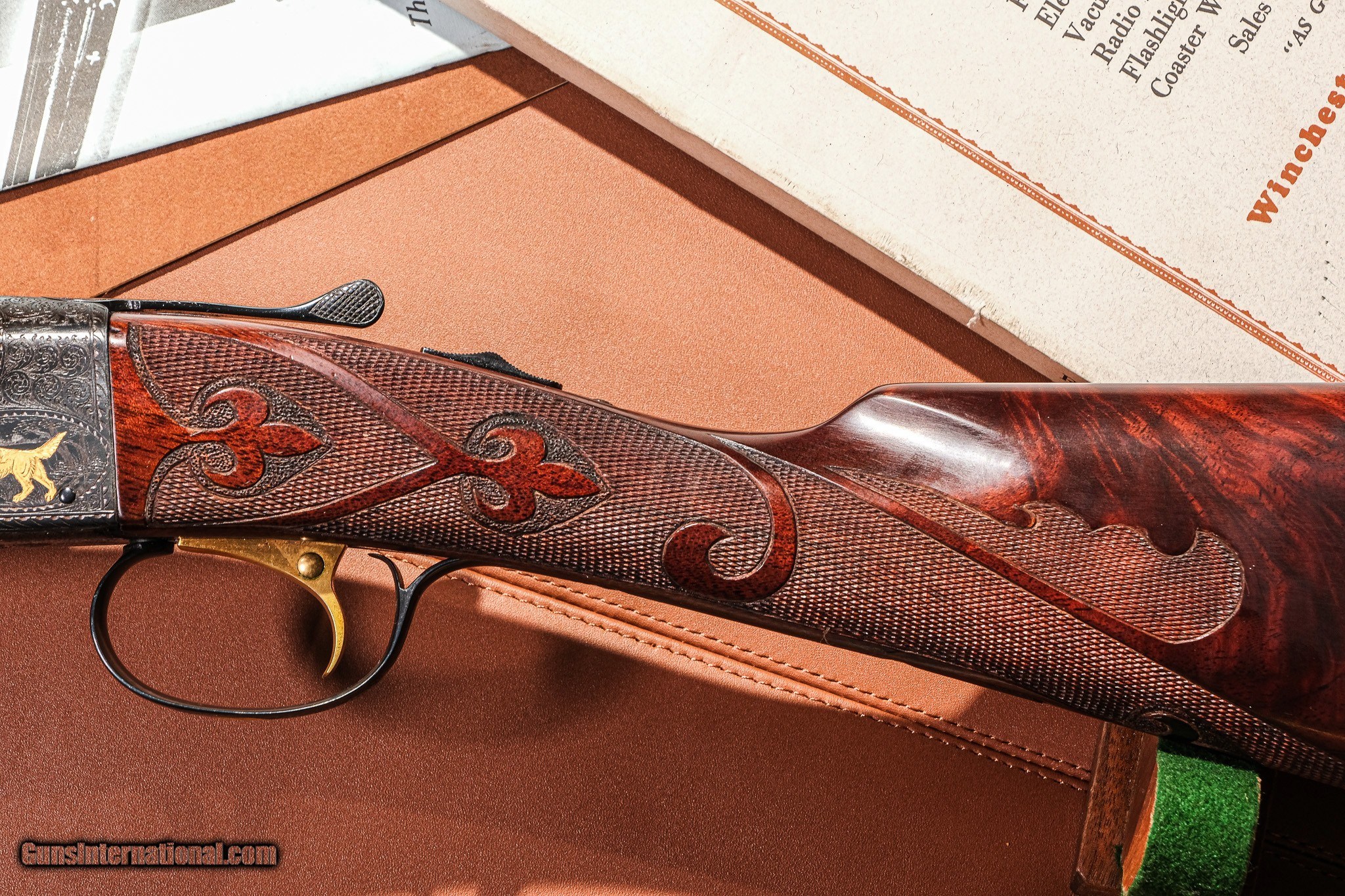 1st set of barrels, 20ga. 26” matted rib barrel, marked custom built by Winchester and choked WS1/WS2. Second set, 28ga. 26” matted rib barrel, marked custom built by Winchester and choked WS1/WS2. Third barrel. 410 26” matted rib barrel, marked custom built by Winchester and choked WS1/WS2. B carved stock, two forends. Jeweled water table, barrel flats, and forend iron. Engraving performed by Nick Kusmit. Straight grip, checkered butt. Heavily figured feather crotch. Ebony forend tips, perfect checkering. Gun is brand new and appears unfired. We believe this gun was sent back and upgraded by Winchester. We serviced this gun over twenty years ago and it is just an outstanding piece of craftsmanship. Warrantied for life to the original owner courtesy of Connecticut Shotgun.