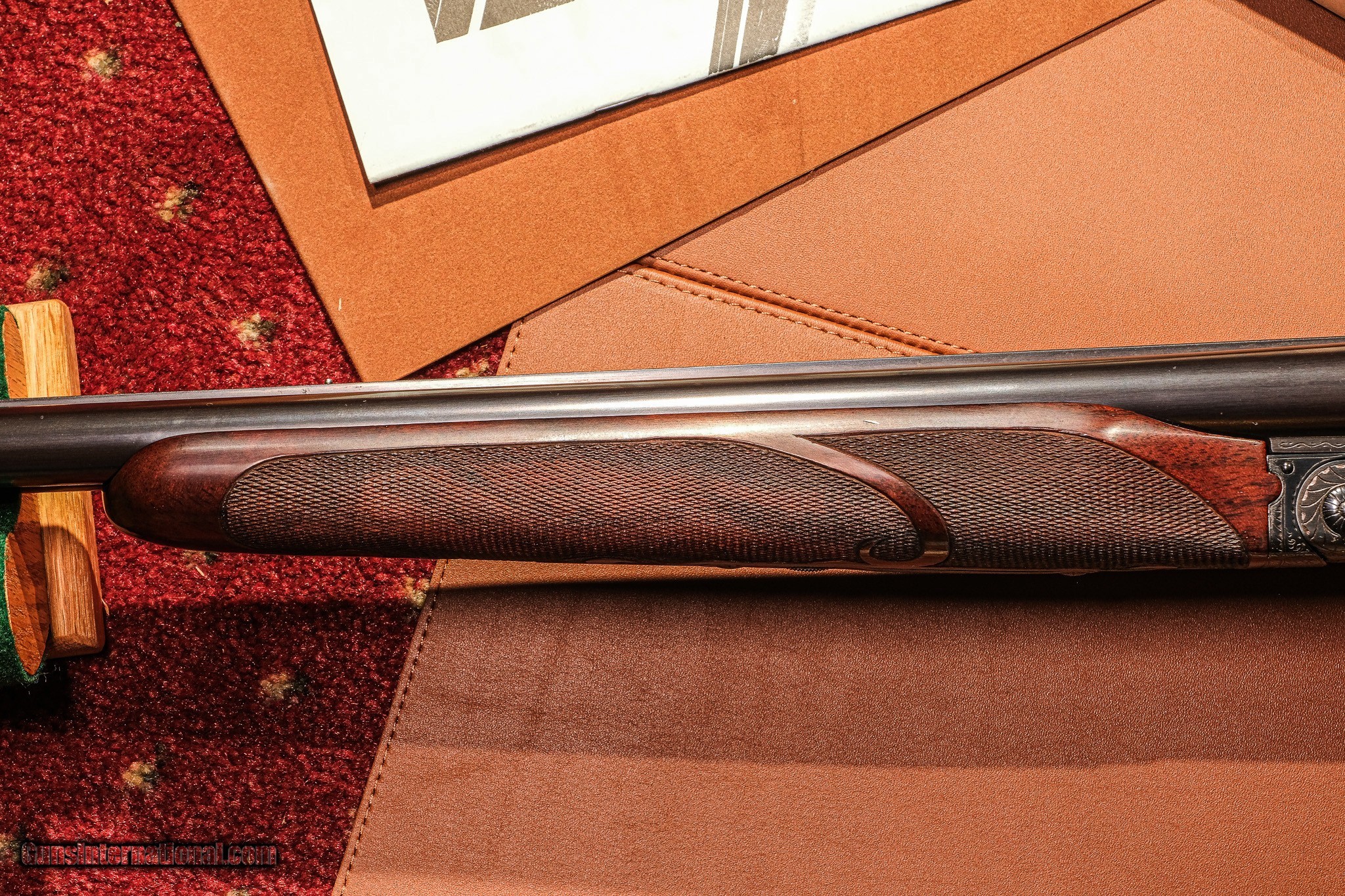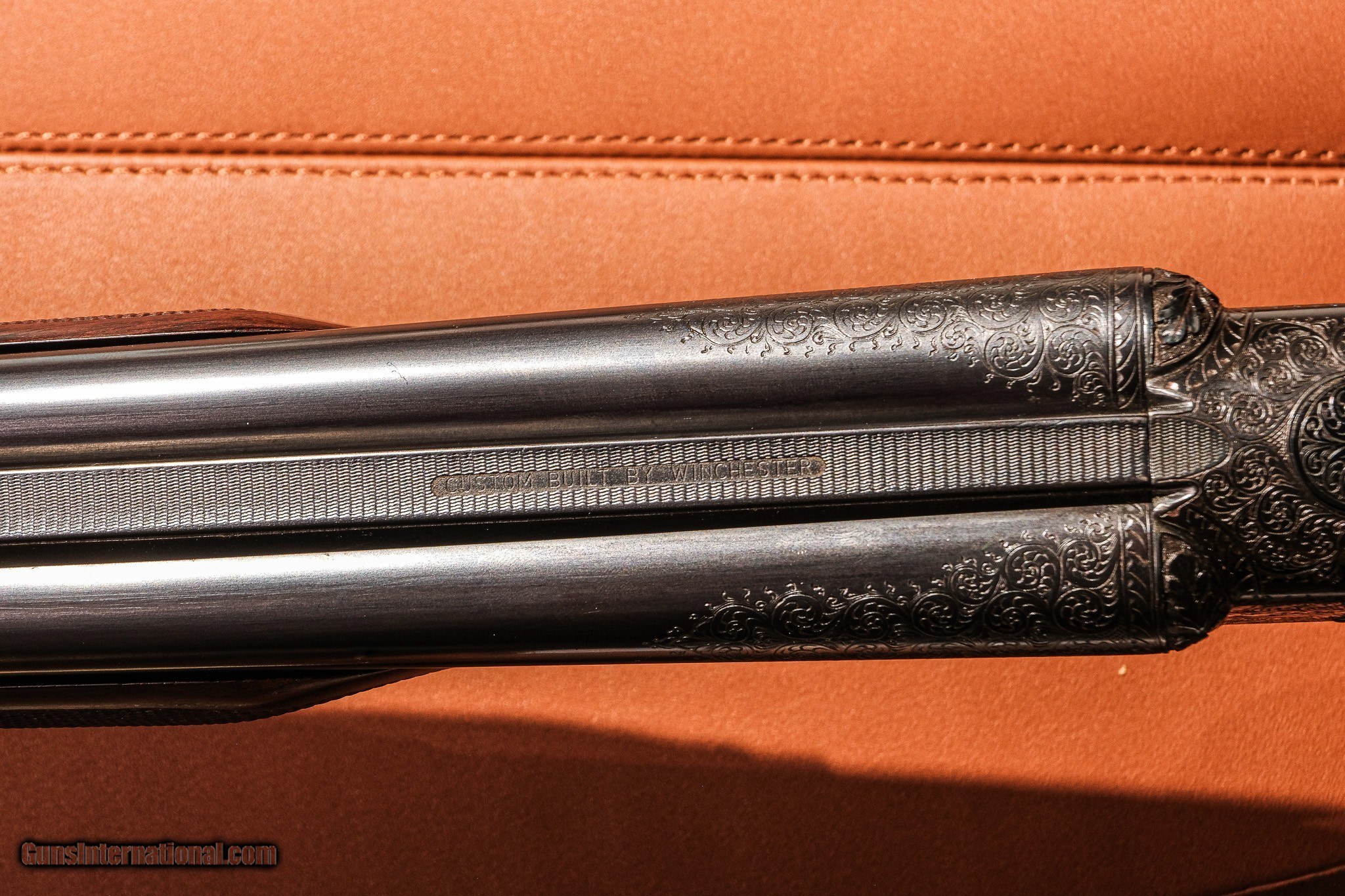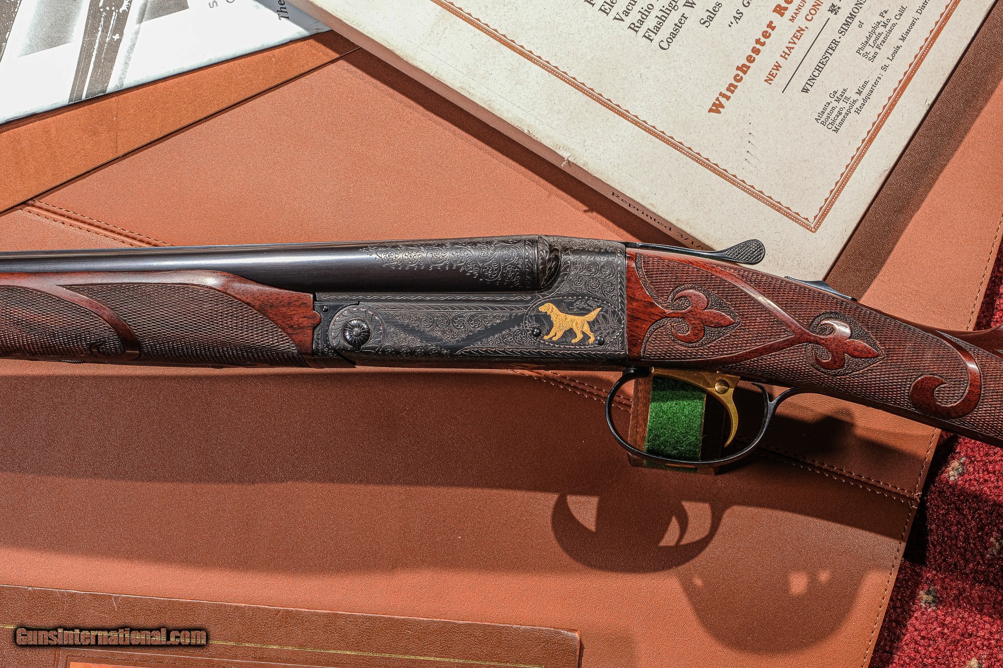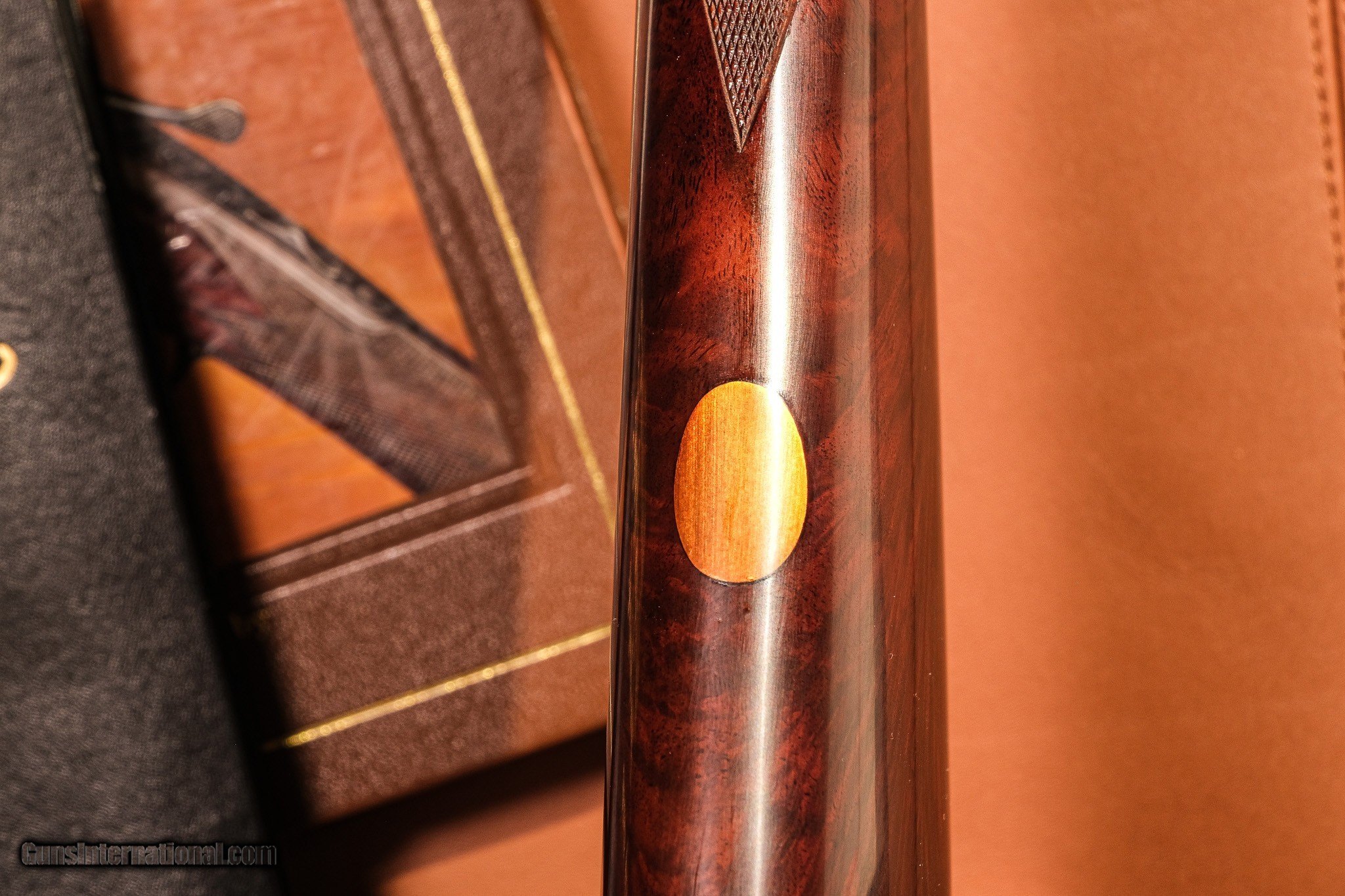 1st set of barrels, 20ga. 26” matted rib barrel, marked custom built by Winchester and choked WS1/WS2. Second set, 28ga. 26” matted rib barrel, marked custom built by Winchester and choked WS1/WS2. Third barrel. 410 26” matted rib barrel, marked custom built by Winchester and choked WS1/WS2. B carved stock, two forends. Jeweled water table, barrel flats, and forend iron. Engraving performed by Nick Kusmit. Straight grip, checkered butt. Heavily figured feather crotch. Ebony forend tips, perfect checkering. Gun is brand new and appears unfired. We believe this gun was sent back and upgraded by Winchester. We serviced this gun over twenty years ago and it is just an outstanding piece of craftsmanship. Warrantied for life to the original owner courtesy of Connecticut Shotgun.