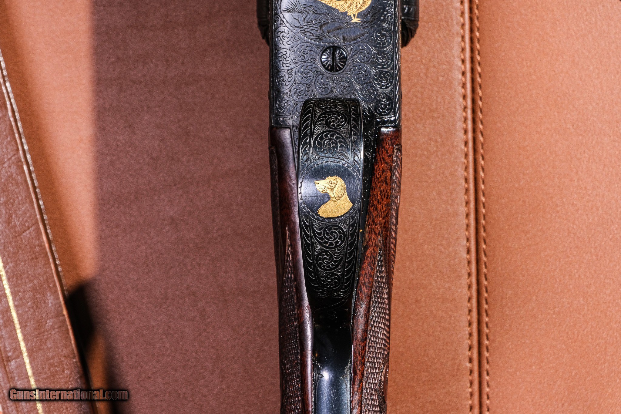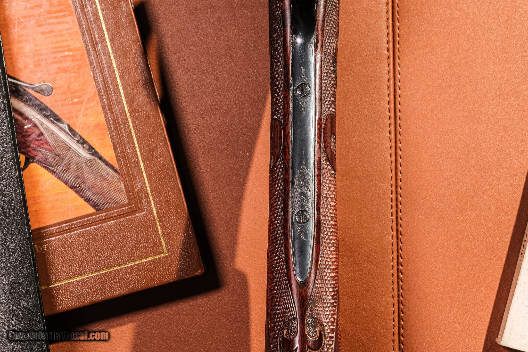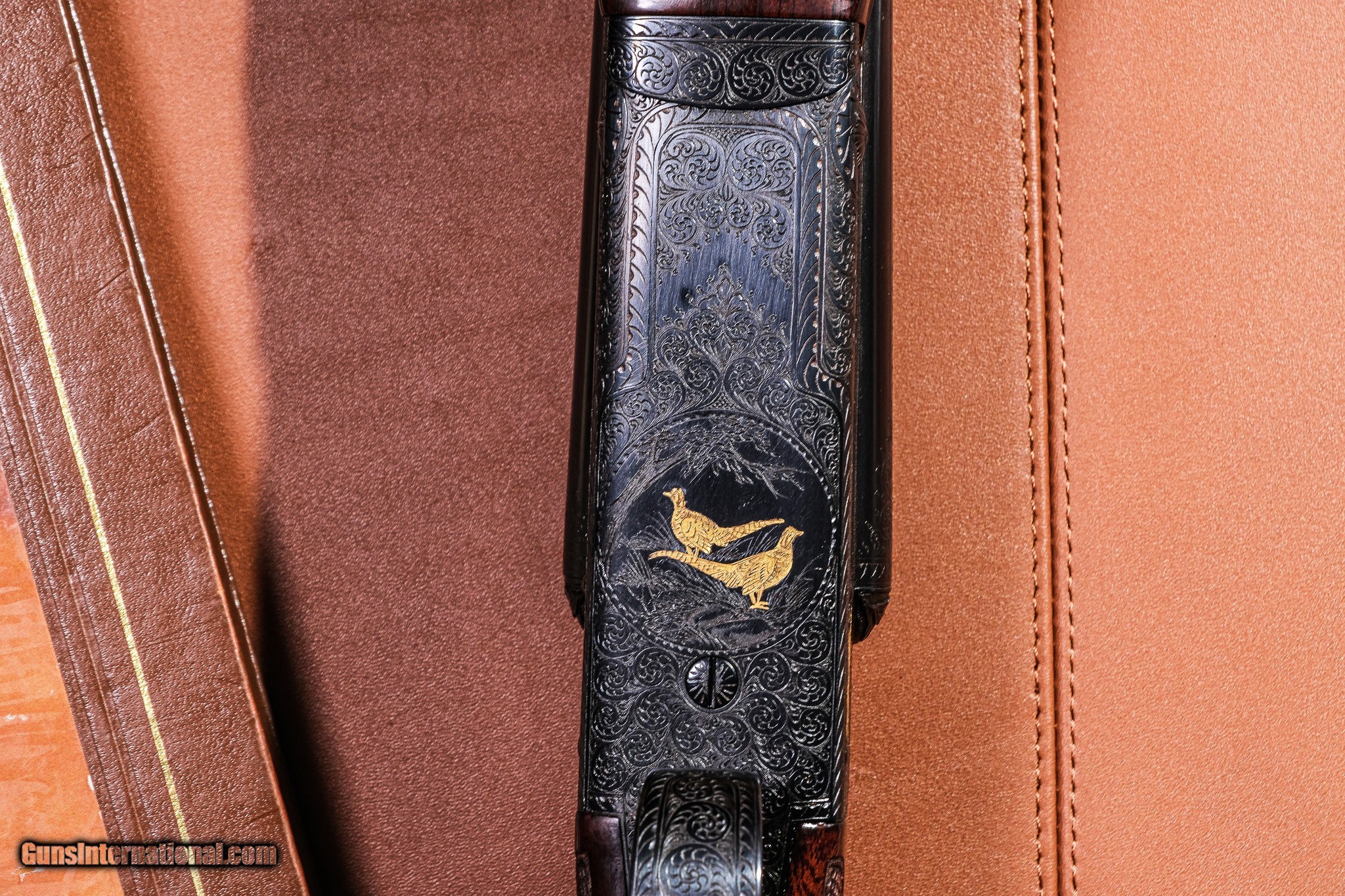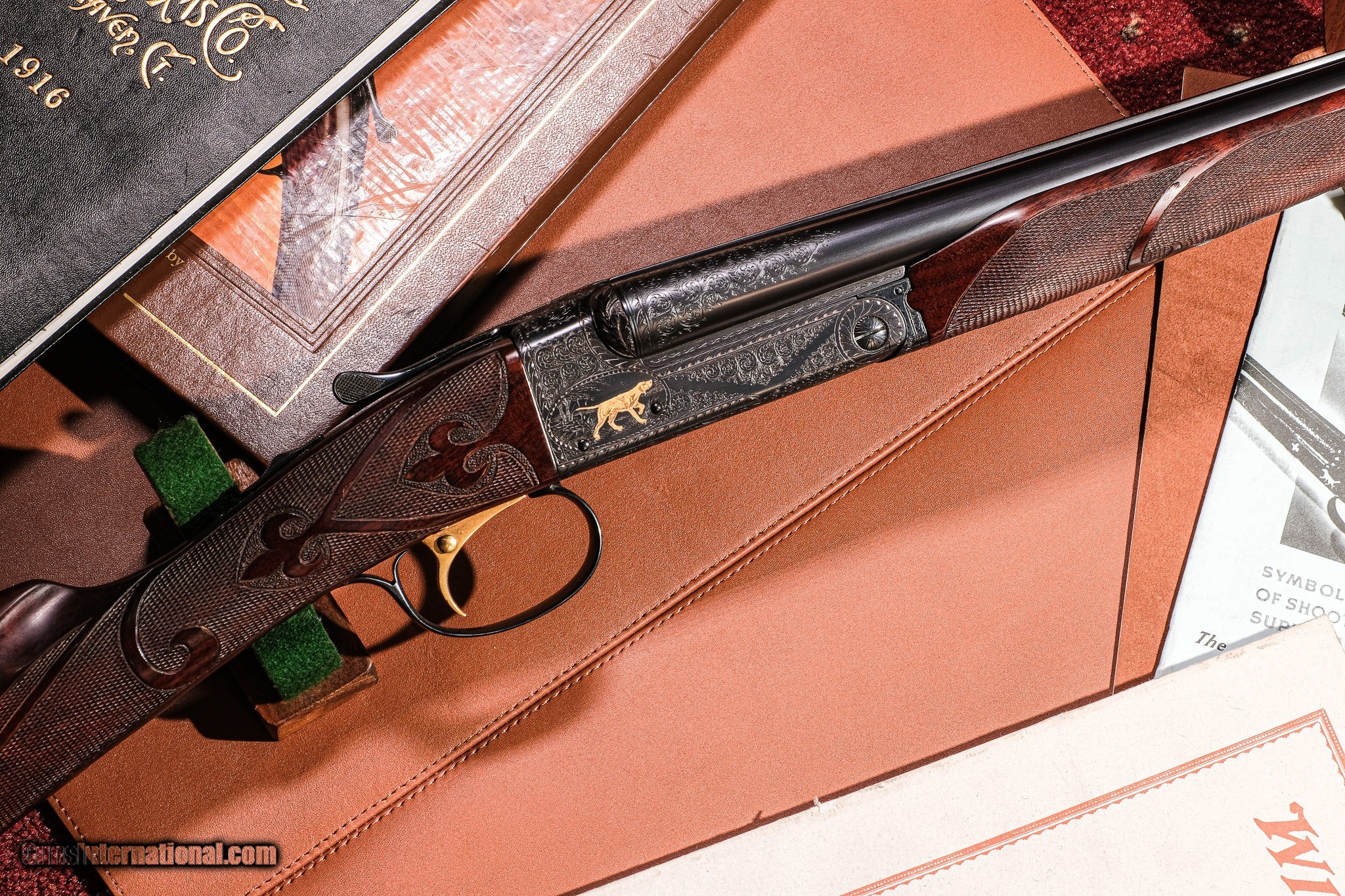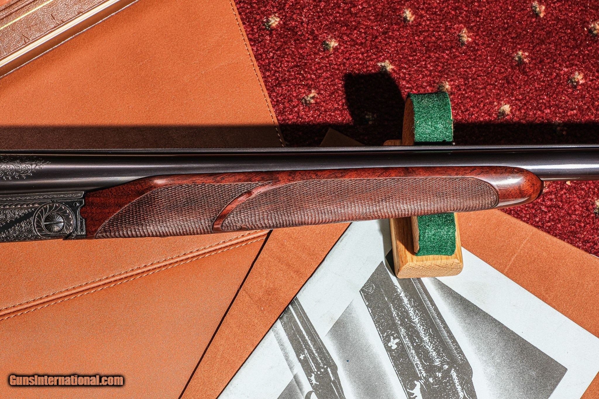 1st set of barrels, 20ga. 26” matted rib barrel, marked custom built by Winchester and choked WS1/WS2. Second set, 28ga. 26” matted rib barrel, marked custom built by Winchester and choked WS1/WS2. Third barrel. 410 26” matted rib barrel, marked custom built by Winchester and choked WS1/WS2. B carved stock, two forends. Jeweled water table, barrel flats, and forend iron. Engraving performed by Nick Kusmit. Straight grip, checkered butt. Heavily figured feather crotch. Ebony forend tips, perfect checkering. Gun is brand new and appears unfired. We believe this gun was sent back and upgraded by Winchester. We serviced this gun over twenty years ago and it is just an outstanding piece of craftsmanship. Warrantied for life to the original owner courtesy of Connecticut Shotgun.