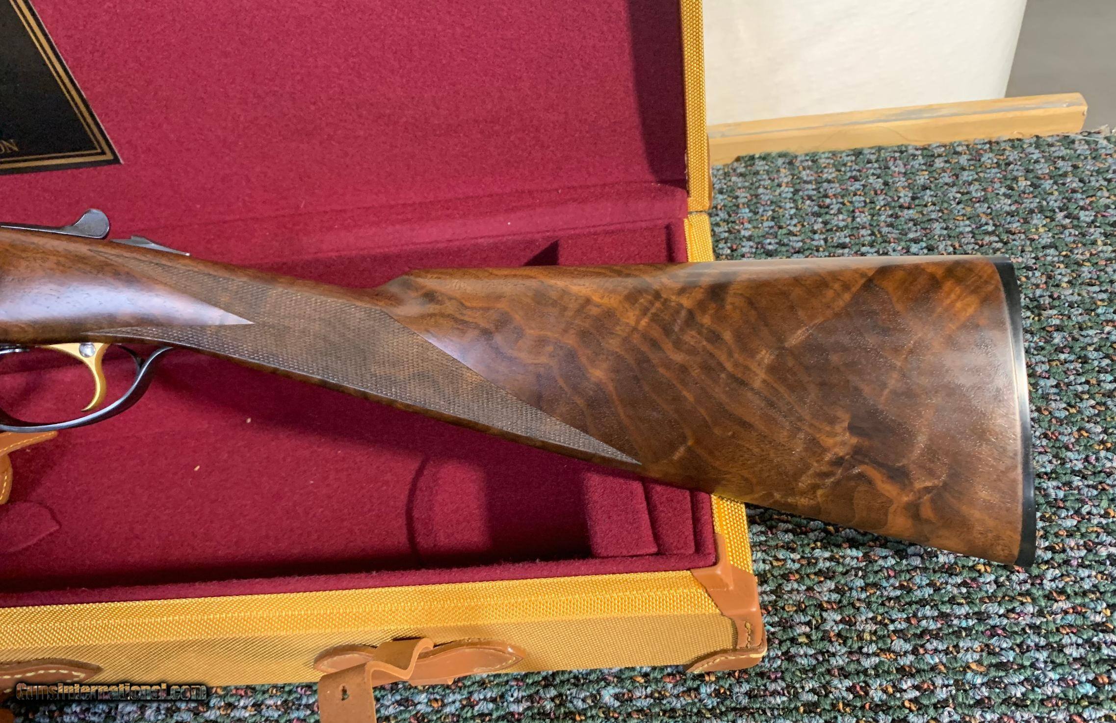 Description: Stock is 3X Black Walnut Upgrade with Straight English style grip and splinter foreend with oil finish. Single selective trigger with long tang trigger guard. Spectacular full coverage ornamental scroll engraving and hardened case color reciever. Automatic ejectors and tang mounted auto safety. This gun is used but in "as new condition" with less than 50 rounds fired. Includes Manufactures canvas hard luggage style case with leather trim and all accessories including cleaning rod ,brush, mop, oil container, choke case and snap caps. 3 day no-fire inspection at your FFL. Gun will be shipped from Pennslvania only to your licensed FFl dealer. SOLD Manufacturer: Connecticut Shotgun Manufacturing Company Model: RBL 20 Launch Edition Serial Number: 1050 Chambers: 3 inch Ejectors: auto Condition: excellent Metal Condition: excellent Wood Condition: excellent Bore Condition: excellent Barrels: 28 inch Barrel Type: side by side Action: break open box lock Triggers: single selective Gauge Info: 20 Stock: english Stock Comb: 1 1/2 in Stock Heel: 2 3/8 in Fore End: splinter Butt Pad: hard plastic LOP: 14 1/2 in Rib: solid swamped Finish: Tru-oil Weight: 6 lb 3 oz Sights: brass front bead Chokes: 5 screw in Engraving: ornamental scroll Extras: accessories Case: canas hard |