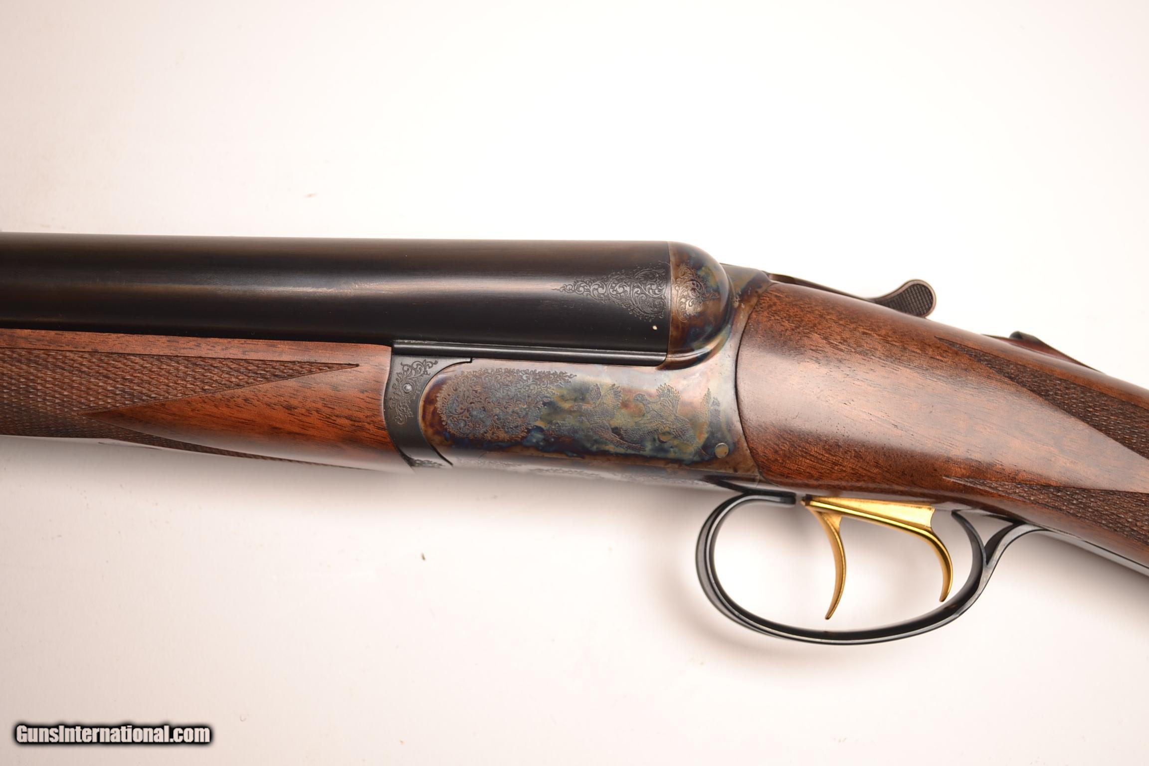 Description: RBL 12 - Reserve, 12ga., 28” barrels, Trulock chokes, 4x American black walnut straight grip stock, splinter forend, quick release interchangeable recoil pad system allowing either 14 ¼” or 14 ¾” LOP, gold double triggers, automatic ejectors, automatic safety, rooster pheasant & ducks in flight surrounded full coverage scroll engraving over spectacular bone & charcoal case coloring, excellent configuration, 100% brand new & unfired, available for immediate delivery, includes case and accessories. Base price - $3,795.00, options include: 4x wood - $600, S&H - $50.00. Last of the RBL-12's Inv# 27364 7 lbs. 12 oz. 14 ¼”- 14 ¾” X 1 1/2” X 2 3/8” $4,445.00 SOLD |