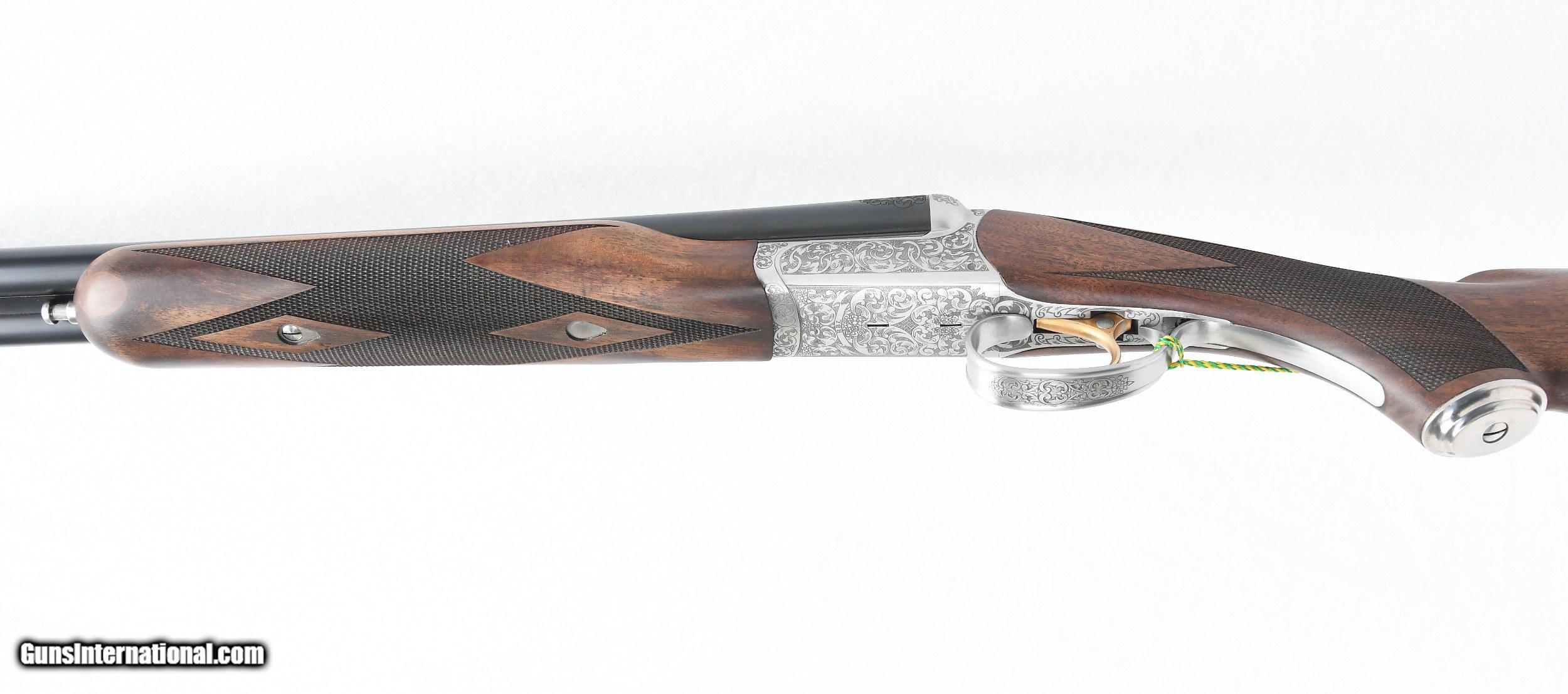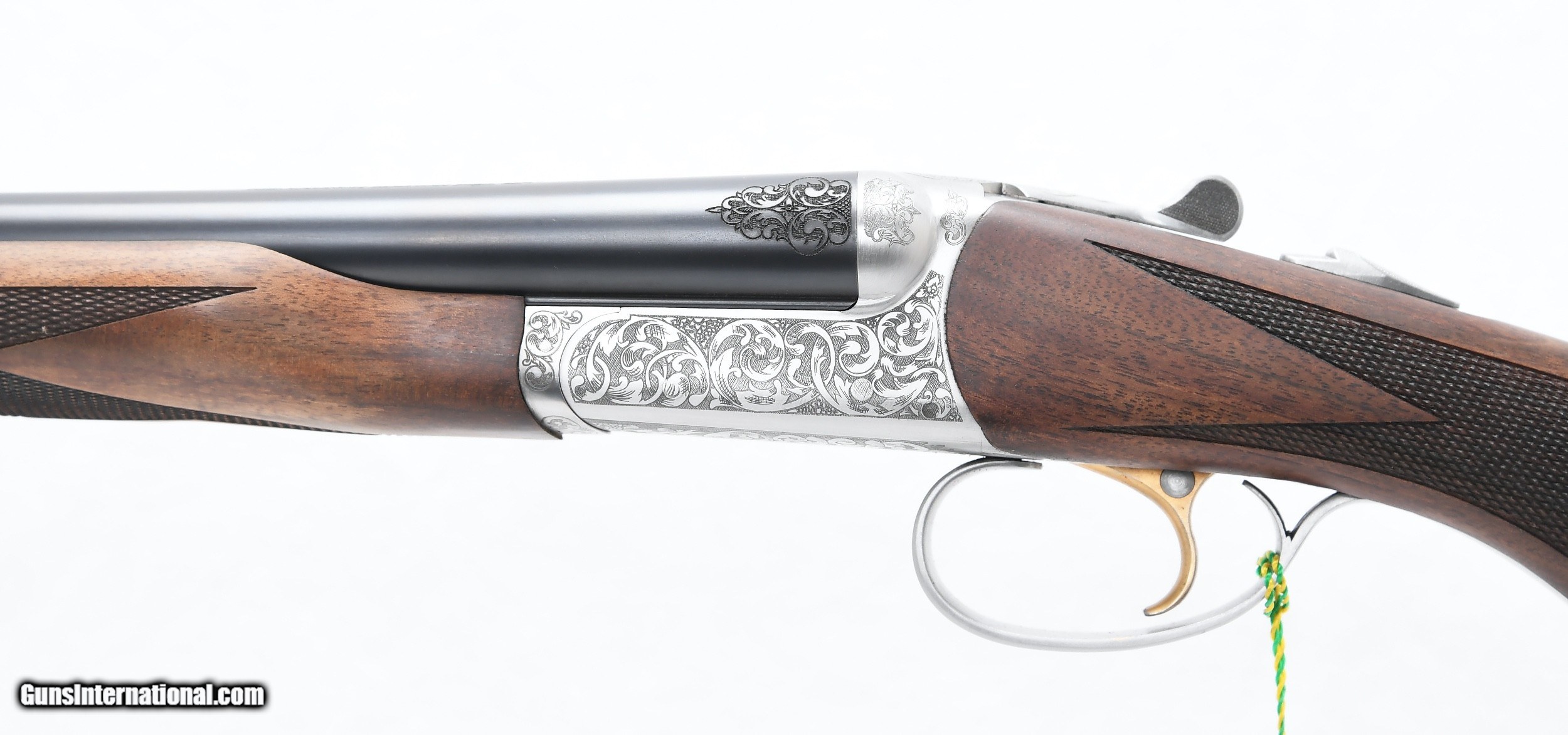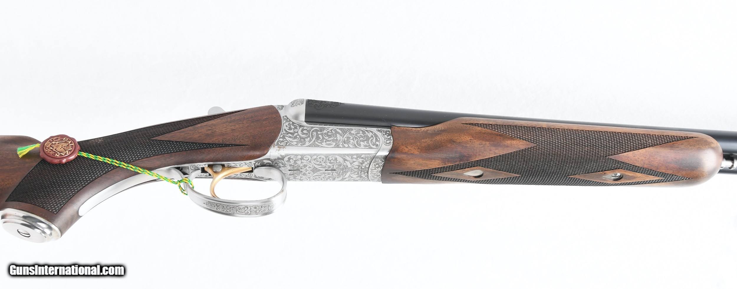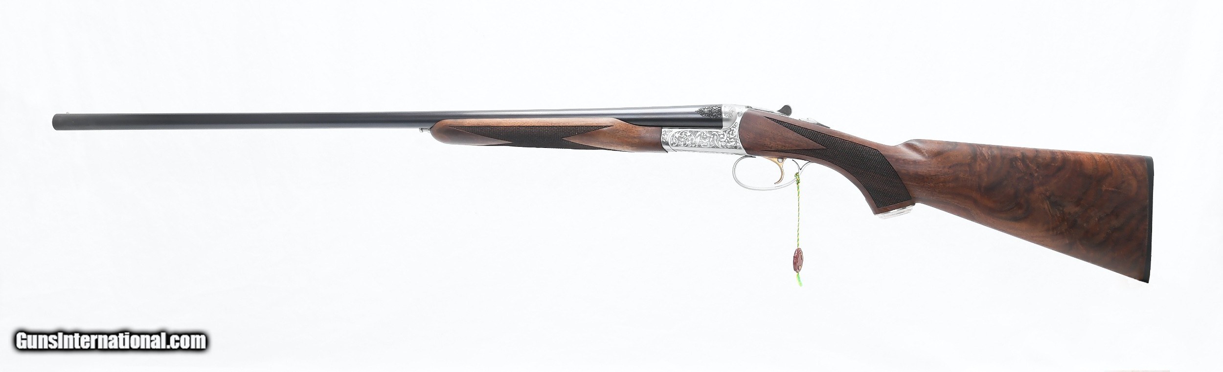 Description: CSMÇ RBL 20 gauge SxS shotgun, Launch Edition. This is a very early Launch Edition RBL 20 that remains absolutely unfired, new in the case. You will notice that the accessories are still wrapped as they were new in 2005. Features of this RBL: French Grey receiver and trigger guard. Launch edition embellishment. Single Selective Trigger, pistol grip stop on upgraded wood with satin oil finish and beavertail forearm with Deeley style release. Barrels are 28” with choke tubes. Cased with all accessories. Stock dimensions: 14 ½” LOP, 1 ½” DAC and 2 ¼” DAH with neutral cast. Weighs 6 lbs. 5 oz. $3,750.00 SNL RBL-000568 SOLD |