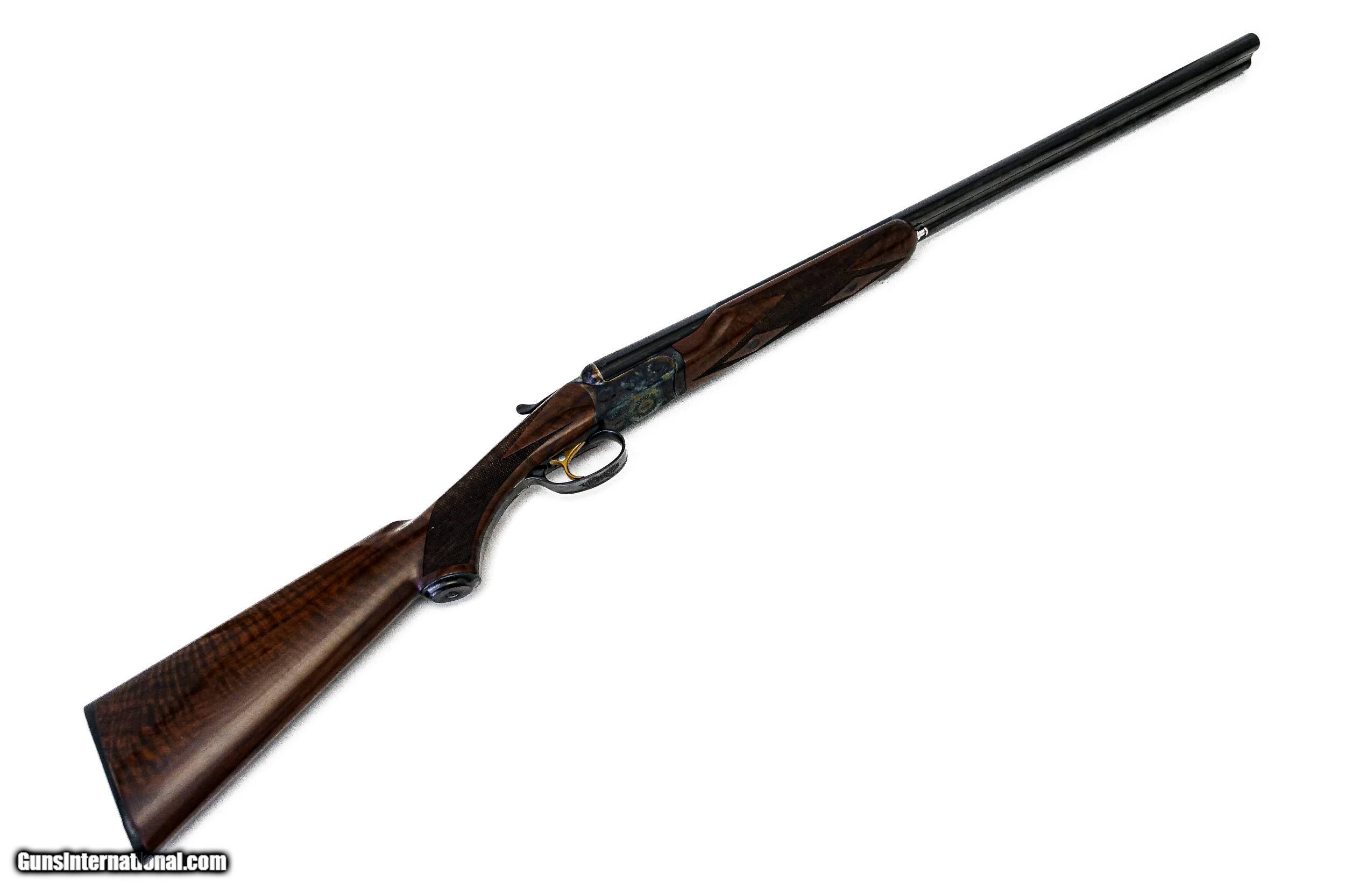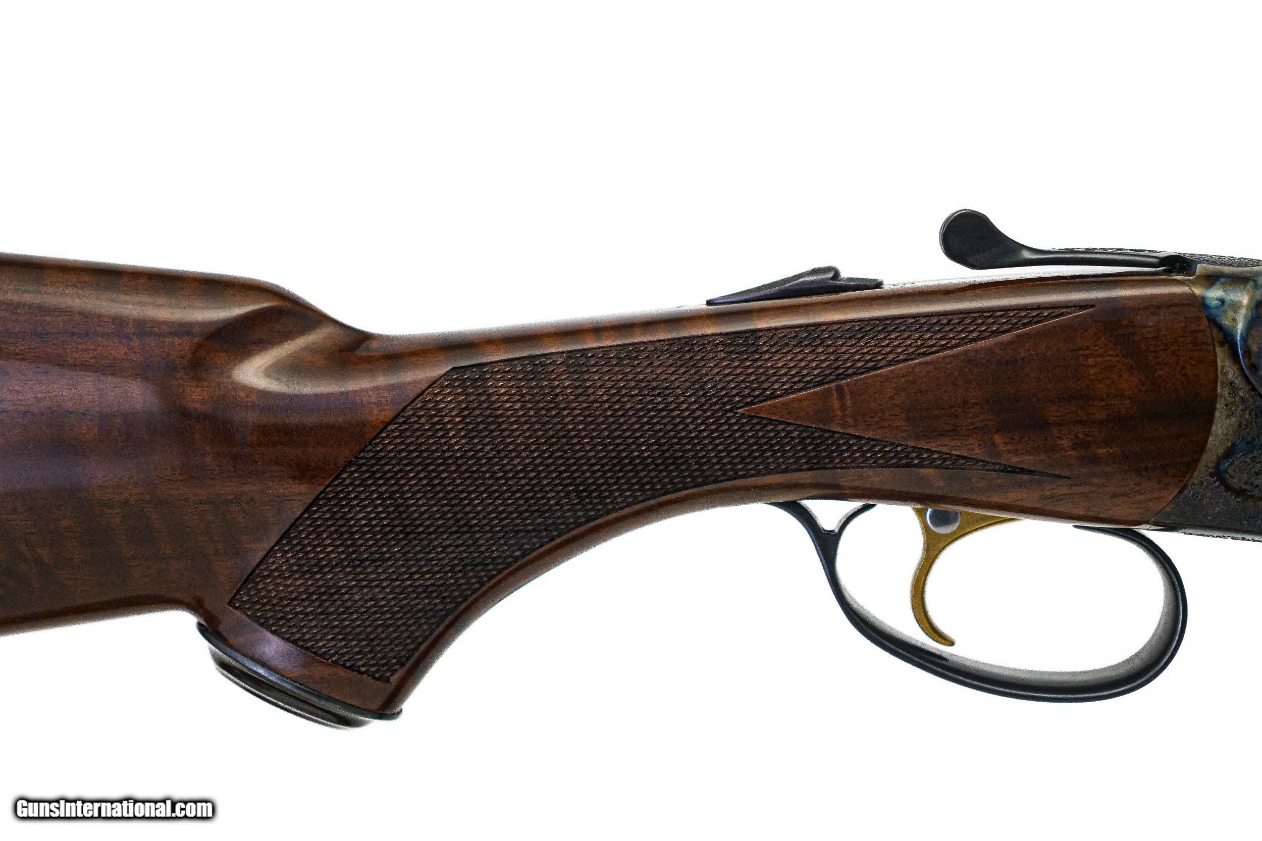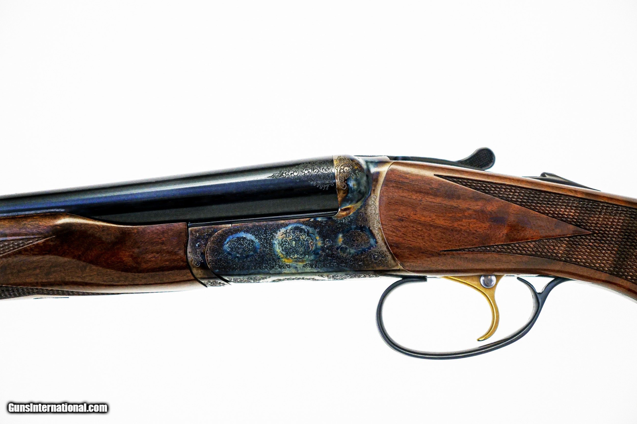 Description: CSMC - RBL, 20ga. 28" Barrels with Screw-in Choke Tubes. Nicely figured 3x fiddleback American black walnut long tang metal capped pistol grip stock, TruOil finish, hidden screw-in choke tubes, factory serrated butt plate, gold single selective trigger, automatic ejectors, 2 ¾” chambers, solid game rib, automatic safety, front brass sight, beavertail forend, full coverage miniature rose bouquet and scroll engraving over a tradition bone and charcoal color case hardened finish, engraved wedges on breech of barrels, factory brand new and unfired, available for immediate delivery. Base Price - $4,250.00, Options Include: TruOil Finish - $550.00, Single Selective Trigger - $175.00, Beavertail Forend - $175.00, 3x Walnut - $350.00, S&H - $50.00. Inv: 19740 6 lbs. 2 oz. 14 5/8” x 1 ½” x 2 3/8” $5,550.00 SOLD |