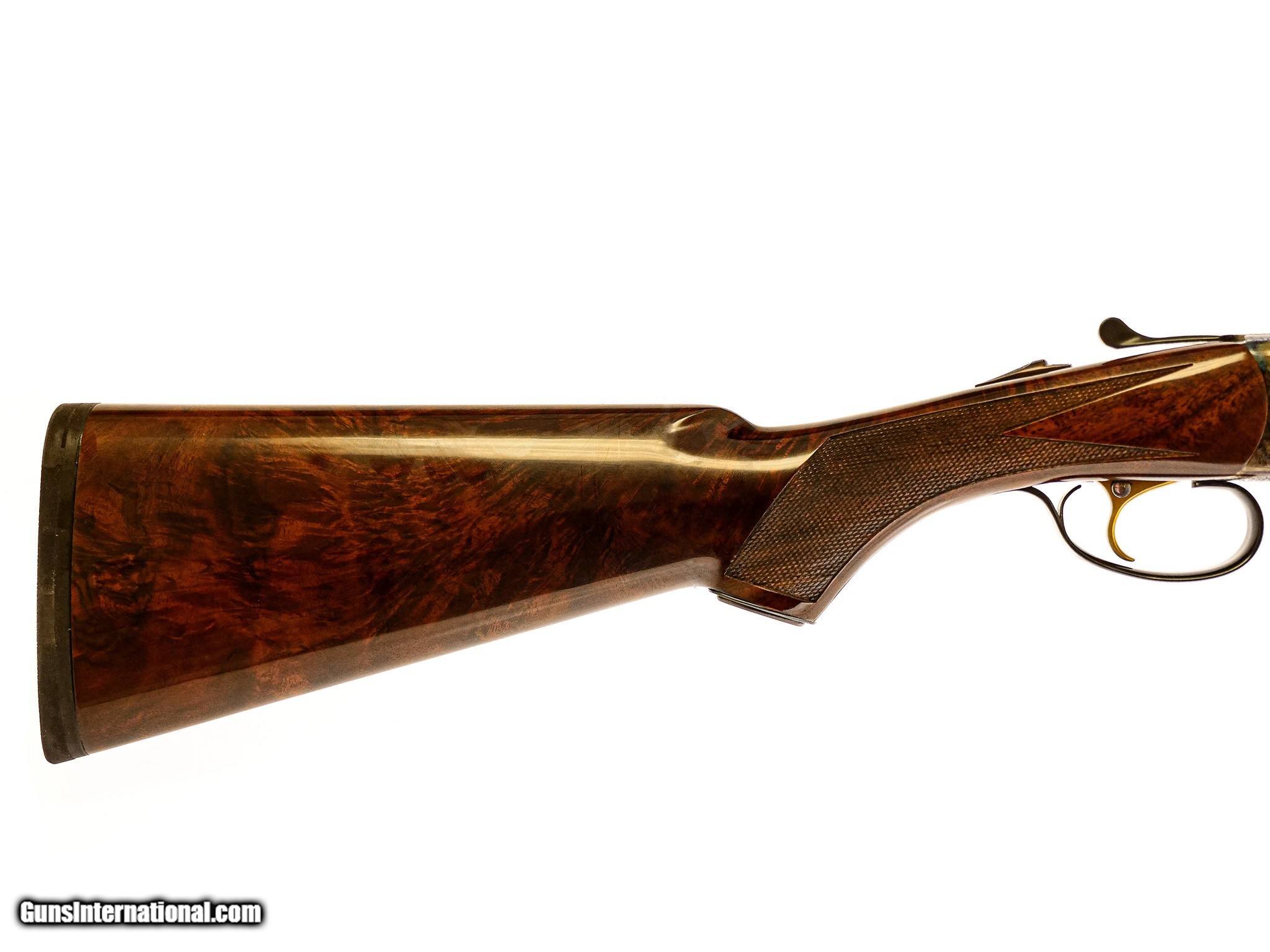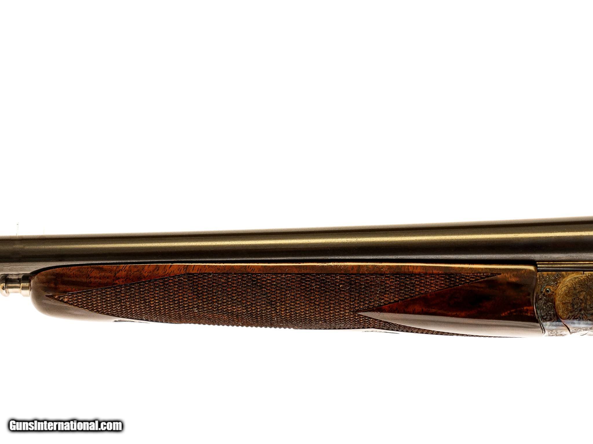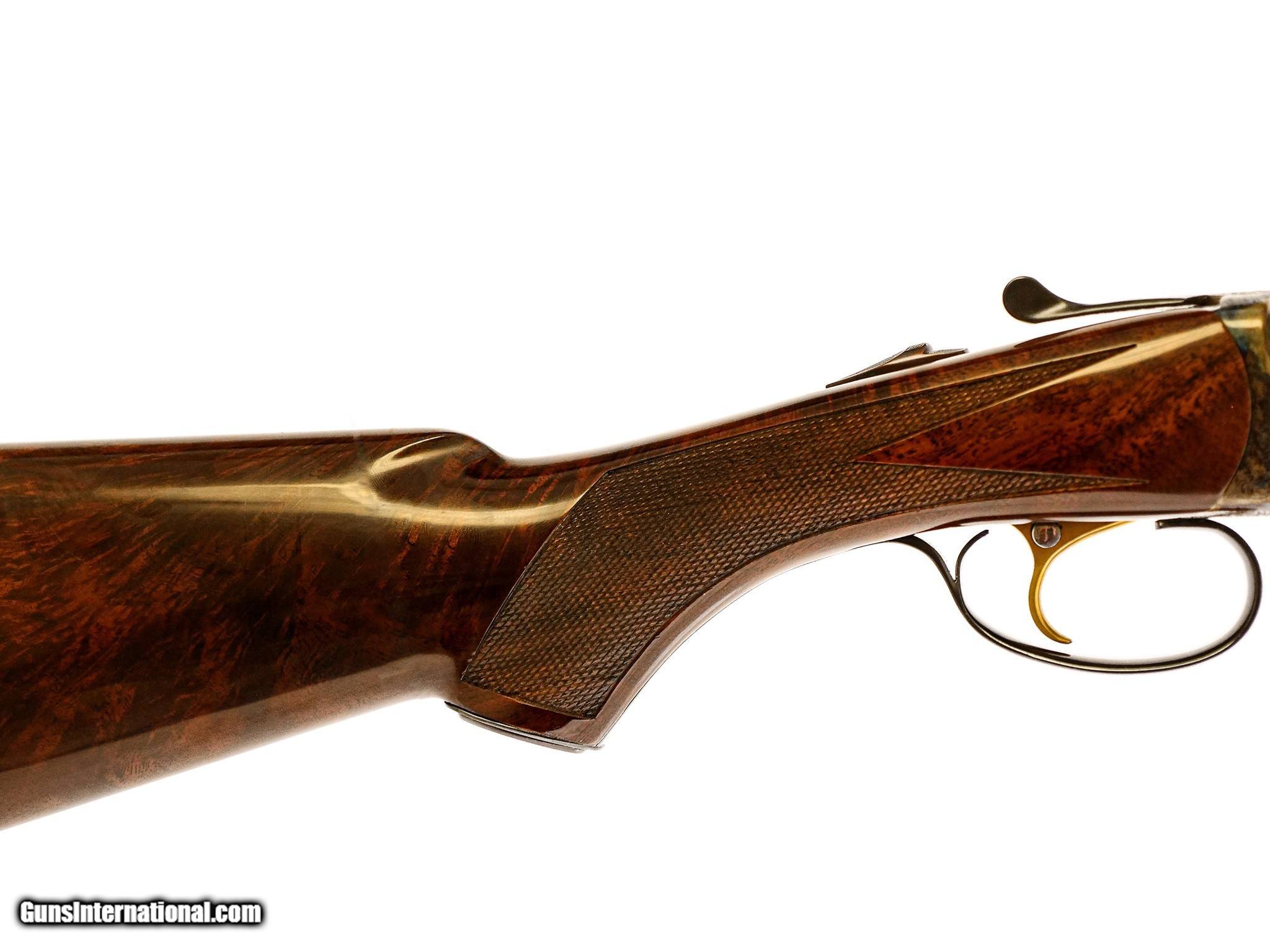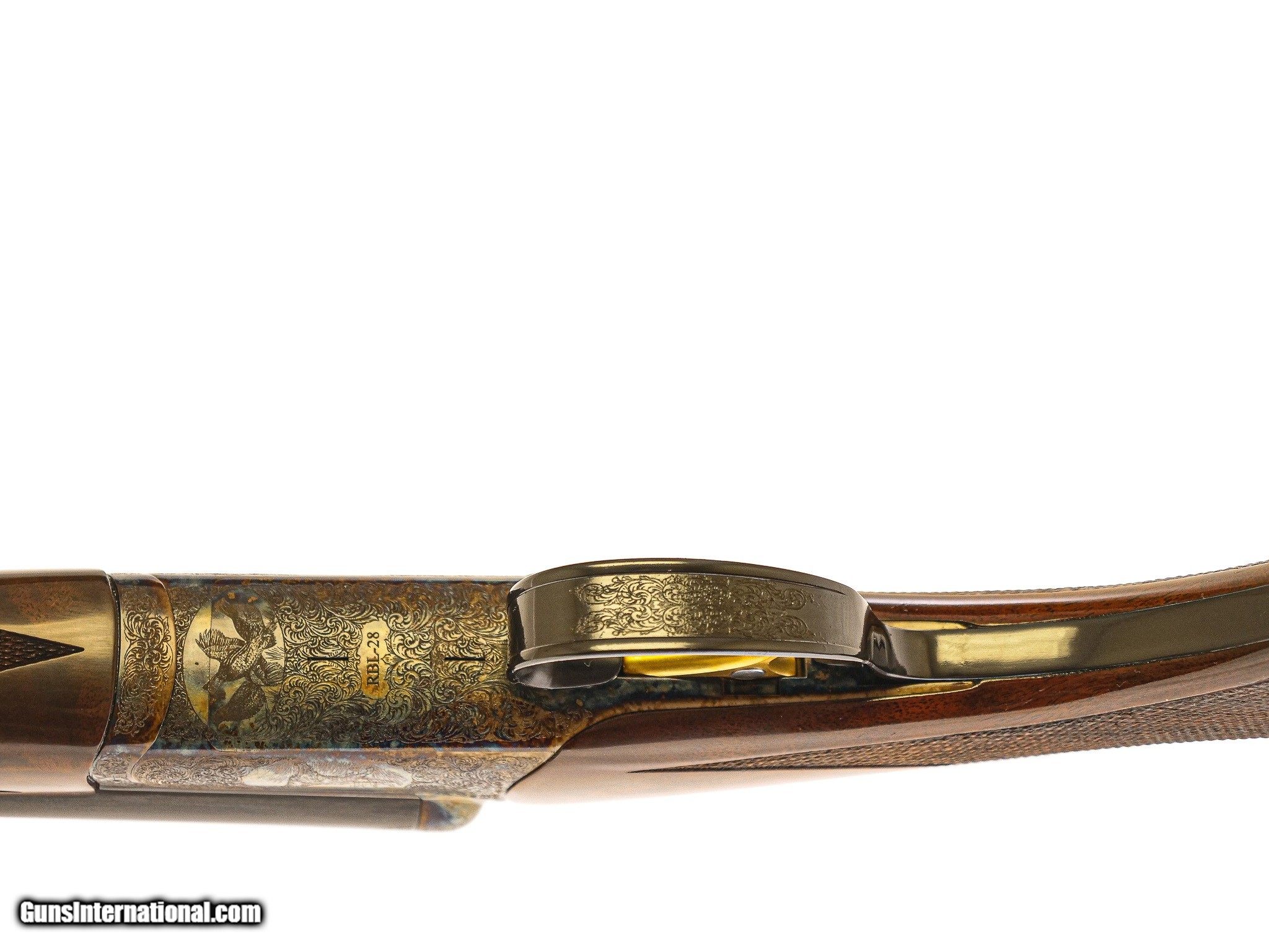 Description: CSMC - RBL, 28ga. 28" Barrels Choked M/F. Which can be opened to customer specifications, solid game rib, beautiful exhibition feathercrotch American black walnut metal capped pistol grip stock, splinter forend, TruOil finish, gold single trigger, automatic ejectors, game scene engraving of pointer, setter, and quail surrounded by full coverage ornamental miniature scroll engraving over spectacular case coloring, factory recoil pad, 100% excellent configuration, hand made in the USA by the master gunsmiths of Connecticut Shotgun, available for immediate delivery. Base Price - $5,250.00, Options Include: Exhibition American Black Walnut - $900.00, Single Selective Trigger - $175.00, TruOil Fnish - $500.00, S & H - $50.00. Inv: 20440 5 lbs. 10 oz. 14 ½” X 1 ½” X 2 ¼” $6,875.00 SOLD |