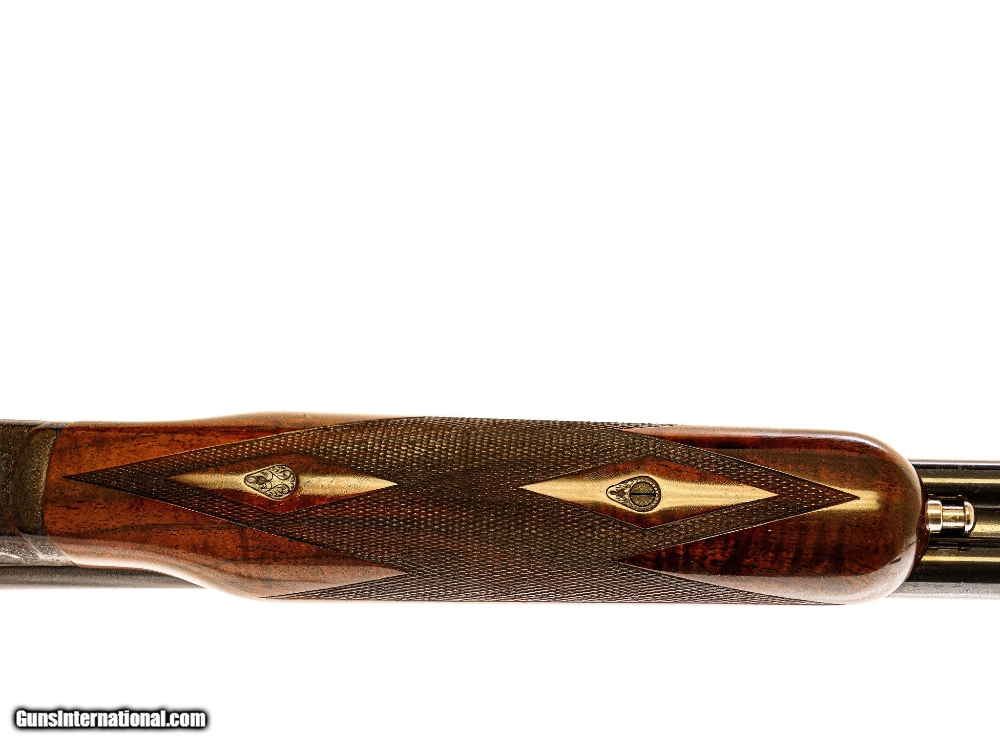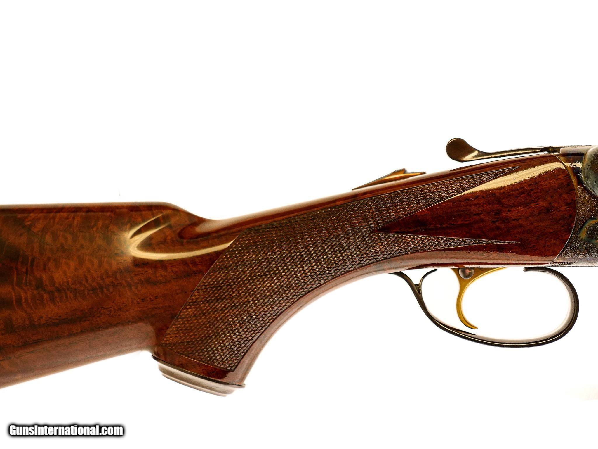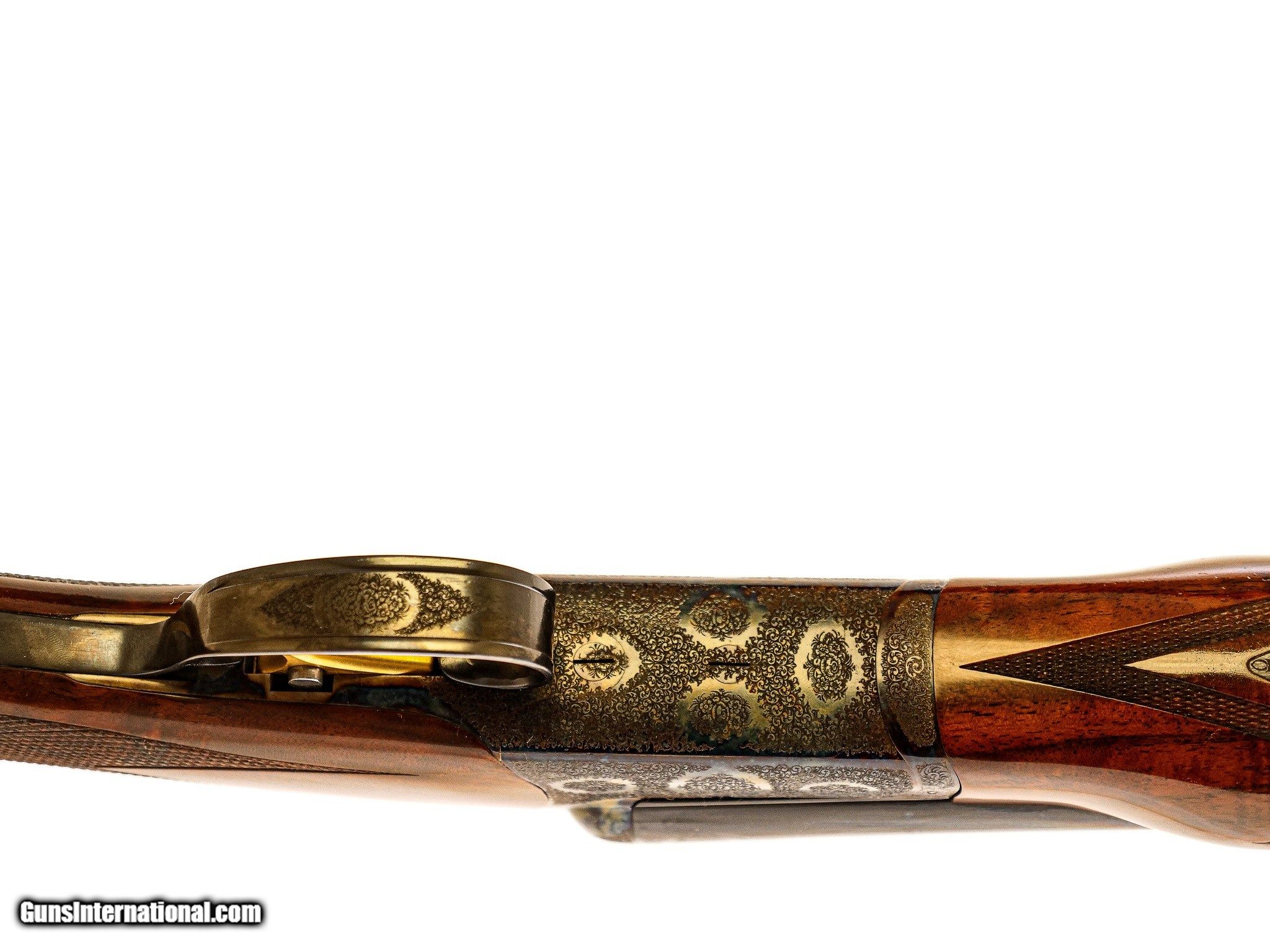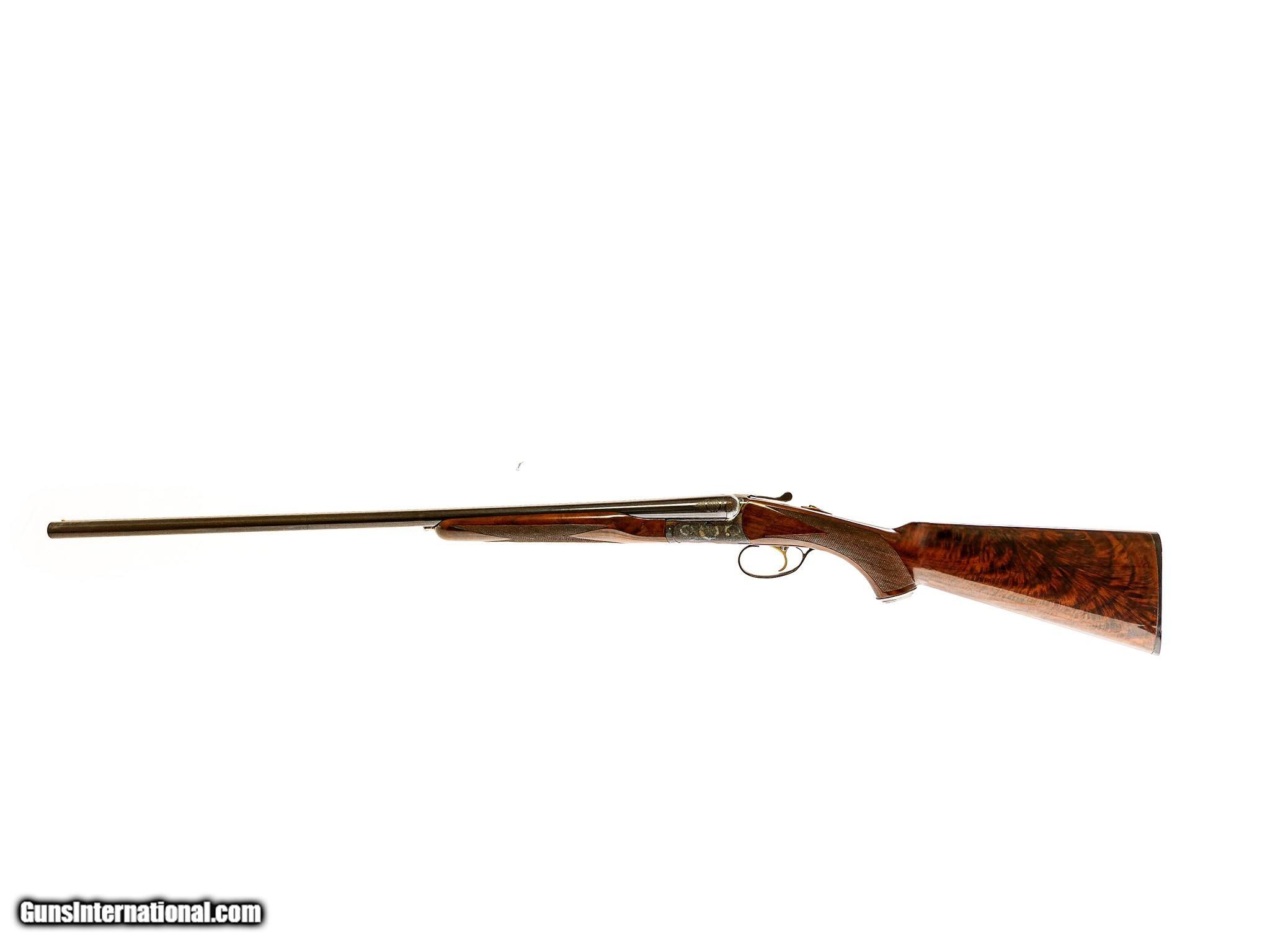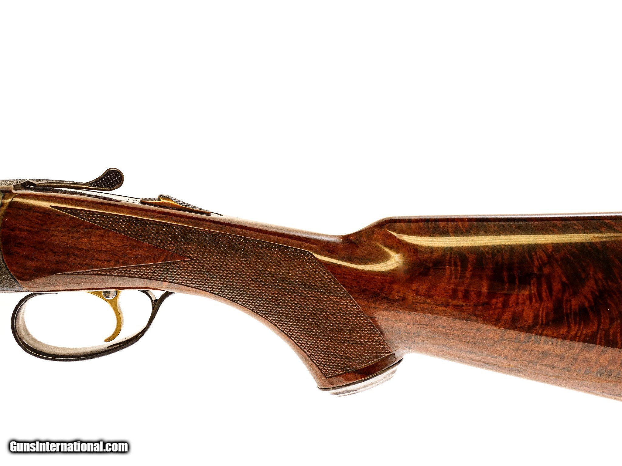Description: CSMC - RBL, SxS, 20ga. 28" Barrels with Screw-in Choke Tubes. Solid game rib, stunning exhibition grade full feathercrotch American black walnut metal capped pistol grip stock, Beavertail forend, TruOil finish, hidden screw-in choke tubes, single selective trigger, factory serrated butt plate, automatic ejectors, full coverage miniature rosette bouquet and scroll over a traditional bone and charcoal color case hardened finish, the ideal configuration, hand made in the USA by the master gunsmiths of Connecticut Shotgun, available for immediate delivery. Base - $4,250.00, Options Include: Beavertail Forend - $175.00, TruOil Finish - $500.00, Single Selective Trigger - $175.00, Exhibition Wood - $900.00, S & H - $50.00. Inv: 62265 6 lbs. 6 oz. 14 5/8” X 1 ½” X 2 3/8” $6,050.00 SOLD |