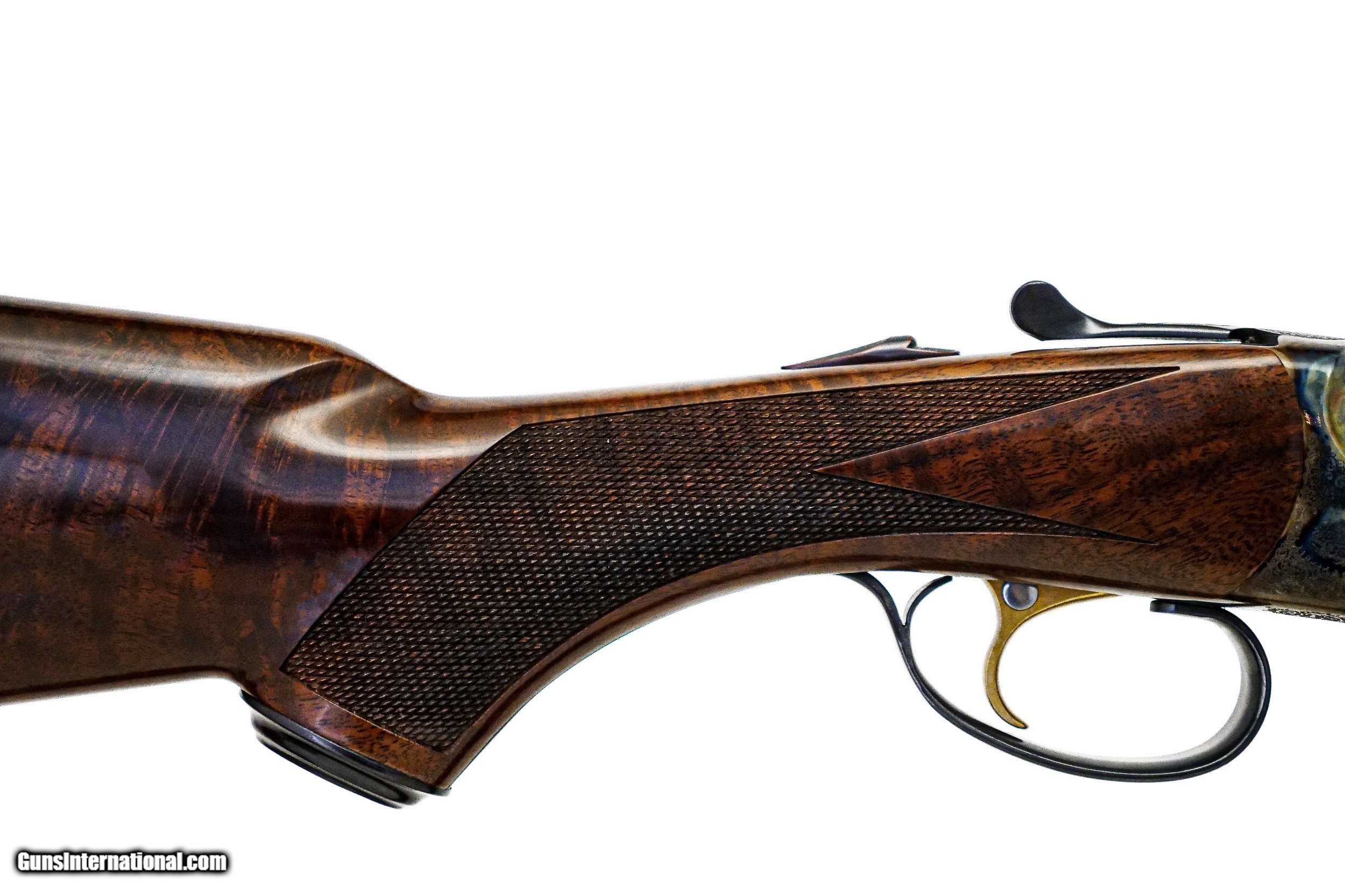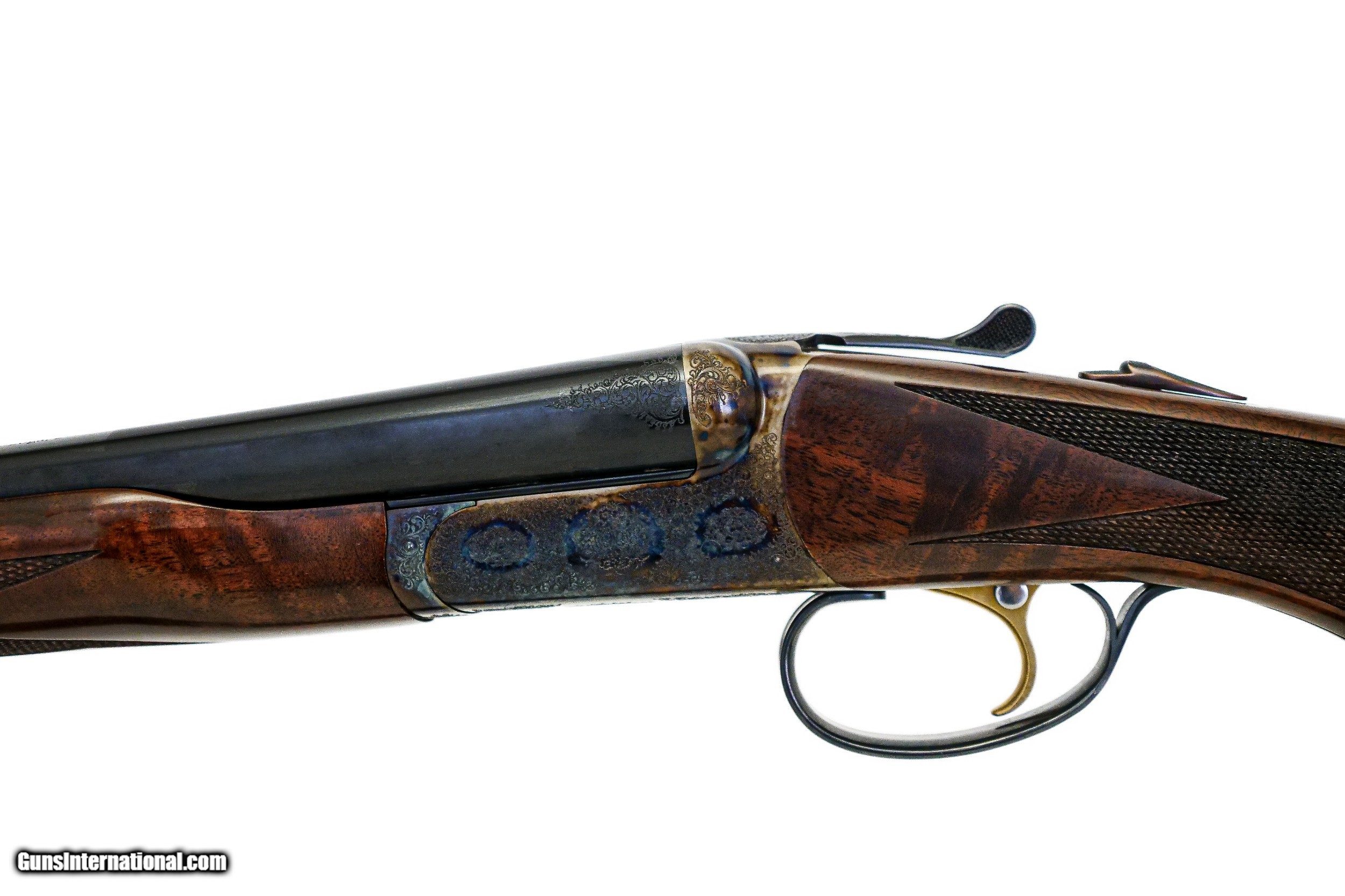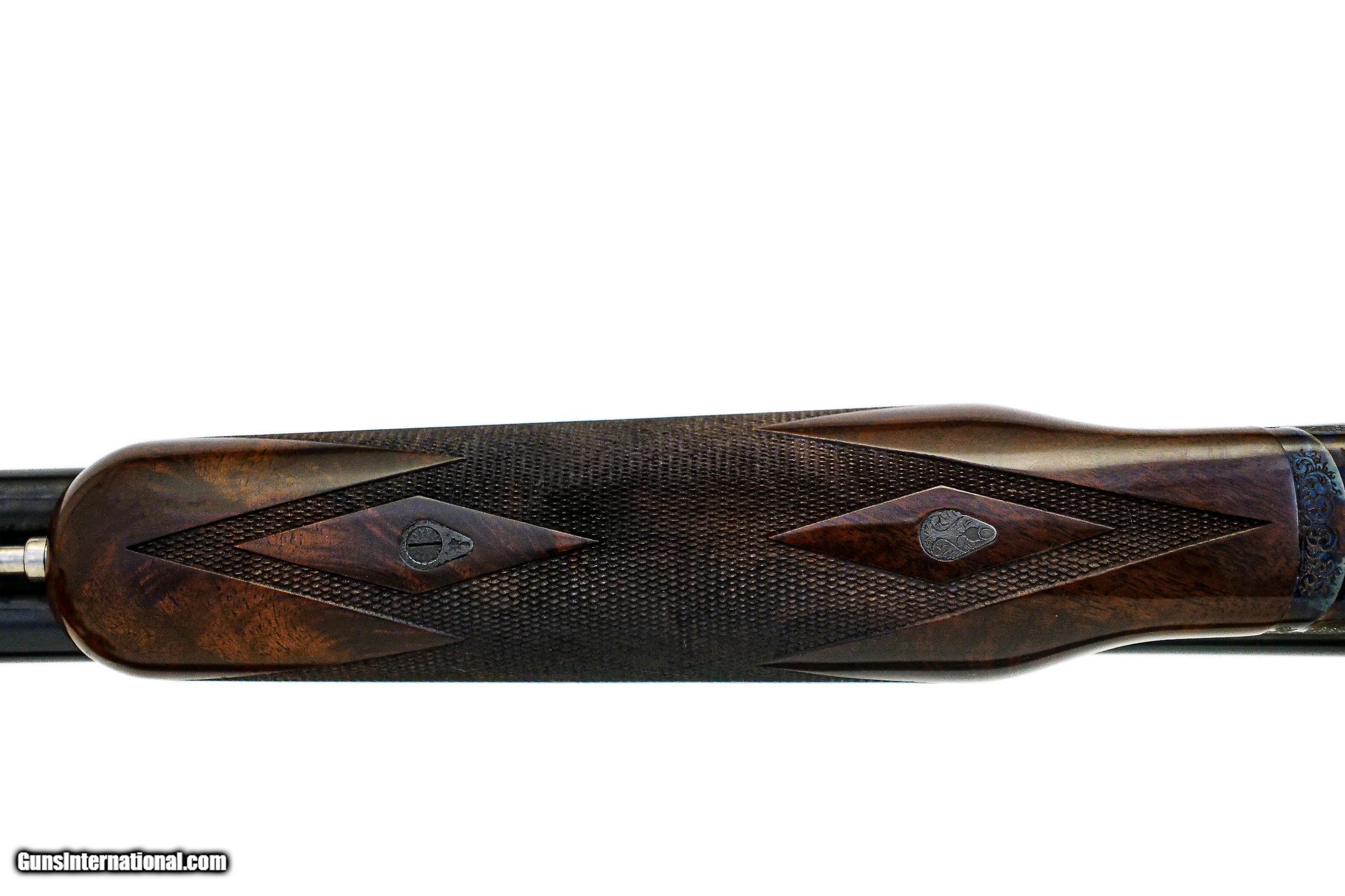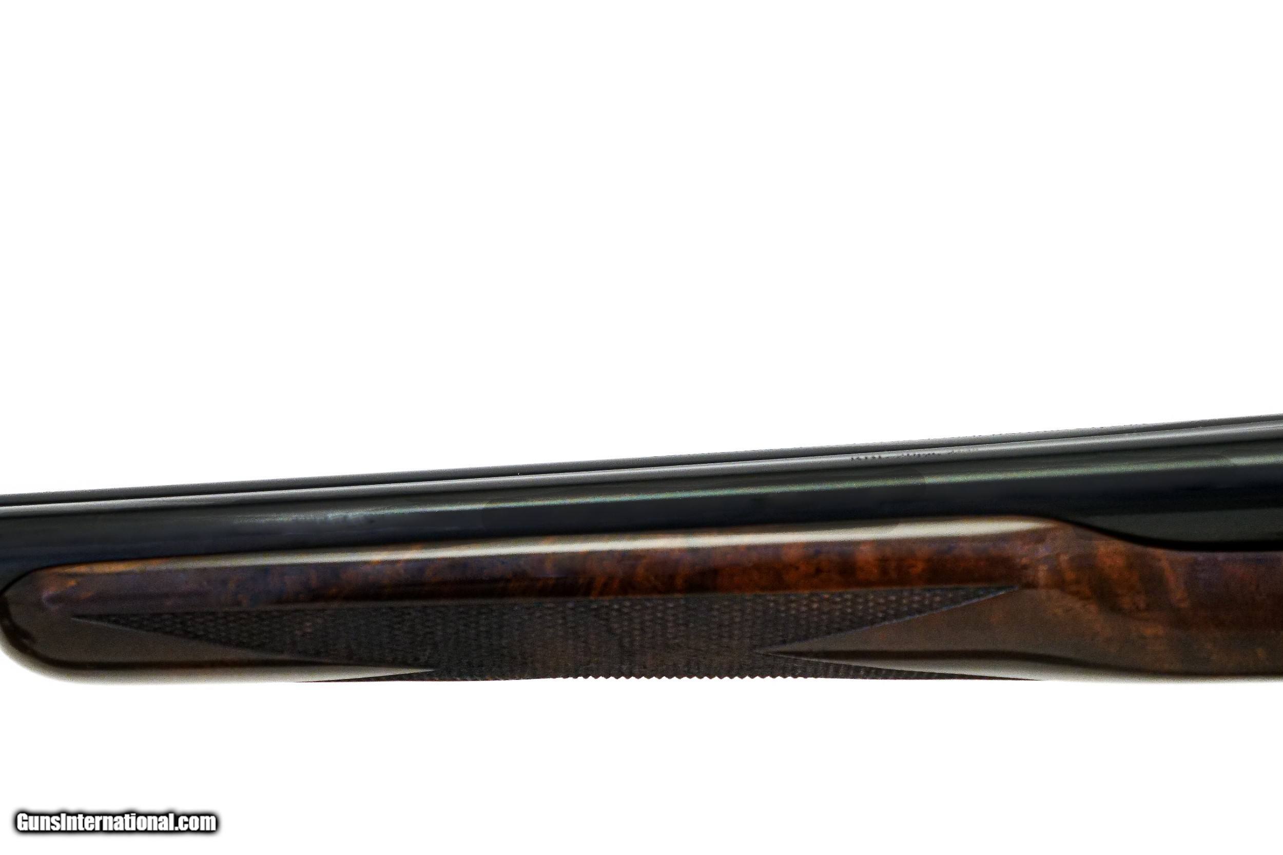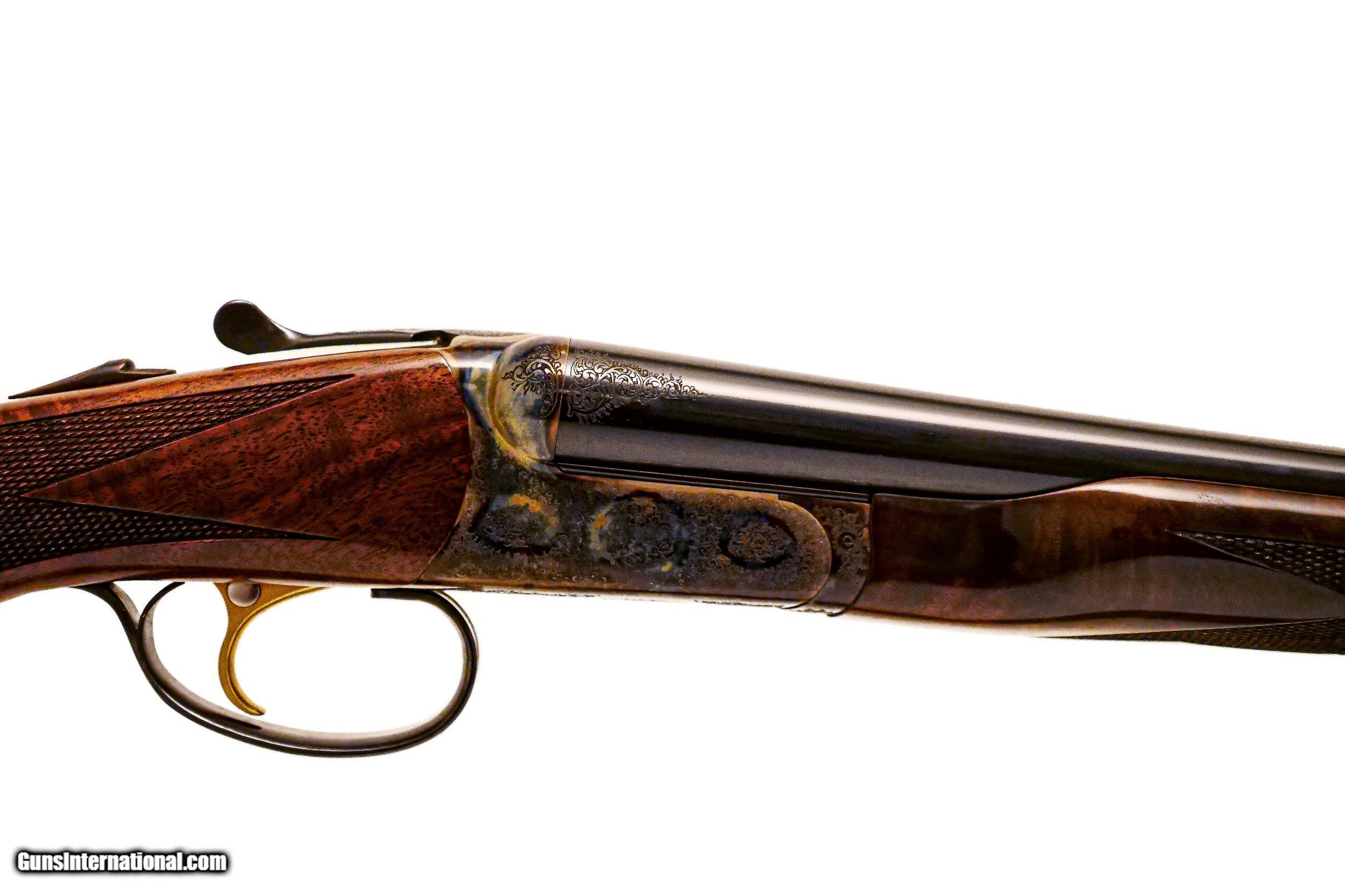 Description: CSMC - RBL, SxS, 20ga. 28" Barrels with Screw-in Choke Tubes. Nicely figured 3x American black walnut long tang metal capped pistol grip stock, TruOil finish, hidden screw-in choke tubes, factory serrated butt plate, gold single selective trigger, automatic ejectors, 2 ¾” chambers, solid game rib, automatic safety, front brass sight, beavertail forend, beautiful full coverage miniature rose bouquet and scroll engraving over a tradition bone and charcoal color case hardened finish, engraved wedges on breech of barrels, factory brand new and unfired, available for immediate delivery. B Base Price - $4,250.00, Options Include: TruOil Finish $550.00, Single Selective Trigger - $175.00, Beavertail Forend - $175.00, 3x Walnut - $350.00, S & H - $50.00. Inv: 19729 5 lbs. 14 oz. 14 5/8” x 1 ½” x 2 3/8” $5,550.00 SOLD |