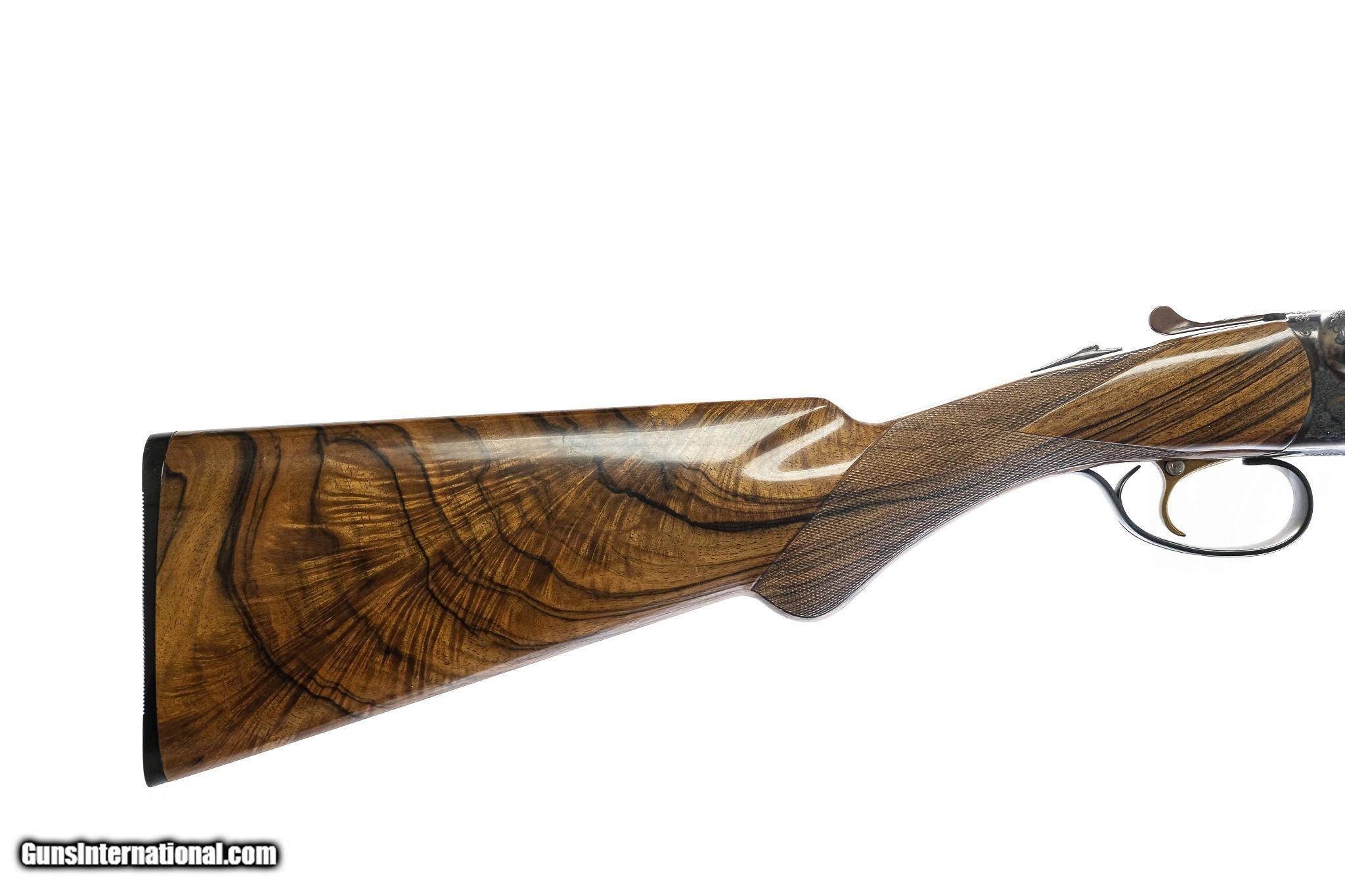 Description: CSMC - RBL, SxS, 20ga. 28" Barrels with Screw-in Choke Tubes. Factory screw-in hidden choke tubes, solid game rib, stunning exhibition highly figured California English walnut round knob stock, beavertail forend, TruOil finish, gold single trigger, automatic ejectors, full coverage ornamental miniature rosette bouget and scroll engraving over spectacular case coloring, factory butt plate, perfect configuration, hand made in the USA by the master gunsmiths of Connecticut Shotgun, available for immediate delivery. Base Price - $4,250.00, Options Include: Exhibition California English Walnut - $1,500.00, TruOil Finish - $500.00, Beavertail Forend - $175.00, Single Selective Trigger - $175.00, S & H - $50.00. Inv: 81008 6 lbs. 2 oz. 14 ¼” x 1 ½” x 2 3/8” $6,650.00 SOLD |