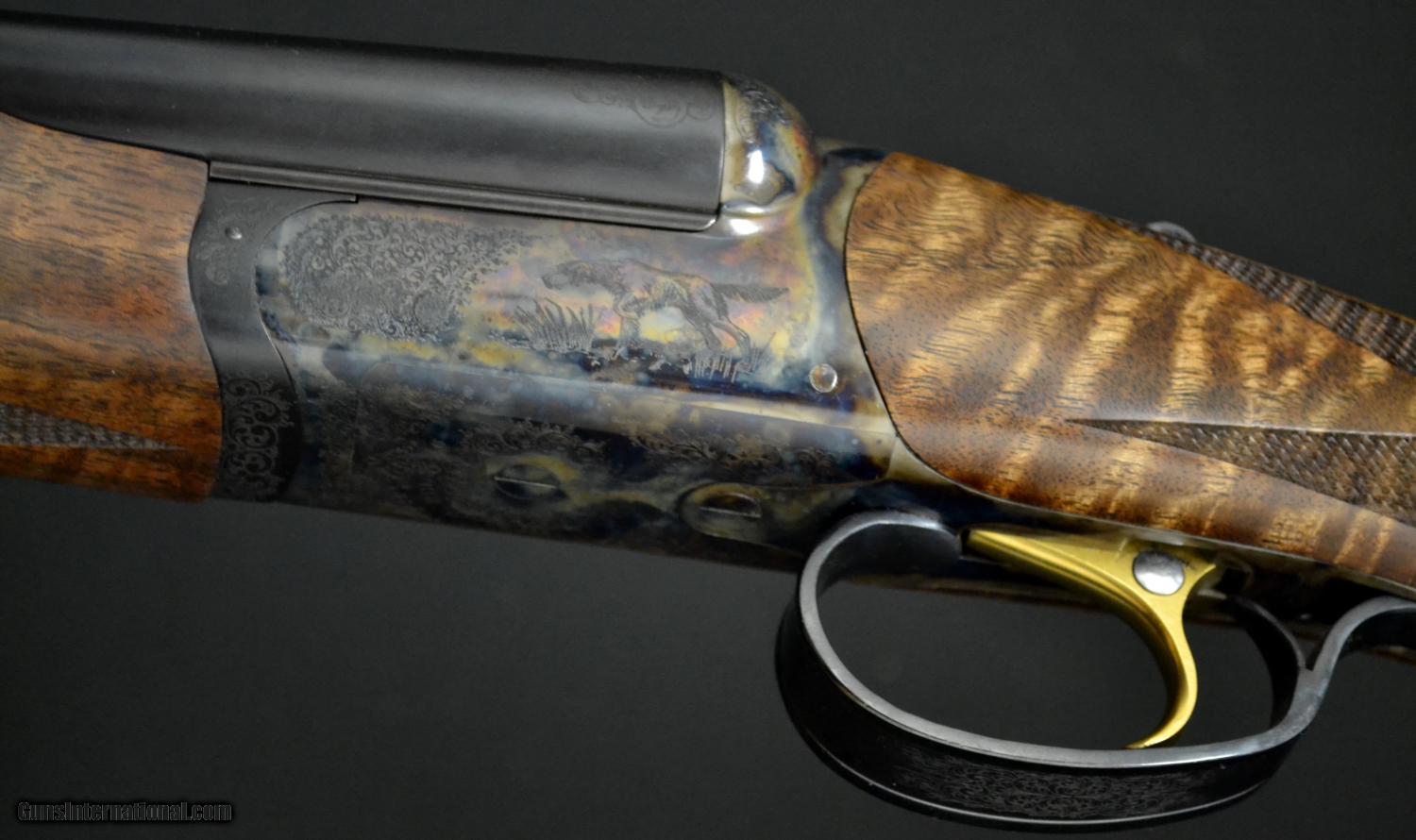 Description: RBL 16 - Reserve, 16ga., 29” barrels, fixed chokes M/F can be opened to customers specifications, gorgeous 4X American black walnut capped pistol grip stock, beavertail forend, single triggers, automatic ejectors, hard butt plate, dogs on point surrounded full coverage scroll engraving over magnificent case coloring, 100% new and unfired available for immediate delivery, includes case and accessories. Base price - $3,795.00, options include: 4X wood - $600, sst $175, beavertail forend $175, S&H- $50.00.