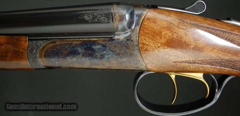 Description: RBL 28 Reserve, 28ga. 26” barrels choked M/F, chokes can be adjusted to customer specifications, stunning exhibition American black walnut, pistol grip stock, beavertail forend, Tru-Oil finish, hard butt plate, double triggers, automatic ejectors, automatic safety, solid game rib, dogs on point surrounded full coverage scroll engraving over magnificent case coloring, 100% new and unfired available for immediate delivery, includes maker's case and accessories. Base price - $4,995.00, options include: exhibition wood - $900, Tru-Oil finish - $500, Beavertail- $175 S&H - 50.00.