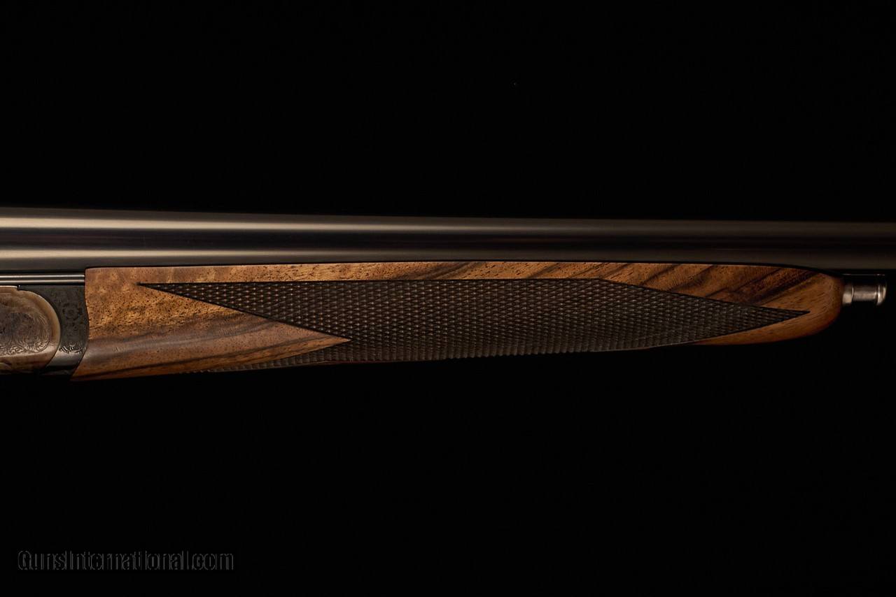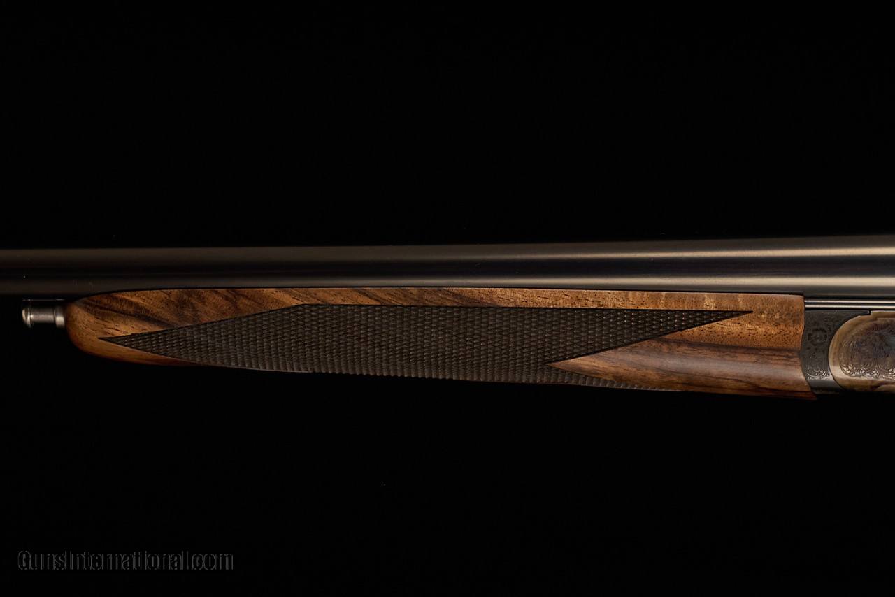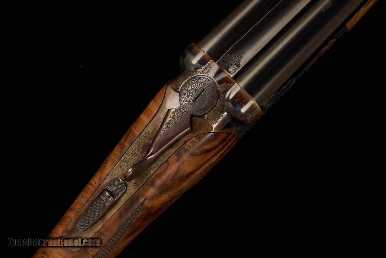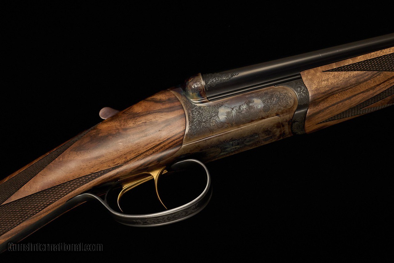 Engraved with scroll and game scene vignettes. An English pointer on the right side, an English setter on the left side, and a flushing ruffed grouse on the underside. Case color hardened action and blued furniture. Overall, the gun remains near new. Exhibition grade walnut stock. Stock and checkering rate blemish free. Pristine bores and excellent bluing on barrels. Top lever right of center, on face, and ejectors in time.