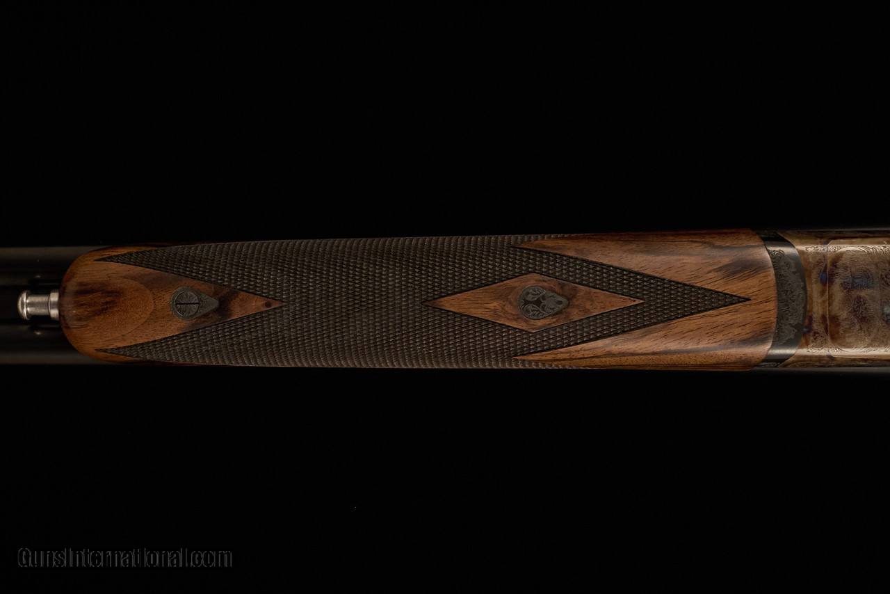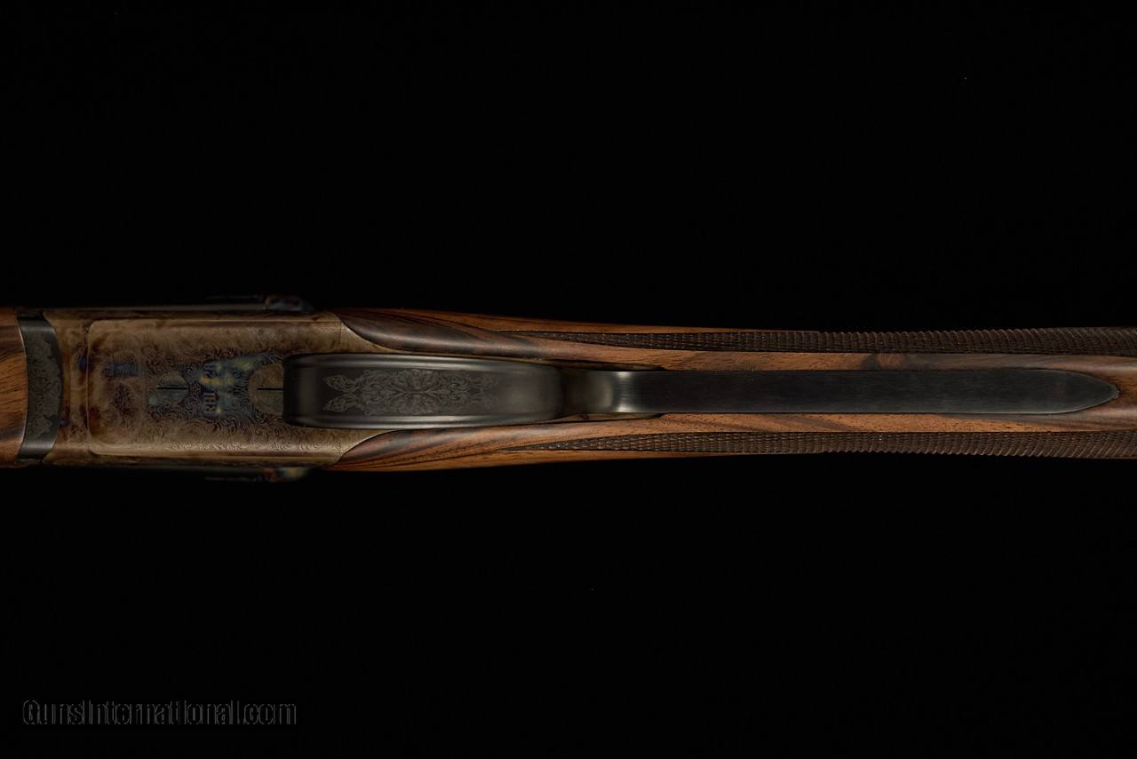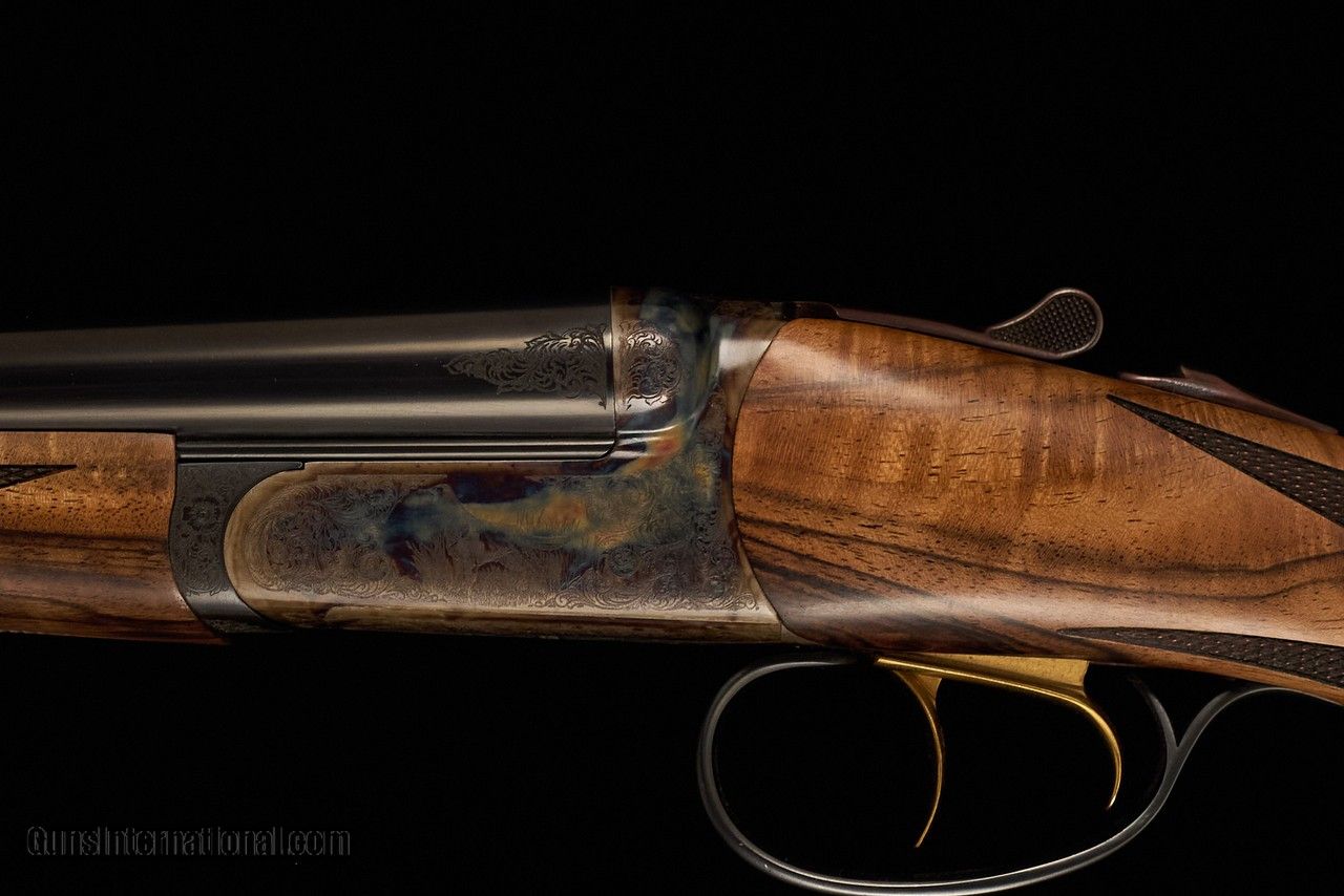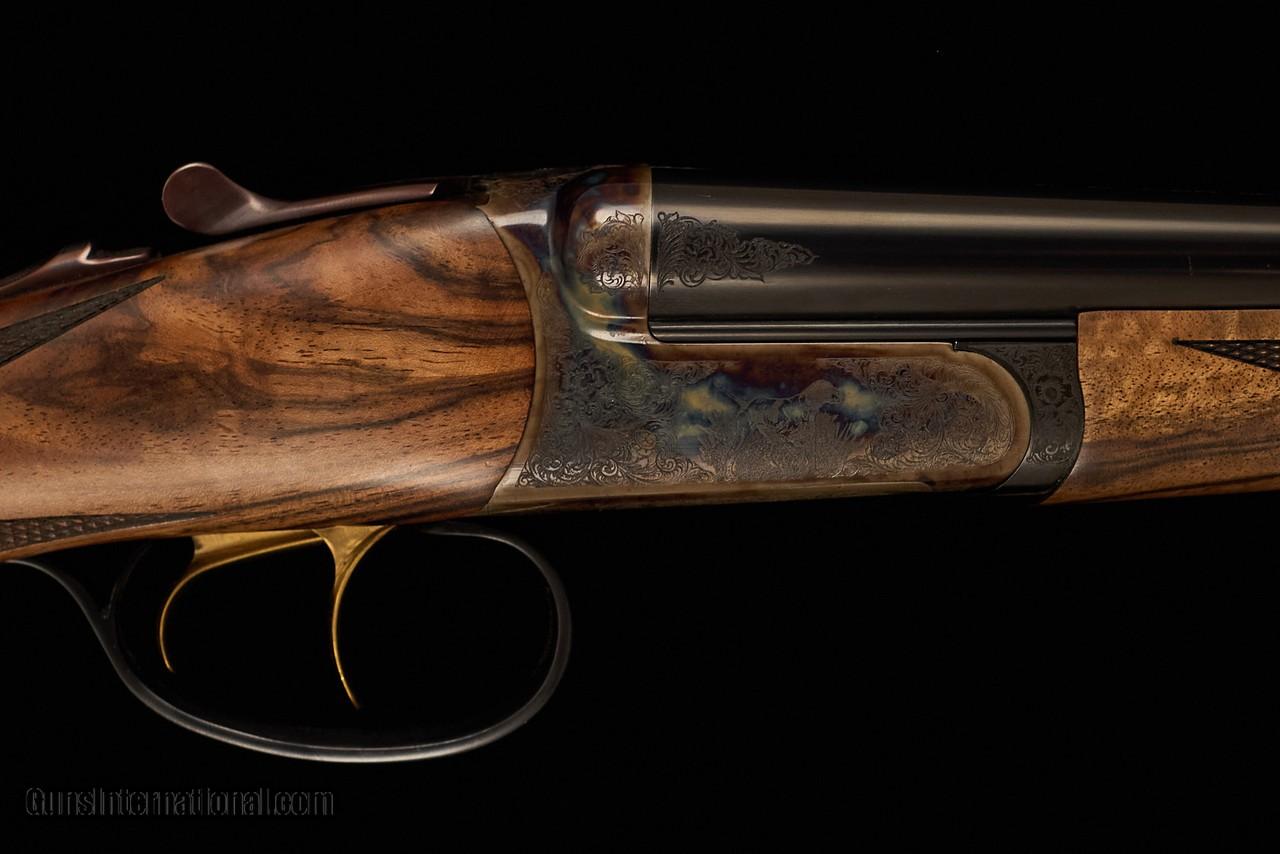 Engraved with scroll and game scene vignettes. An English pointer on the right side, an English setter on the left side, and a flushing ruffed grouse on the underside. Case color hardened action and blued furniture. Overall, the gun remains near new. Exhibition grade walnut stock. Stock and checkering rate blemish free. Pristine bores and excellent bluing on barrels. Top lever right of center, on face, and ejectors in time.