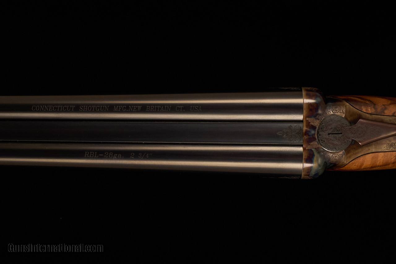 Description: Used cased CSMC RBL side by side 28 bore ejector gun with 30” barrels. The gun is choked improved cylinder and improved cylinder. Length of pull of 14 13/16” over a black plastic butt plate. Straight English style stock, gold plate double triggers, non-auto safety, round bar action, Anson & Deeley boxlock, Southgate ejectors, plain game rib with a single front brass bead, splinter forend, Anson push button forend release, and a double rolled edge trigger guard. The gun is housed in a maker’s canvas case with accessories. 2 ¾” chambers. Engraved with scroll and game scene vignettes. An English pointer on the right side, an English setter on the left side, and a flushing ruffed grouse on the underside. Case color hardened action and blued furniture. Overall, the gun remains near new. Exhibition grade walnut stock. Stock and checkering rate blemish free. Pristine bores and excellent bluing on barrels. Top lever right of center, on face, and ejectors in time. Serial #RBL003067 SOLD Manufacturer: Connecticut Shotgun MFG. Caliber Info: 28 Gauge Barrels: 30 Action: Side by Side Triggers: Double Gauge Info: 28 Gauge Stock Comb: 1 1/2 Stock Heel: 2 Stock Cast: Neutral LOP: 14 13/16 Rib: Smooth concave Chokes: IC, IC |