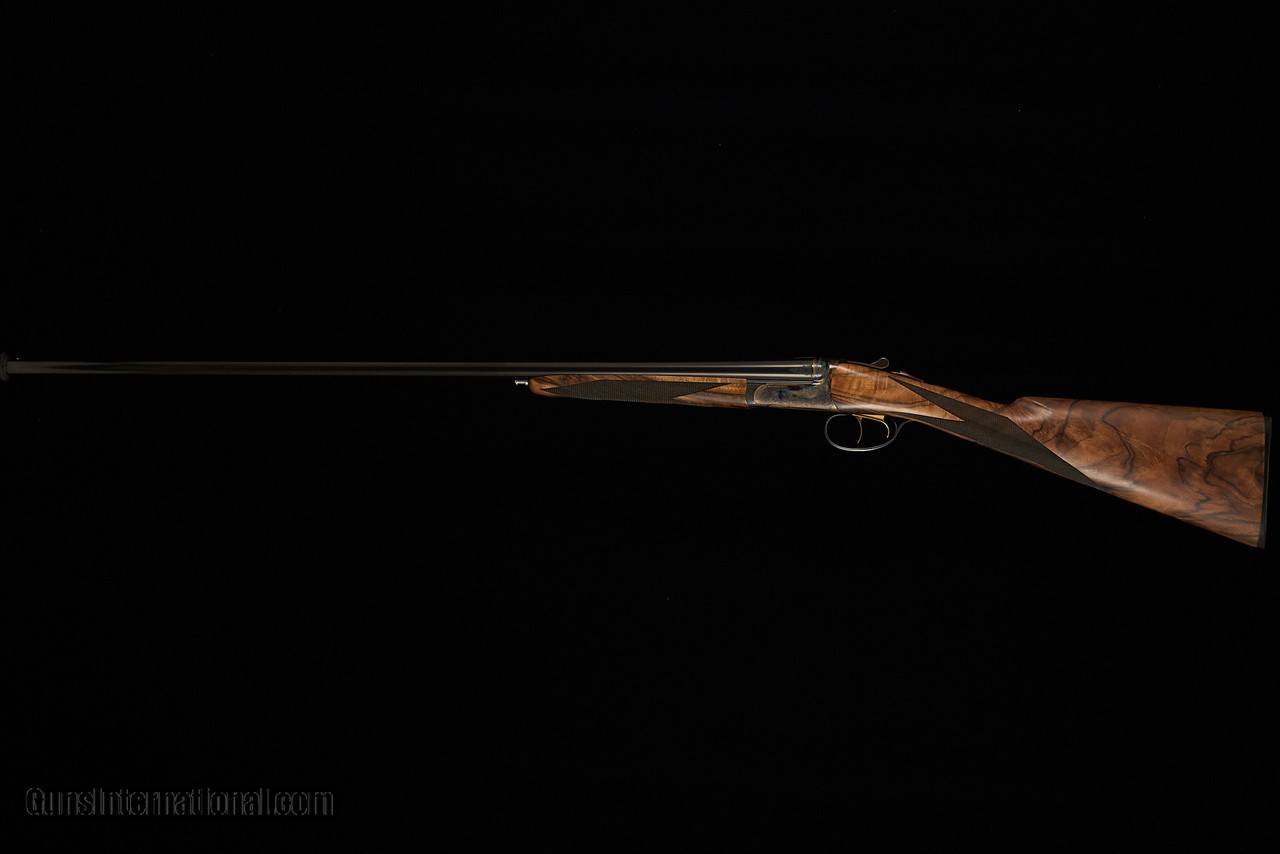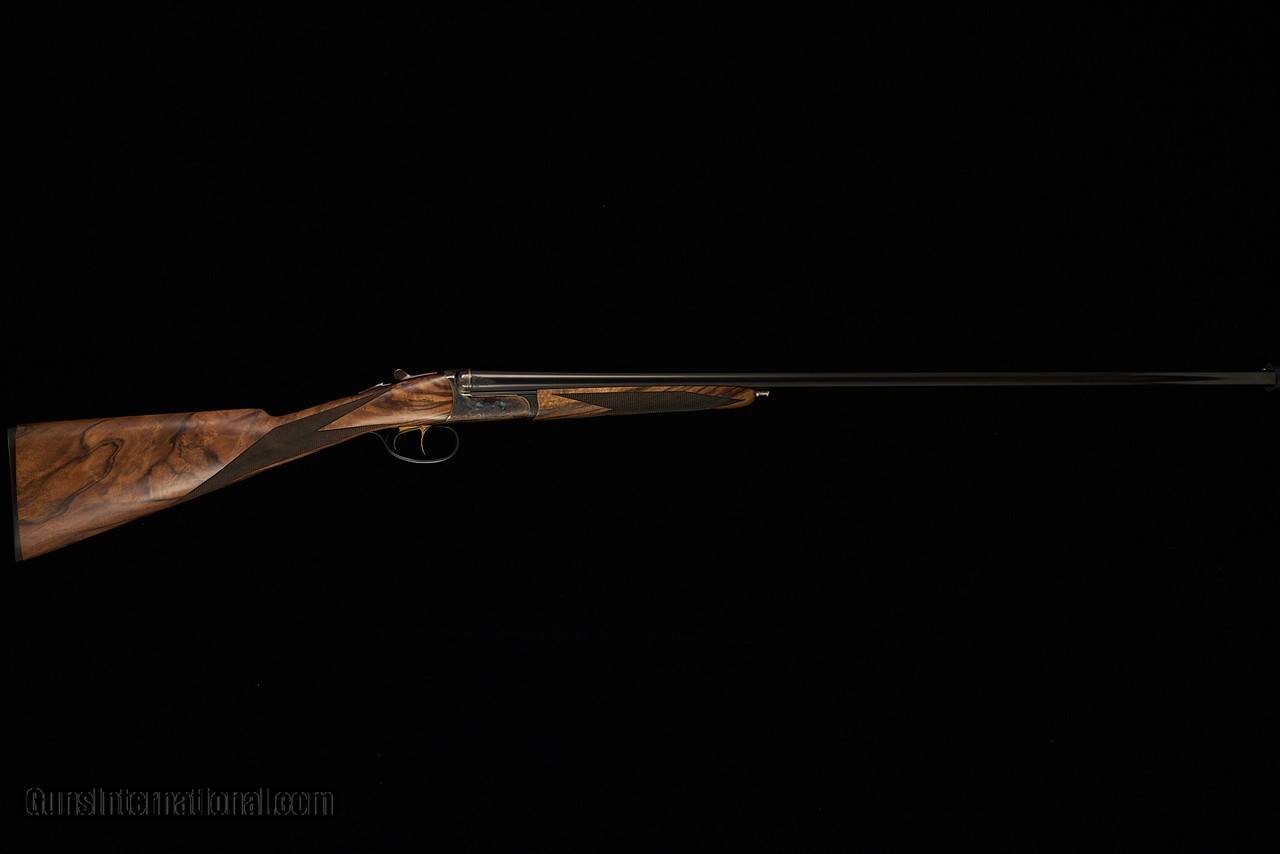 Straight English style stock, gold plate double triggers, non-auto safety, round bar action, Anson & Deeley boxlock, Southgate ejectors, plain game rib with a single front brass bead, splinter forend, Anson push button forend release, and a double rolled edge trigger guard. The gun is housed in a maker’s canvas case with accessories. 2 ¾” chambers.
