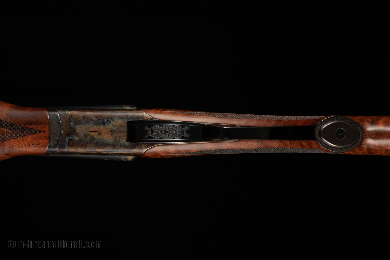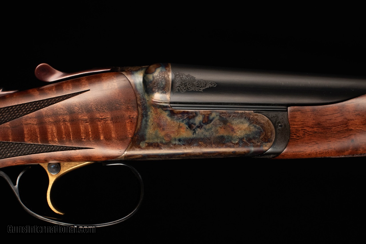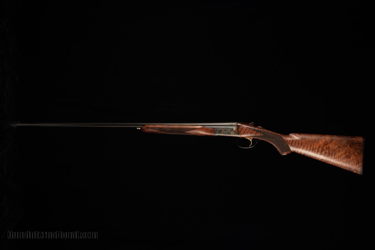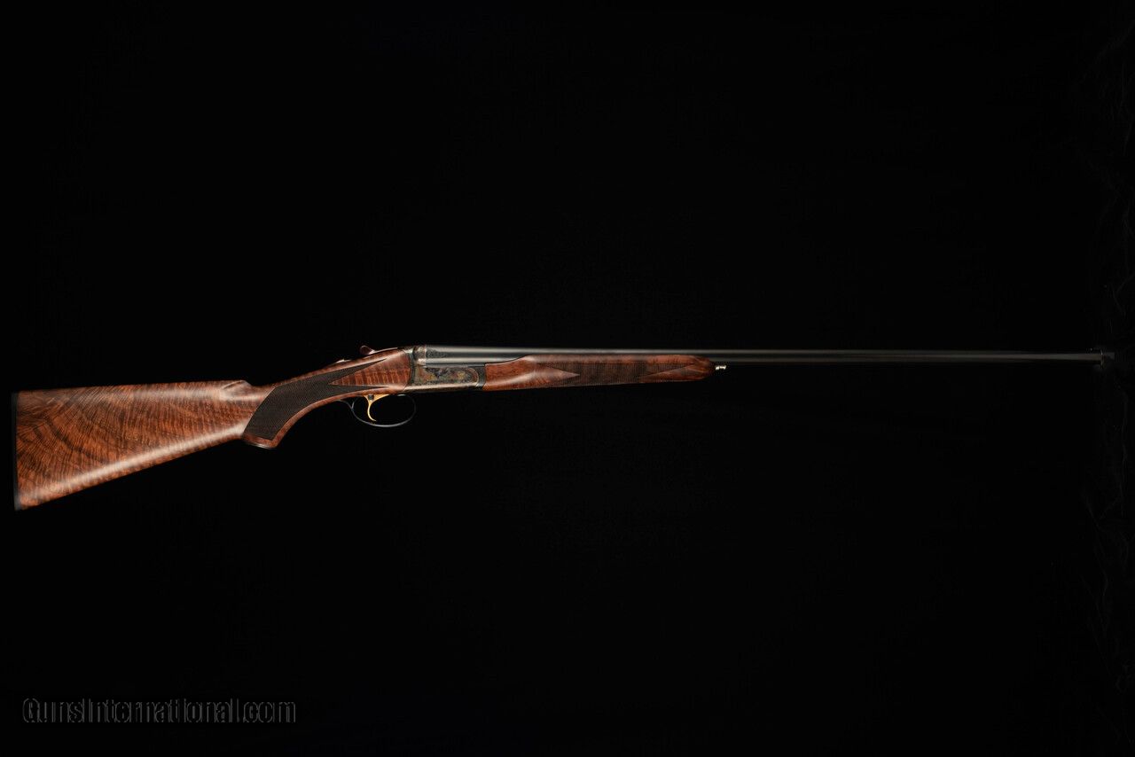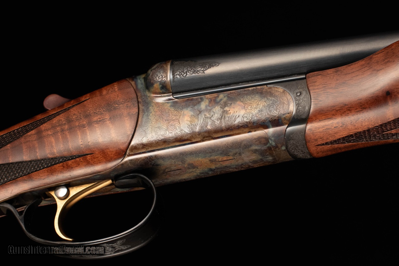 The round action RBL SxS shotgun is built to the highest of standards in our facility in New Britain, CT. Build off the successful Anson & Deeley boxlock platform, more features were added to the model such as a removable hinge pin, double bridged action, special dog or locking bolt, etc. The frames are made from a solid billet of 86-20 steel, specially engineered for each gun. This one is choked Cyl/Cyl with a single trigger, and comes in a makers fitted case