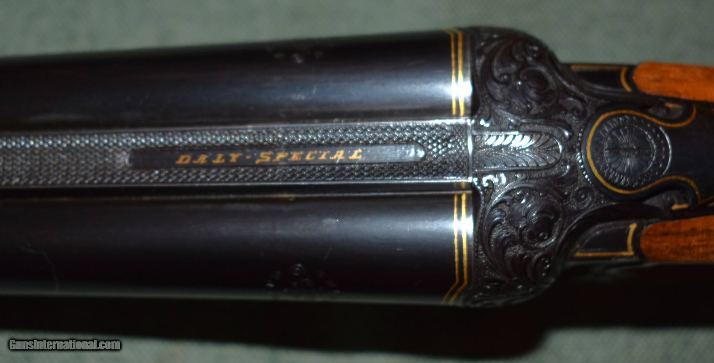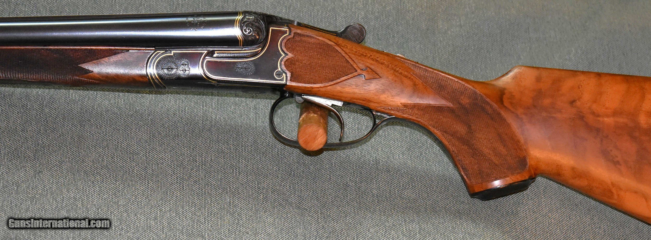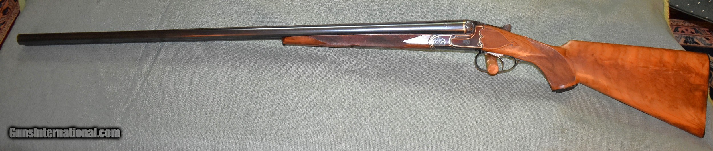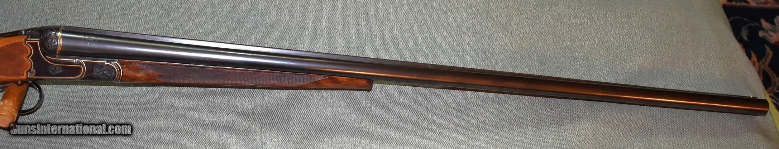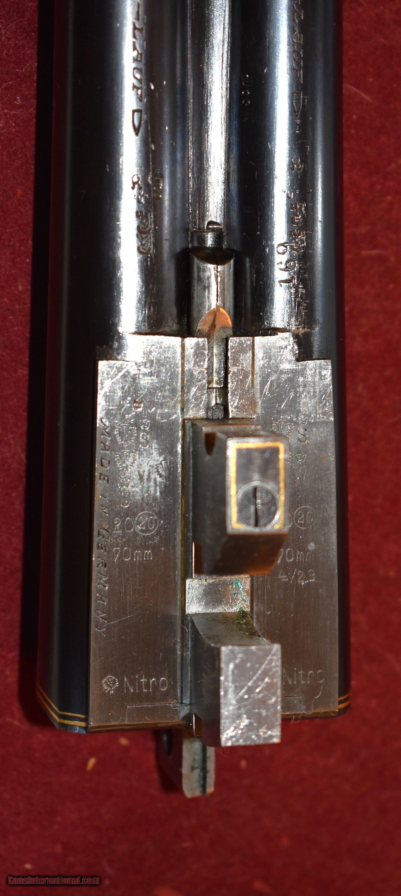 Description: A beautiful custom built 30 gauge boxlock ejector built for A.H..Heinen of Chicago. Built on a 1928 J.P.Sauer barreled action, this gun is a great example of the gunmakers art. The 30" Krupp steel barrels have 23/4" chambers and are choked improved cylinder (.008") and modified (.015"). The bores are mint and the barrels retain 99% of the blue finish. The receiver and barrels are outlined with gold wire inlays. The action has sideclips and the fences are floral engraved. The engraving on the fences is original Sauer engraving. The pistol grip stock and forend are nicely figured walnut with beautifully executed 28 line checkering. The trigger is a single selective trigger with the selector on the side of the trigger,similar to a Parker trigger. The barrels are on face and lock up tightly to the action. The stock dimensions are 1414" LOP over a horn buttplate, 11/2" at comb,and 21/2" at heel. The trigger guard tang is engraved "AH Heinen Chicago". This is a great all around upland gun or a fine clays gun. I shot clays with it last week and it absolutely vaporizes targets. A true testament to an unknown gunmakers skills. C&R eligible. SOLD Shotgun Gauge: 20 Gauge Manufacturer: Unknown Model: Custom Serial Number: 169 Barrel Length: 30 Chambers: 23/4 Ejectors: Yes Condition: mint Metal Condition: mint Wood Condition: mint Bore Condition: mint Barrel Type: Krupp Steel Action: Double Barrel Triggers: Single Selective Stock Dimensions: 141/4"x11/2"x21/2 Fore End: Splinter Butt Pad: Horn Buttplate Choke Left: Mod(.015") Choke Right: IC(.008:) Engraving: Glold Wire and Floral |