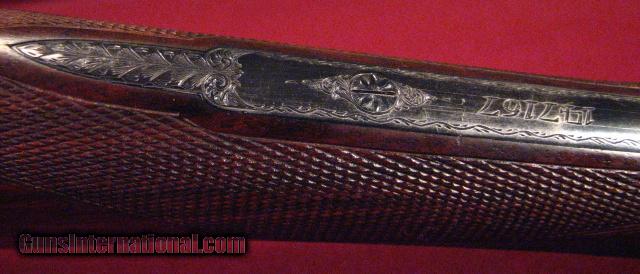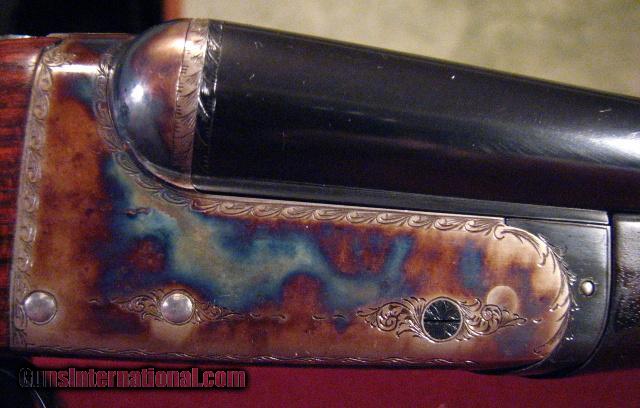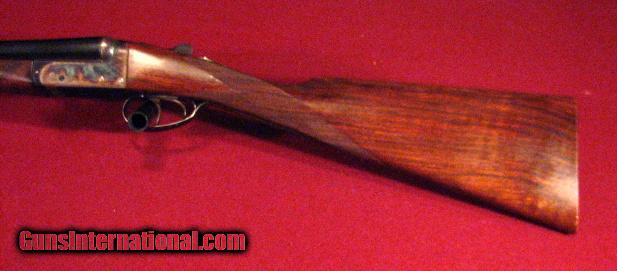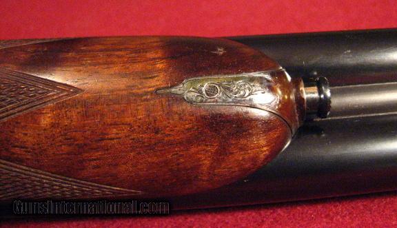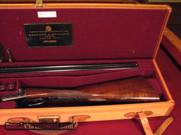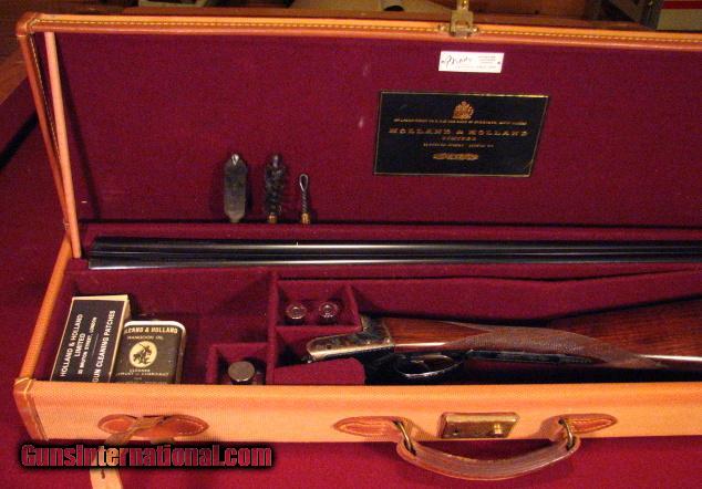 Description: Holland & Holland 33 Bruton Street, London 20 Gauge with 26" IC/F dovetail lump ejector barrels wth silver front bead. Manufactured in 1978 this is one of the Webley & Scott guns finished by Holland & Holland after they purchased Webley & Scott. Bores remain as new measuring .614 right and left. Proved .614 and 3 1/4 Tons with 2 3/4" chambers. Choked .008 right and .028 left. Case colored reciever with 20% coverage scroll and border engraving. Straight grip English stock with vacant stock oval. DAC-1 1/2" DAH-2 1/8" 14 5/8" LOP to a checkered butt. Neutral cast. Great game gun weight at 5lb 8oz Cased in its original Brady canvas and leather trunk case with Holland & Holland trade label. Also included is a wooden cleaning rod, mop, brush, and jag, oil bottle, Holland & Holland snap caps, Rangoon oil, and cleaning patches. This piece shows little use and remains in nearly new condition retaining 100% vivid case colors. Blue at 98% with slight wear on lower tang. Stock finish at 98% with a few scattered handling marks. Tight with lever well right of center. An outstanding English game gun by one of the top tier makers. SOLD |