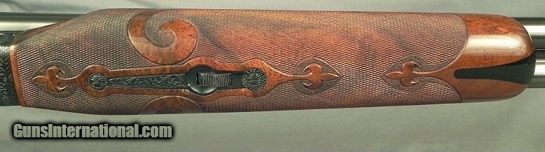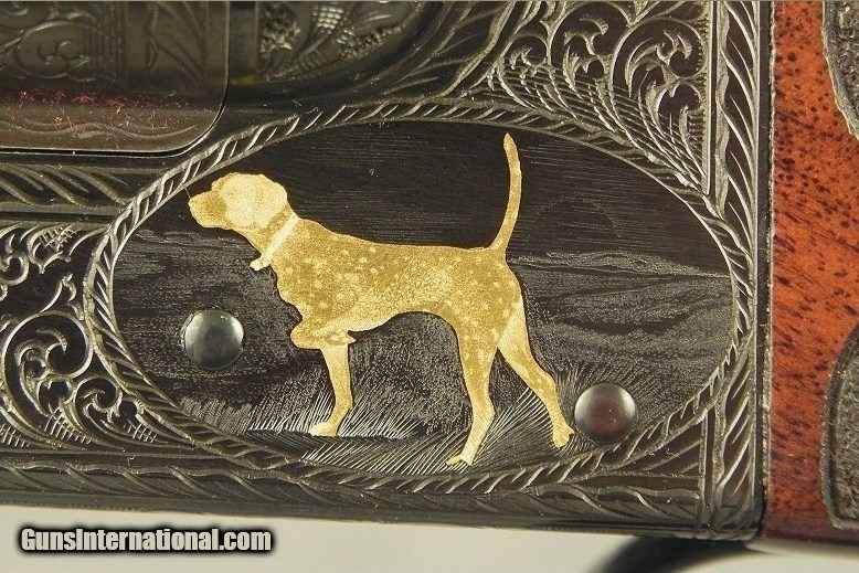 Description: #SW38729, 28 Bore Model 21 Grand American Small Baby Frame Flat Side Round Frame by CSMC That Remains in Excellent Condition with the Best Engraving seen on any CSMC's Grand Americans, 28" Ejector Vent Rib Barrels with Briley chokes at .551 .005 - .009 - .013 - .016 & .021" (Imp.Cyl. - Skt.II - Mod. - Imp.Mod. & Full), 2 3/4" chambers, Single selective trigger, A slender beavertail forend, Open Pistol grip stock at 14 5/8 x 1 9/16 x 2 1/16" over a B Carved butt with checkering and fleur-de-lis's, Great Cast-Off for the right hand, True baby frame weight at 5 lbs. 12 oz., A standard frame Model 21 in 28 bore is over a pound heavier, Total B-Carved checkering on the grip and forend; Outstanding wood with great feather, color and contrast; The best engraving I have seen on a CSMC Grand American with a very accurate Pointer, Setter, Woodcock and Dove in Gold inlays with well-cut scroll, The grip cap with Grand American in Gold, The scroll coverage is very accurate with 90% coverage, It retains 99% original blue on the receiver, The original barrel blue at 98%, The buttstock and forend remain at 98%, The checkering remains at 100%, The barrels inside & out remain as new. It is cased in the makers leather trunk with a canvas cover, cleaning gear and a trade label. This gun is a dream in the hand with near perfect cast-off, ideal frame and grip size, nice balance and neat weight at 5 lbs. 12 oz. This is a very nice, very American SxS that is a fine piece of excellent engineering and I give Tony kudos for doing it on our soil. SOLD |