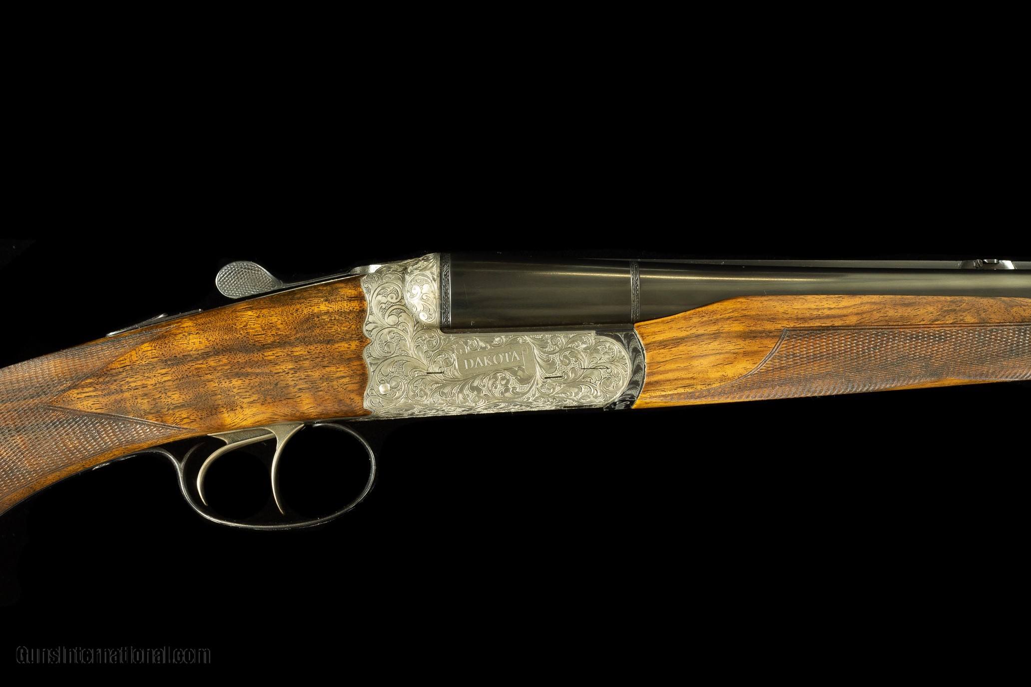 Description: Dakota Arms 20 gauge with manufacturer’s case. 25” bbl with beaver tail forearm, dbl triggers, and ejectors. Super rare model with immaculate engraving. Wonderful semi pistol grip stock that is finely grained with a cheek plate. Slug gun. SOLD Ejectors: Ejectors Triggers: Double Trigger Stock Comb: 1-7/16 Stock Heel: 2-3/8 Fore End: Beavertail LOP: 14-3/4 Chokes: IC/CYL |