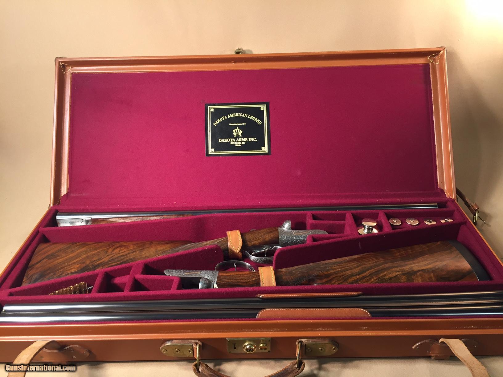 Description: Matched Pair of Dakota Arms 12g SxS with leather case and all accessories. One gun is like new in 98% condition with a leather covered pad. The other gun is missing stock oval and the butt is finished to plain wood in need of checkering or leather covered pad. Both guns have 28" barrels choked IC/M. Double triggers. Auto safe and eject.. Double triggers Call for more photos. SOLD |