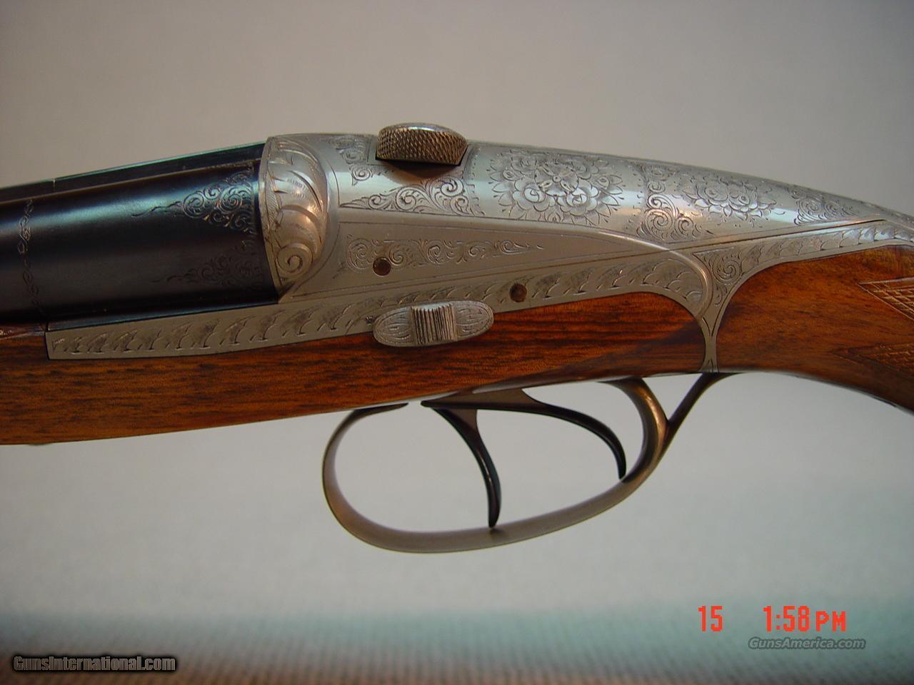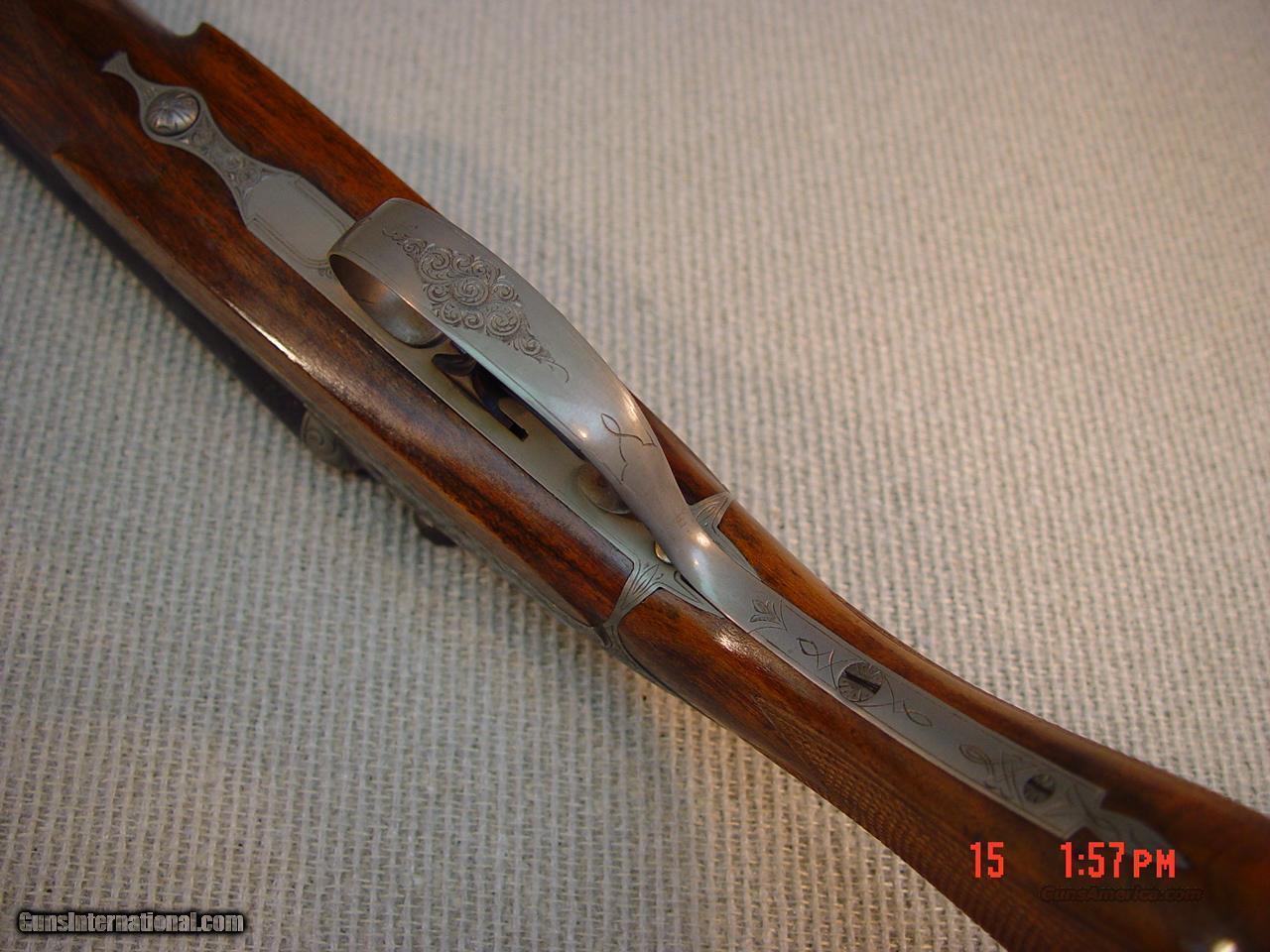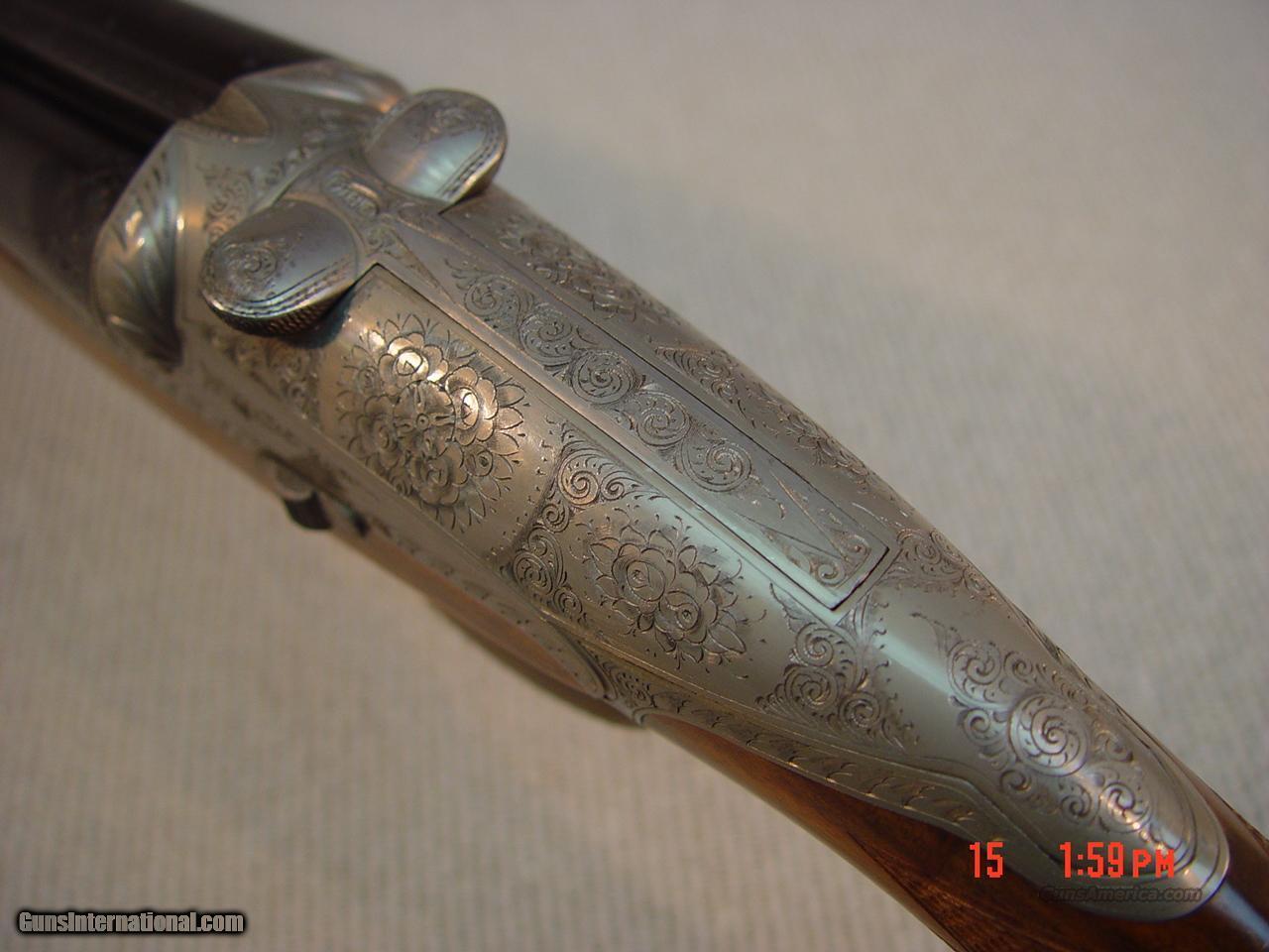 Description: APPEARS TO BE NEW & UN-FIRED! DARNE SIDE X SIDE SLIDING BREECH SHOTGUN ... 20 gauge ... 25 1/2" matted rib barrels ... 2 3/4" chambers ... choked LtMod/Full ... weight 5 lbs 12 oz ... 41 1/4" overall ... LOP 14 3/8" ... drop comb 1 1/2" drop heel 2 3/8" ... cast neutral ... non-automatic safety ... extractors ... double triggers. The rib is stamped "QHS Darne Saint Etienne France" and the rib has scroll engraving for 2" from the chambers. The frame, trigger guard and action are all French grey with fine rosette & flower engraving that shows no wear. The carmel colored, French walnnut stock has a rounded pistol grip and splinter forearm which are covered with crisp, like new checkering. The forearm tip features a horn tip. By their nature, these guns are extremely strong and long lasting. This one would be a fine upland bird gun to be passed down for generations to come. Call with any questions and see our other listings for ... "Only the best!" SOLD |