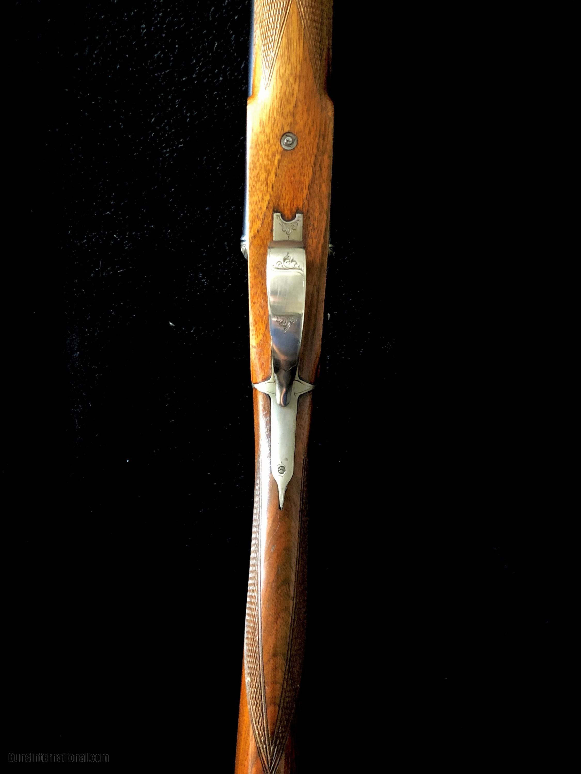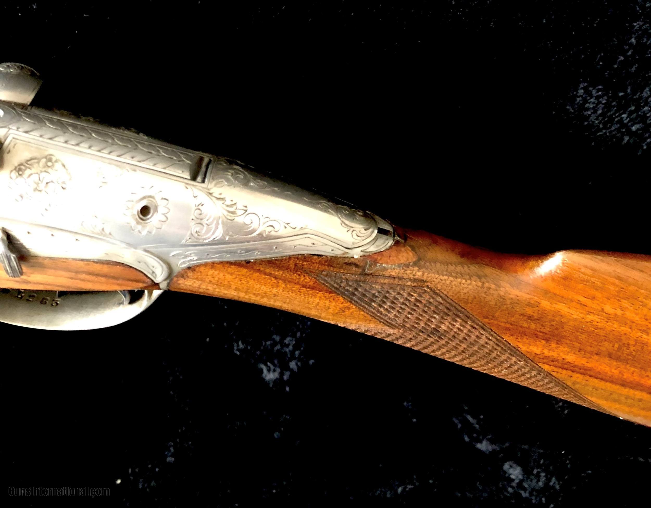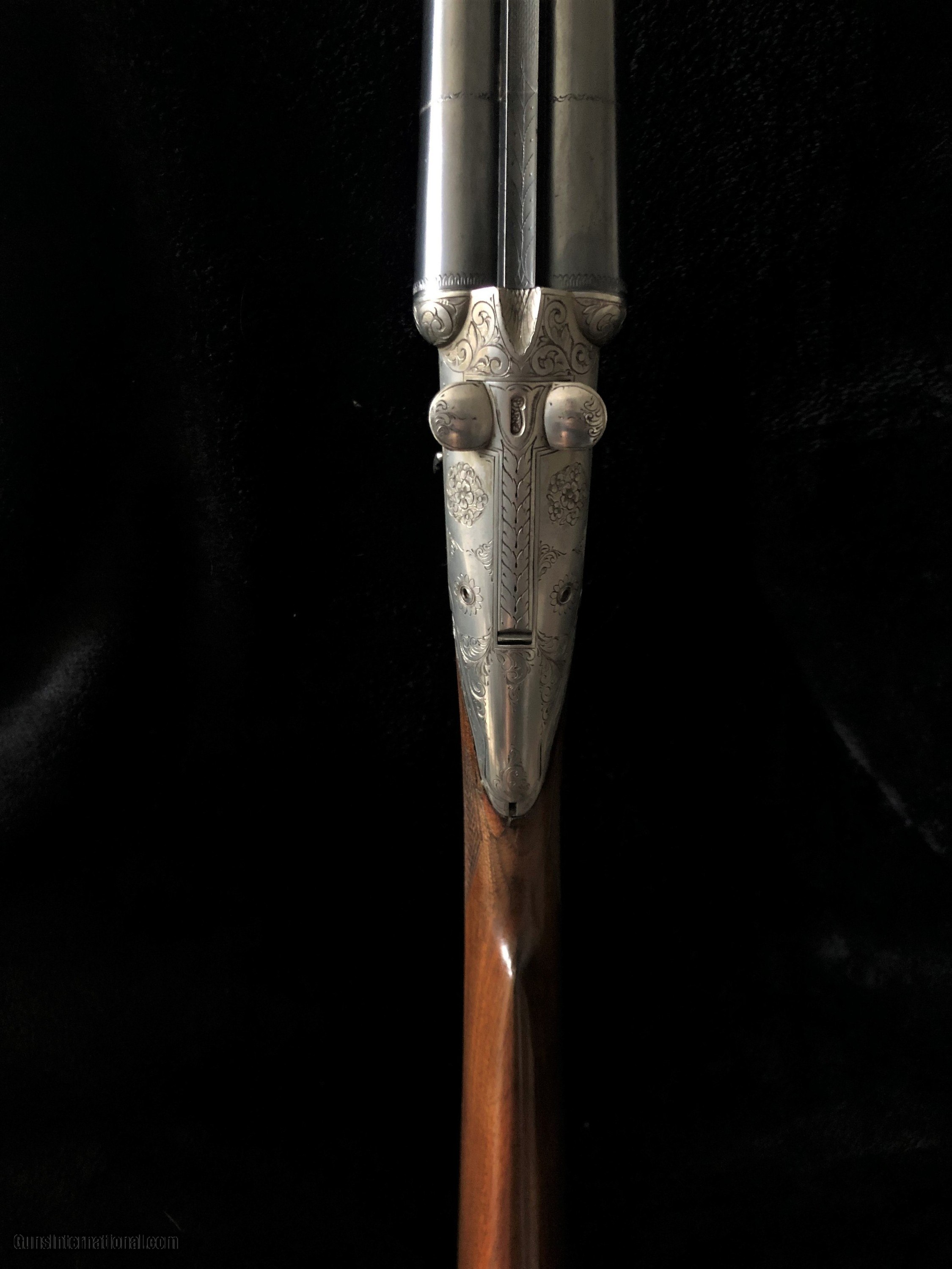 Description: Price Reduced!!!!!!! A nice 16 bore Darne sliding-breech ejector shotgun. 27 1/2" barrels IC & Modified chokes Concave rib with bead foresight 2 3/4" chambers Scroll and Bouquet engraved action 14 7/8" LOP over a thin wooden extension. Original black Darne butt cap included and can be easily re-installed 2 3/8" DAH, 1 9/16 DAC, cast off for a right hand shot Bright and shiny barrels with good minimum wall thicknesses of 0.032" (RB) and 0.031" (LB) No 6L 283 This is a very little used and rare 16GA Darne with great dimensions for a modern shot. Please see photos, there is a small surficial repair behind the breech. Cast off for a right hand shot. SOLD Shotgun Gauge: 16 Gauge |