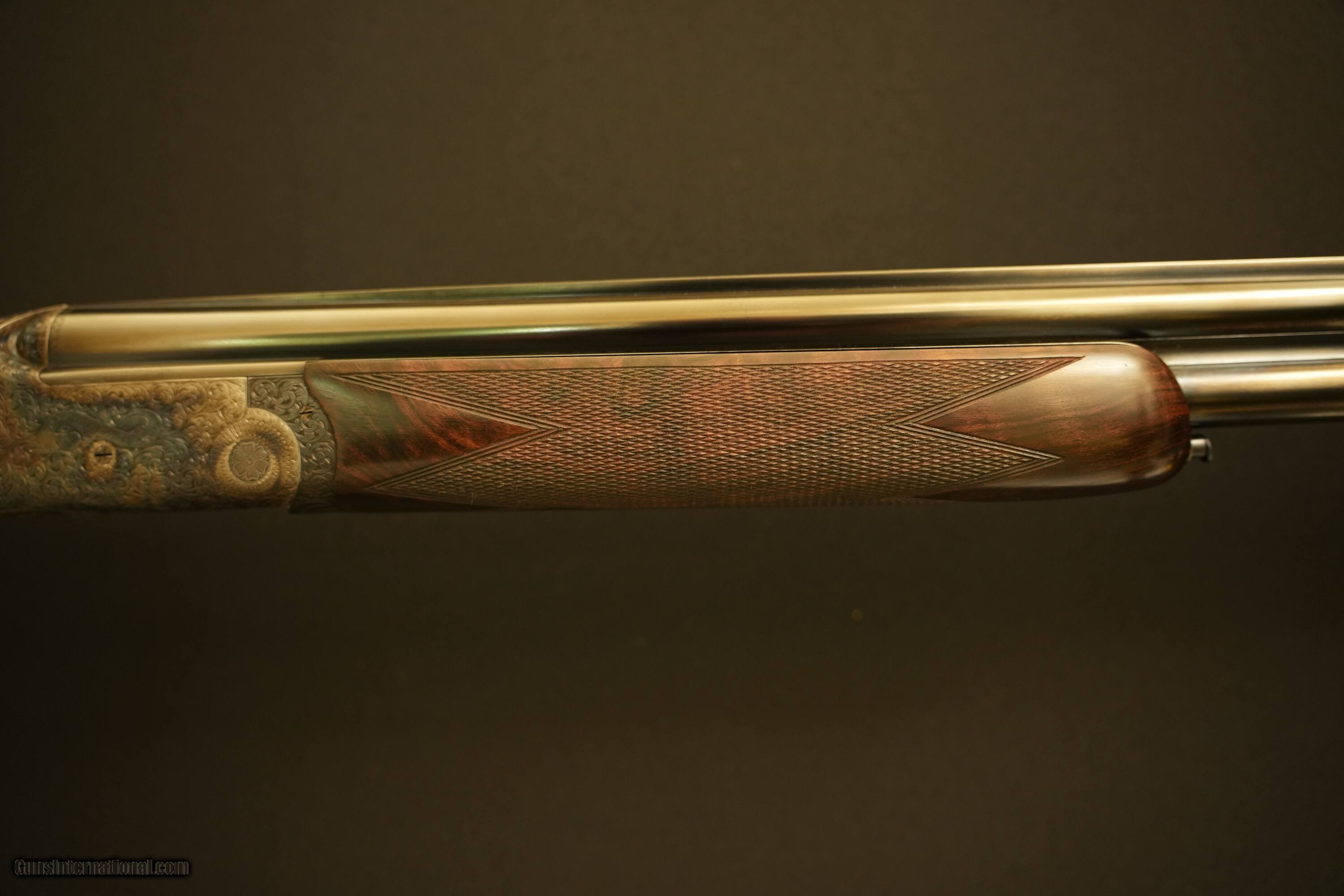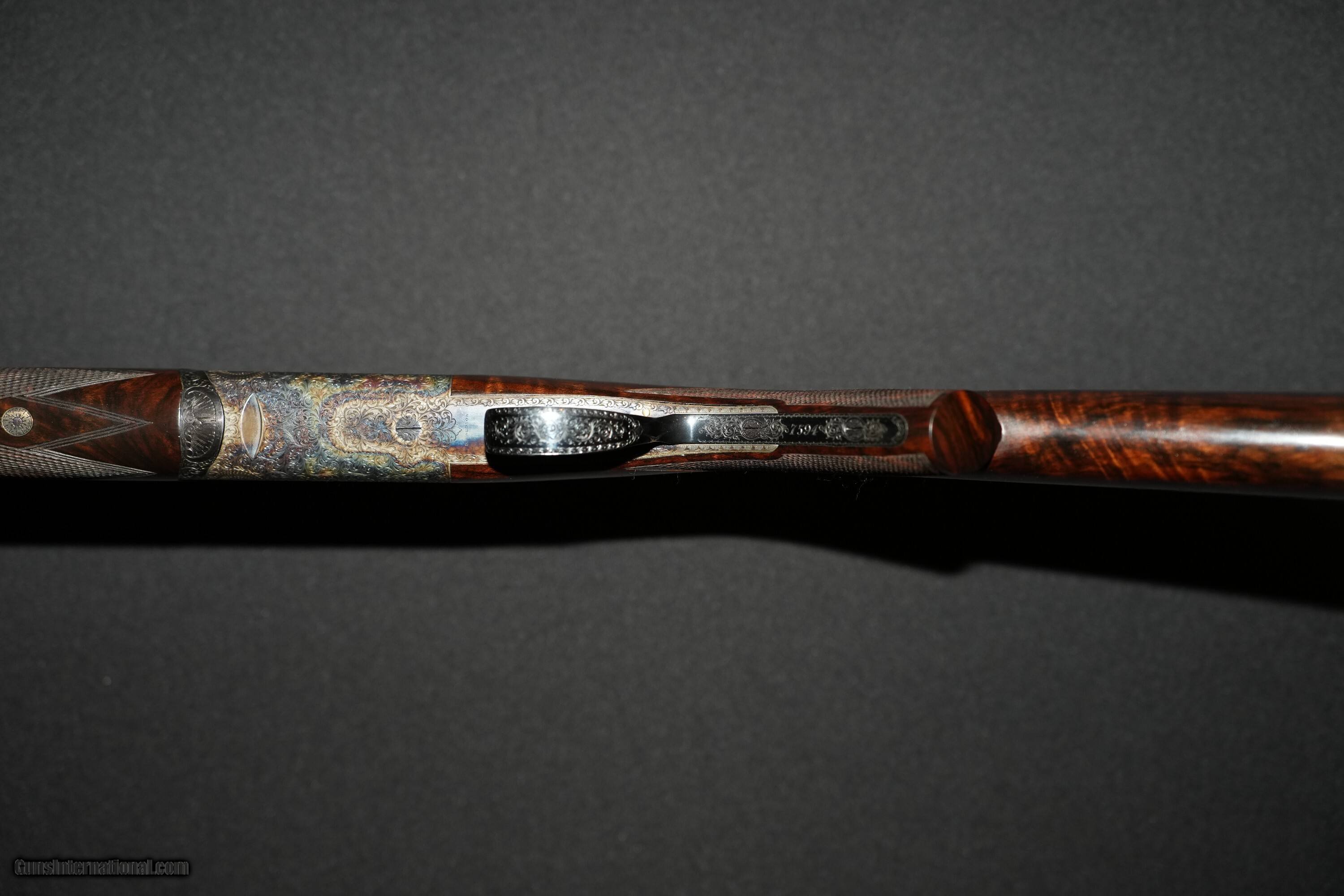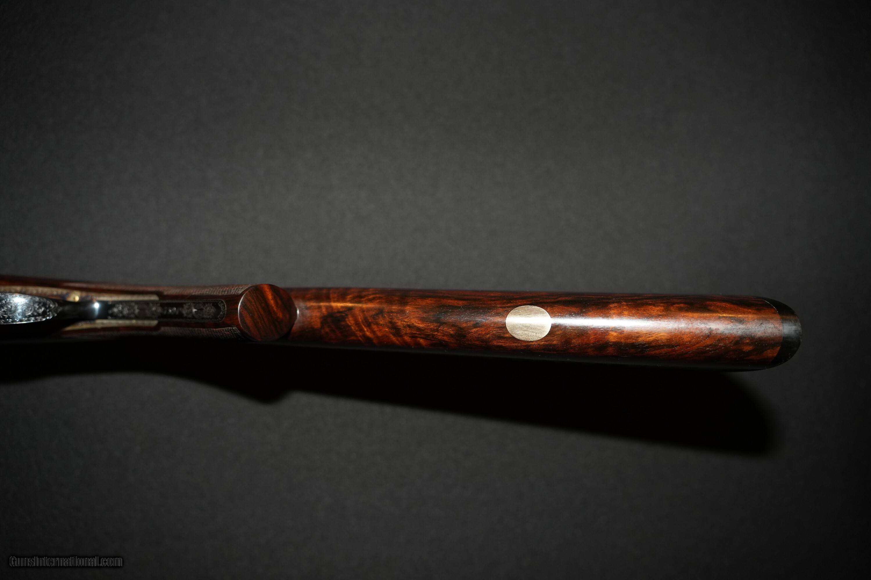 Description: Priviate collector offering a cased David McKay Brown over and under 20 bore ejector gun with 28” file-cut solid rib barrels. Gun is #1 of a pair that owner has decided to split. Single mechanical non-selective trigger, round bar trigger plate action, non-auto safety, single brass front bead, gold inlaid “SAFE” ahead of the DMB style safety catch, maker’s name engraved in banners on both sides, Anson push button forend release, and a blank gold oval. Gun is choked .007 (1/4-impr cyl) and .008 (1/4-impr cyl.) The gun was completed and proofed in London in 1998 with 2 3/4" chambers having a proof bore 15.6mm (0.615") with current bore diamter of 0,617" in both barrels. Receiver is engraved and signed by Dave Hudson with medium scroll over entire receiver that remains sharp as new. Case color hardened receiver remains with 98% finish. Barrel black and furniture are in excellent condition with 100% finish intact. Well figured exhibition walnut stock with prince of wales grip and checkered bone butt plate, 14 3/8 LOP, DAC 1 5/8", DAH 2 3/8". Wood and checkering remain in over all excellent condition. Top lever slightly right of center, barrels lock-up tight on face and ejectors in time. Shotgun Gauge: 20 Gauge Manufacturer: David McKay Brown Model: Over/Under Round Trigger Plate Action Serial Number: 7594 Barrel Length: 28.0 Bore Info: 20 Bore Chambers: 2.75 Ejectors: Auto Ejector Condition: Excellent Metal Condition: Excellent Wood Condition: Excellent Bore Condition: Excellent Barrel Type: Over/Under Action: Round Trigger Plate Triggers: Single Stock: Prince of Wales Stock Comb: 1 5/8 Stock Heel: 2 3/8 LOP: 14 3/8 Rib: File Cut Solid Rib Finish: Case Color Hardened Weight: 6lbs-5oz Sights: Brass Front Bead Manufacture Date: 1998 Chokes: Fixed Choke Left: Top 0.007" Quarter Choke Right: Bottom 0.008" Quarter Engraving: Full Medium Scroll Case: Leather Travel Case Item Location: Oregon Proof:Nitro: London proof 15.6 mm Minimum Wall Thickness Left: Top 0.027 Minimum Wall Thickness Right: Bottom 0.026 Price: $49,500.00 Pay with