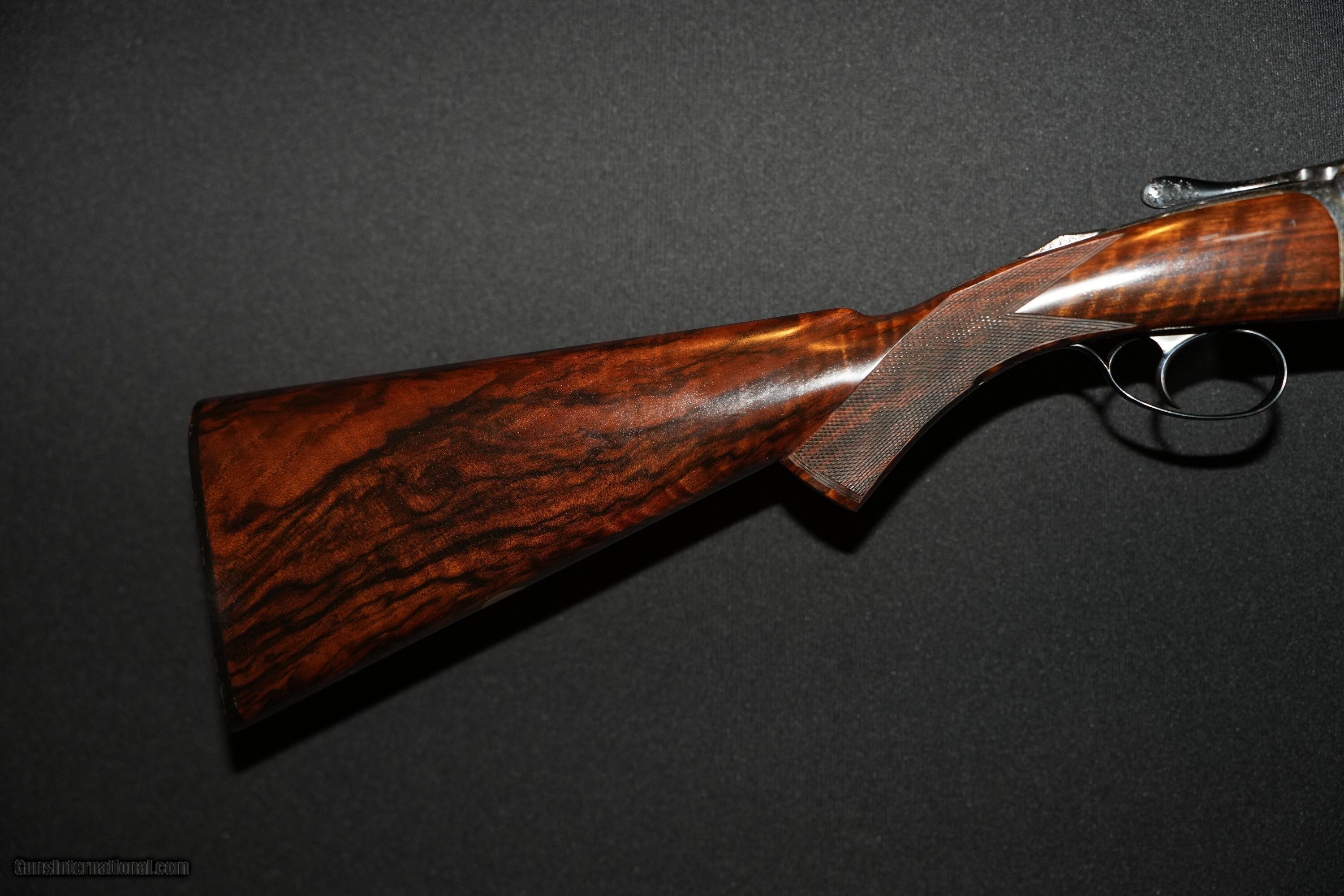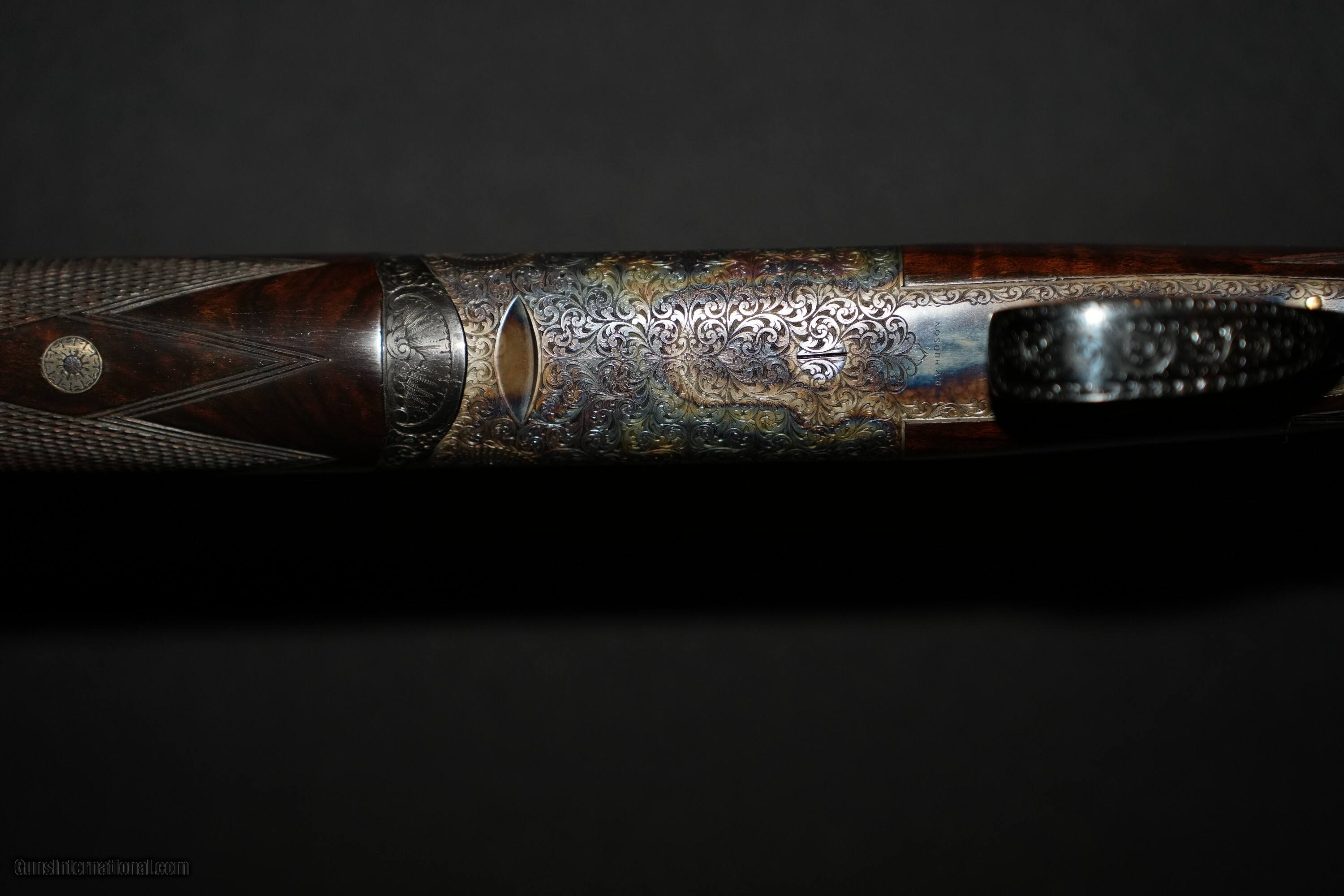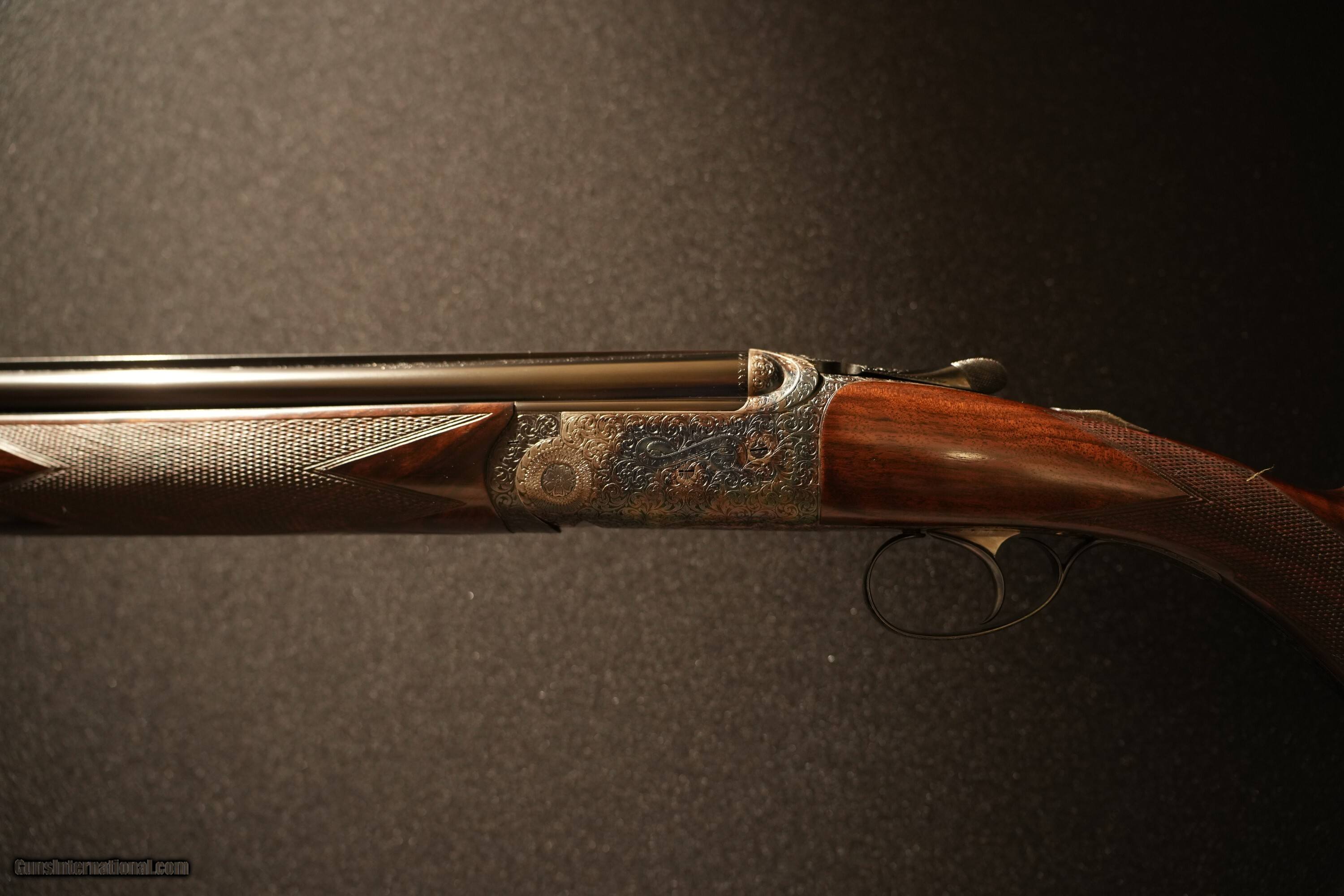 Description: Priviate collector offering a cased David McKay Brown over and under 20 bore ejector gun with 28” file-cut solid rib barrels. Gun is #1 of a pair that owner has decided to split. Single mechanical non-selective trigger, round bar trigger plate action, non-auto safety, single brass front bead, gold inlaid “SAFE” ahead of the DMB style safety catch, maker’s name engraved in banners on both sides, Anson push button forend release, and a blank gold oval. Gun is choked .007 (1/4-impr cyl) and .008 (1/4-impr cyl.) The gun was completed and proofed in London in 1998 with 2 3/4" chambers having a proof bore 15.6mm (0.615") with current bore diamter of 0,617" in both barrels. Receiver is engraved and signed by Dave Hudson with medium scroll over entire receiver that remains sharp as new. Case color hardened receiver remains with 98% finish. Barrel black and furniture are in excellent condition with 100% finish intact. Well figured exhibition walnut stock with prince of wales grip and checkered bone butt plate, 14 3/8 LOP, DAC 1 5/8", DAH 2 3/8". Wood and checkering remain in over all excellent condition. Top lever slightly right of center, barrels lock-up tight on face and ejectors in time. Shotgun Gauge: 20 Gauge Manufacturer: David McKay Brown Model: Over/Under Round Trigger Plate Action Serial Number: 7594 Barrel Length: 28.0 Bore Info: 20 Bore Chambers: 2.75 Ejectors: Auto Ejector Condition: Excellent Metal Condition: Excellent Wood Condition: Excellent Bore Condition: Excellent Barrel Type: Over/Under Action: Round Trigger Plate Triggers: Single Stock: Prince of Wales Stock Comb: 1 5/8 Stock Heel: 2 3/8 LOP: 14 3/8 Rib: File Cut Solid Rib Finish: Case Color Hardened Weight: 6lbs-5oz Sights: Brass Front Bead Manufacture Date: 1998 Chokes: Fixed Choke Left: Top 0.007" Quarter Choke Right: Bottom 0.008" Quarter Engraving: Full Medium Scroll Case: Leather Travel Case Item Location: Oregon Proof:Nitro: London proof 15.6 mm Minimum Wall Thickness Left: Top 0.027 Minimum Wall Thickness Right: Bottom 0.026 Price: $49,500.00 Pay with