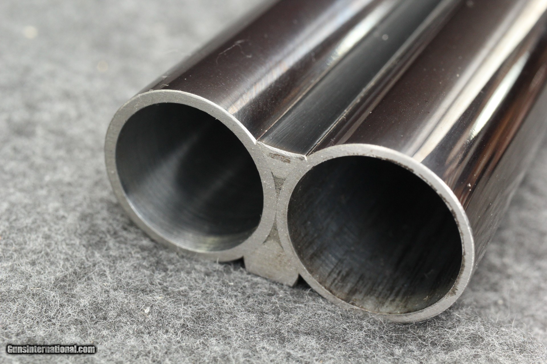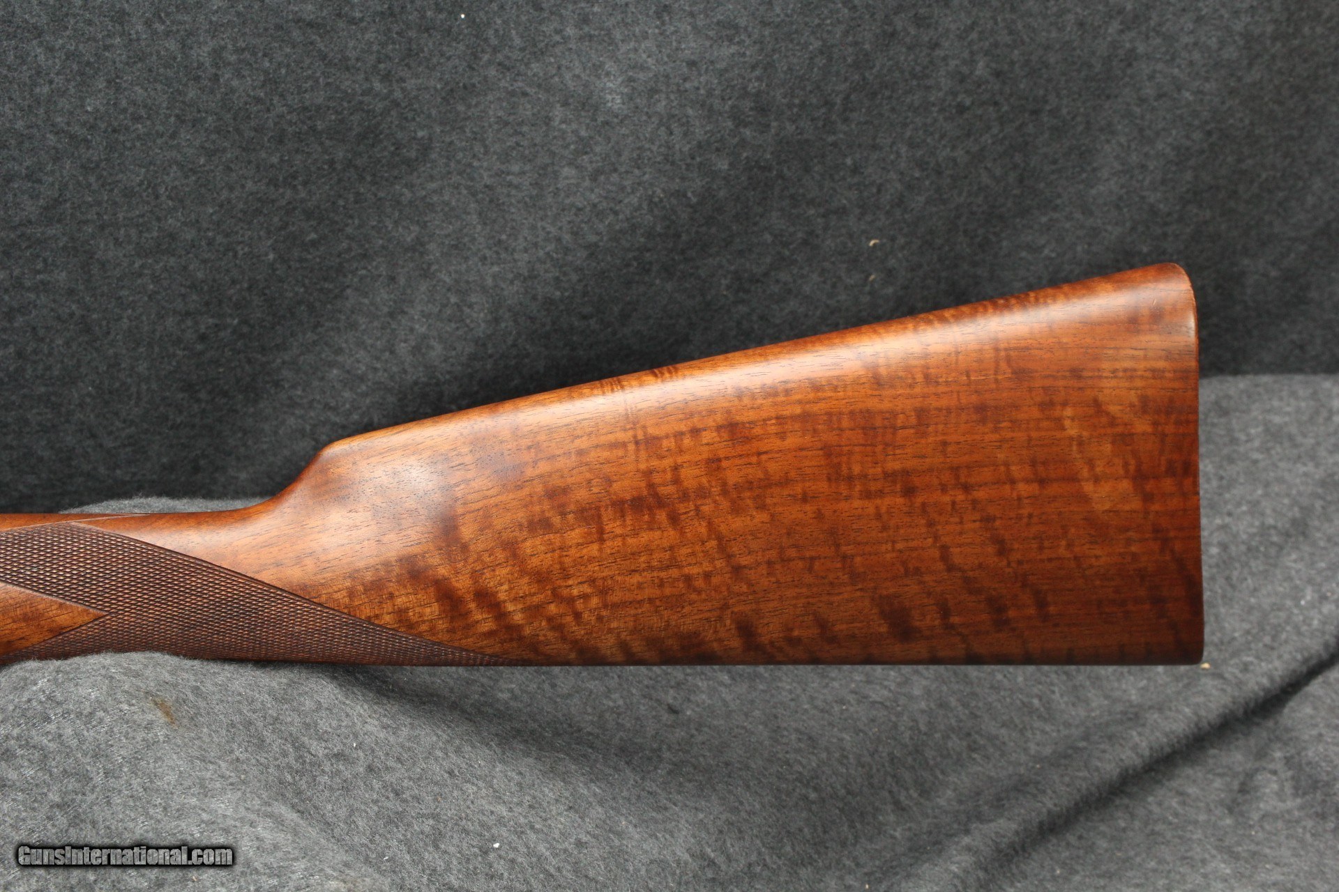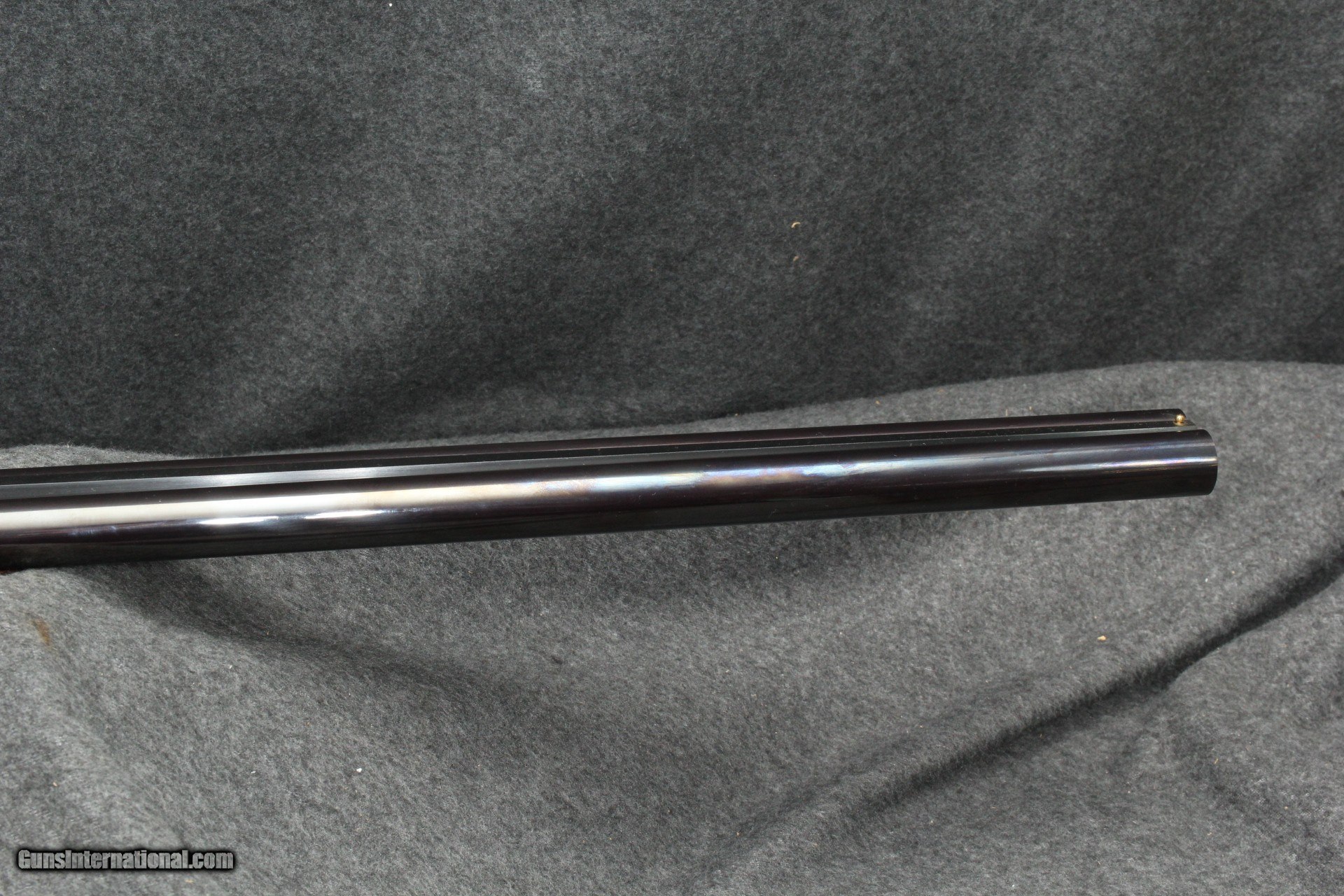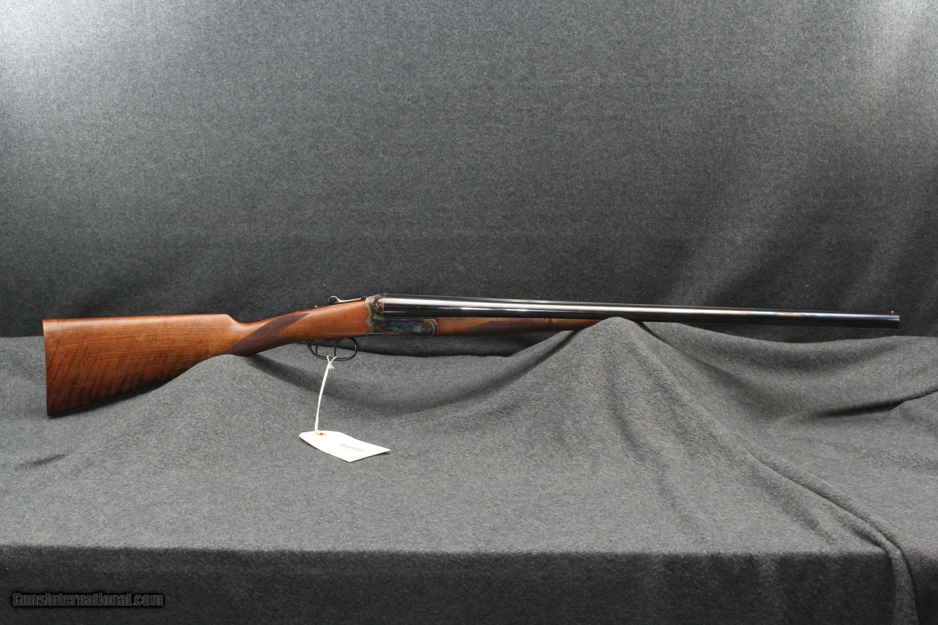 Description: 12ga, 3" chambers, 26" barrels, fixed choke (full/modified). Double trigger, boxlock, ejectors, non-automatc tang safety. Overall in excellent condition. Oil finished forend with cut checkering shows little to no wear. Moderately figured buttstock shows little to no wear. Finished wood butt (no recoil pad). Blue barrels, 95%+ finish remains. Case color action, retains 95%+ finish with 20% open scroll engraving. Trigger guard retains 95% blue with 20% open scroll engraving. English straight grip stock with cast off (right hand shooter). LOP to wood 14.5". More photos on request. Please add $50.00 for shipping and insurance. SOLD Shotgun Gauge: 20 Gauge |