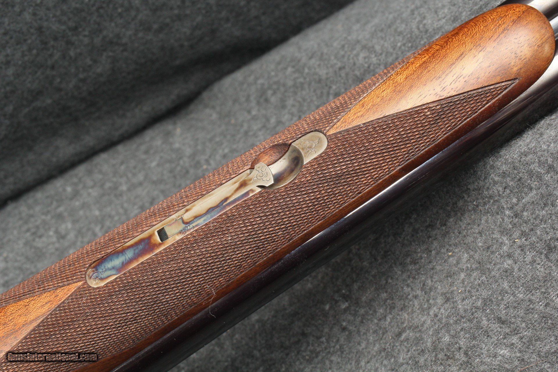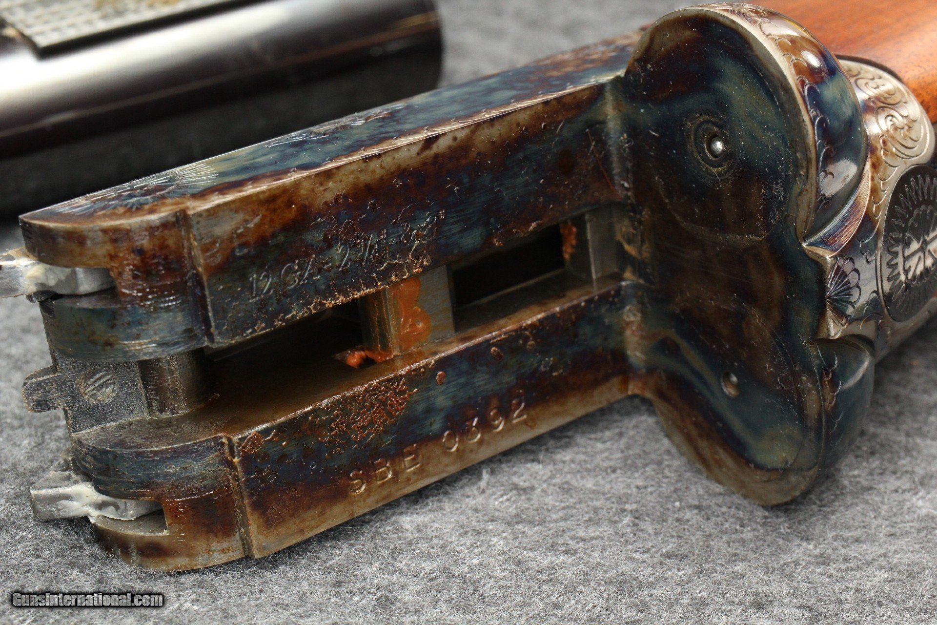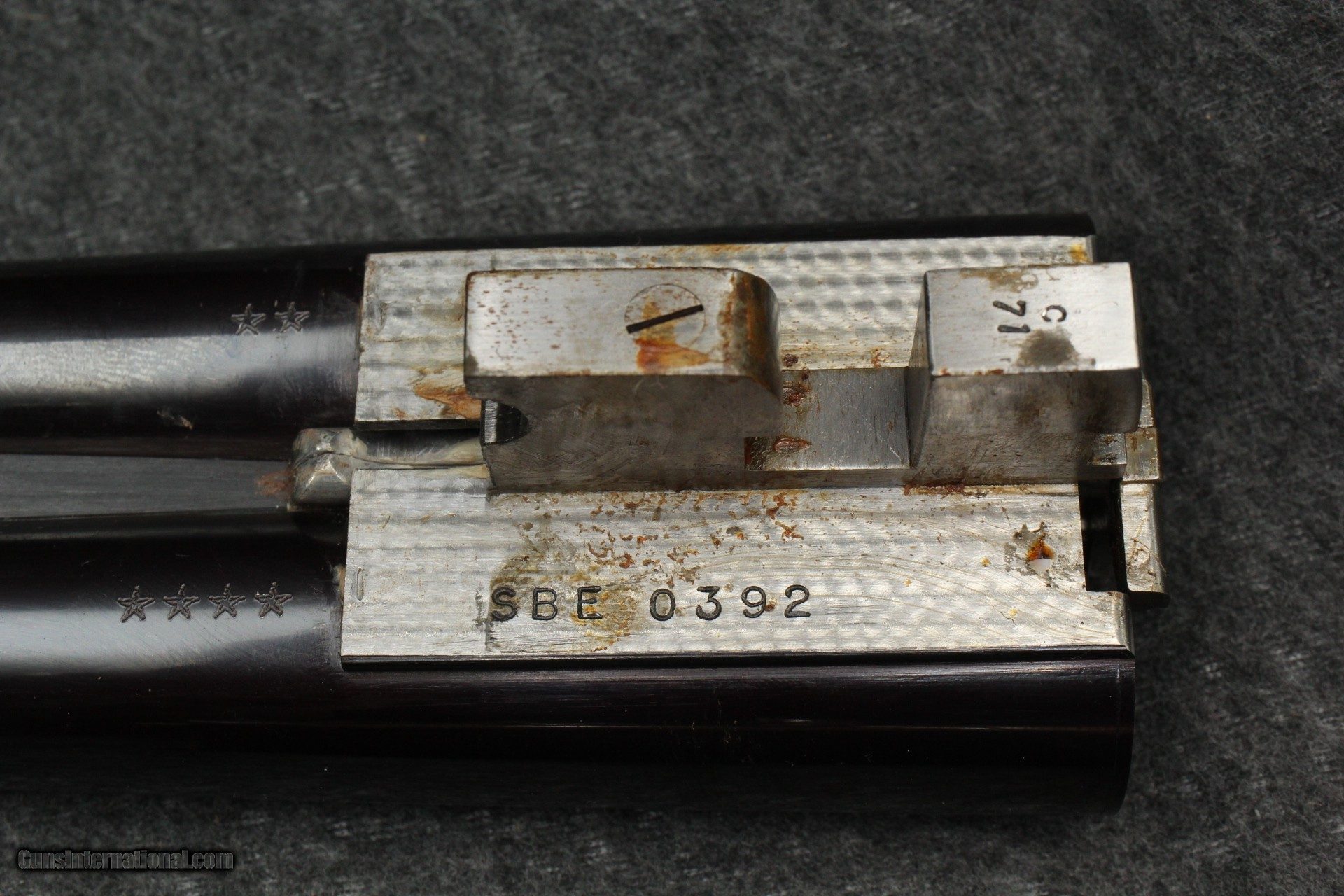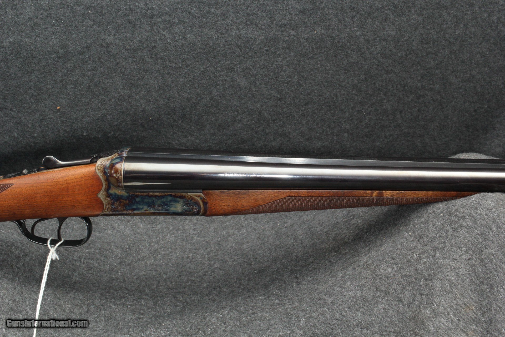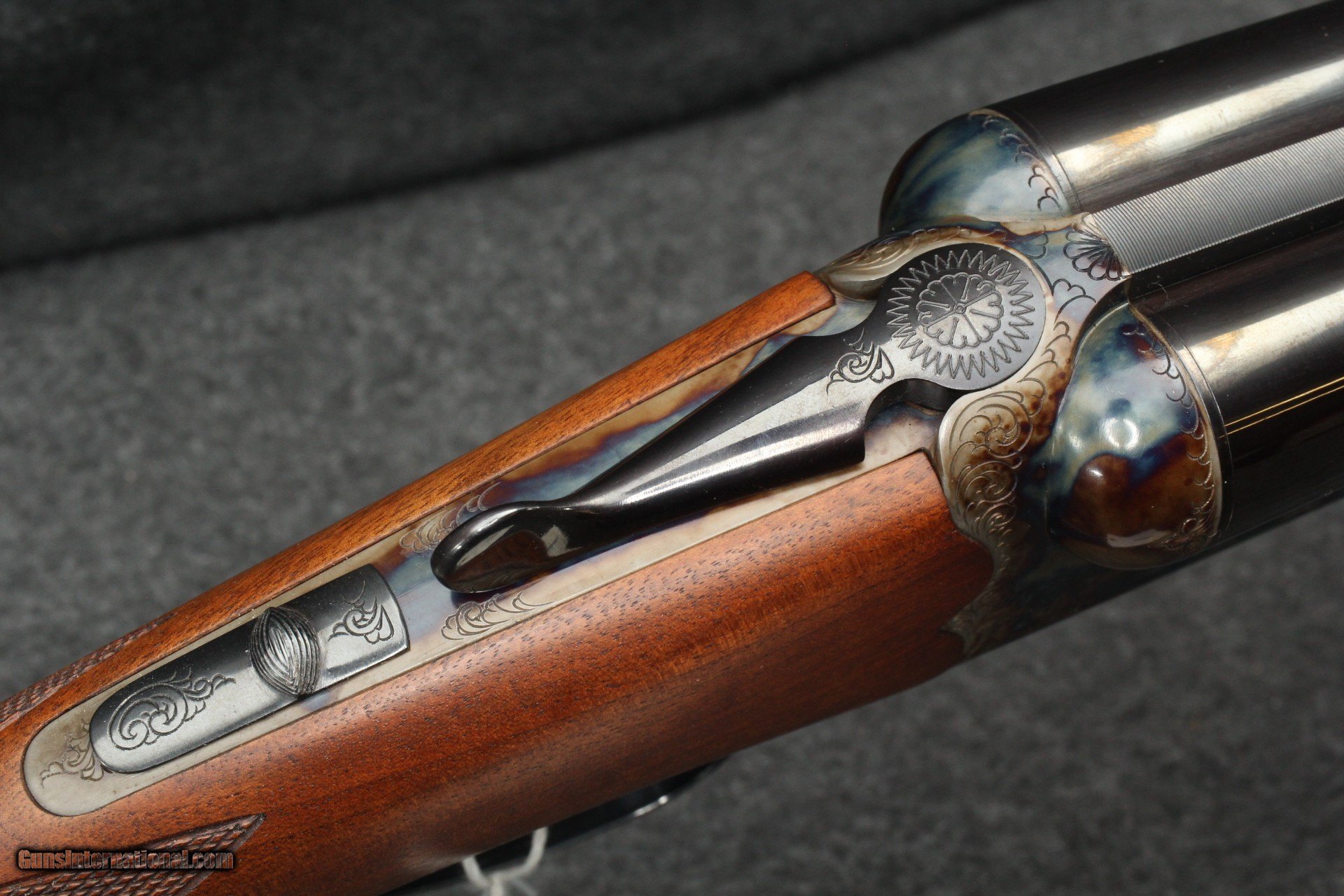Description: 12ga, 3" chambers, 26" barrels, fixed choke (full/modified). Double trigger, boxlock, ejectors, non-automatc tang safety. Overall in excellent condition. Oil finished forend with cut checkering shows little to no wear. Moderately figured buttstock shows little to no wear. Finished wood butt (no recoil pad). Blue barrels, 95%+ finish remains. Case color action, retains 95%+ finish with 20% open scroll engraving. Trigger guard retains 95% blue with 20% open scroll engraving. English straight grip stock with cast off (right hand shooter). LOP to wood 14.5". More photos on request. Please add $50.00 for shipping and insurance. SOLD Shotgun Gauge: 20 Gauge |