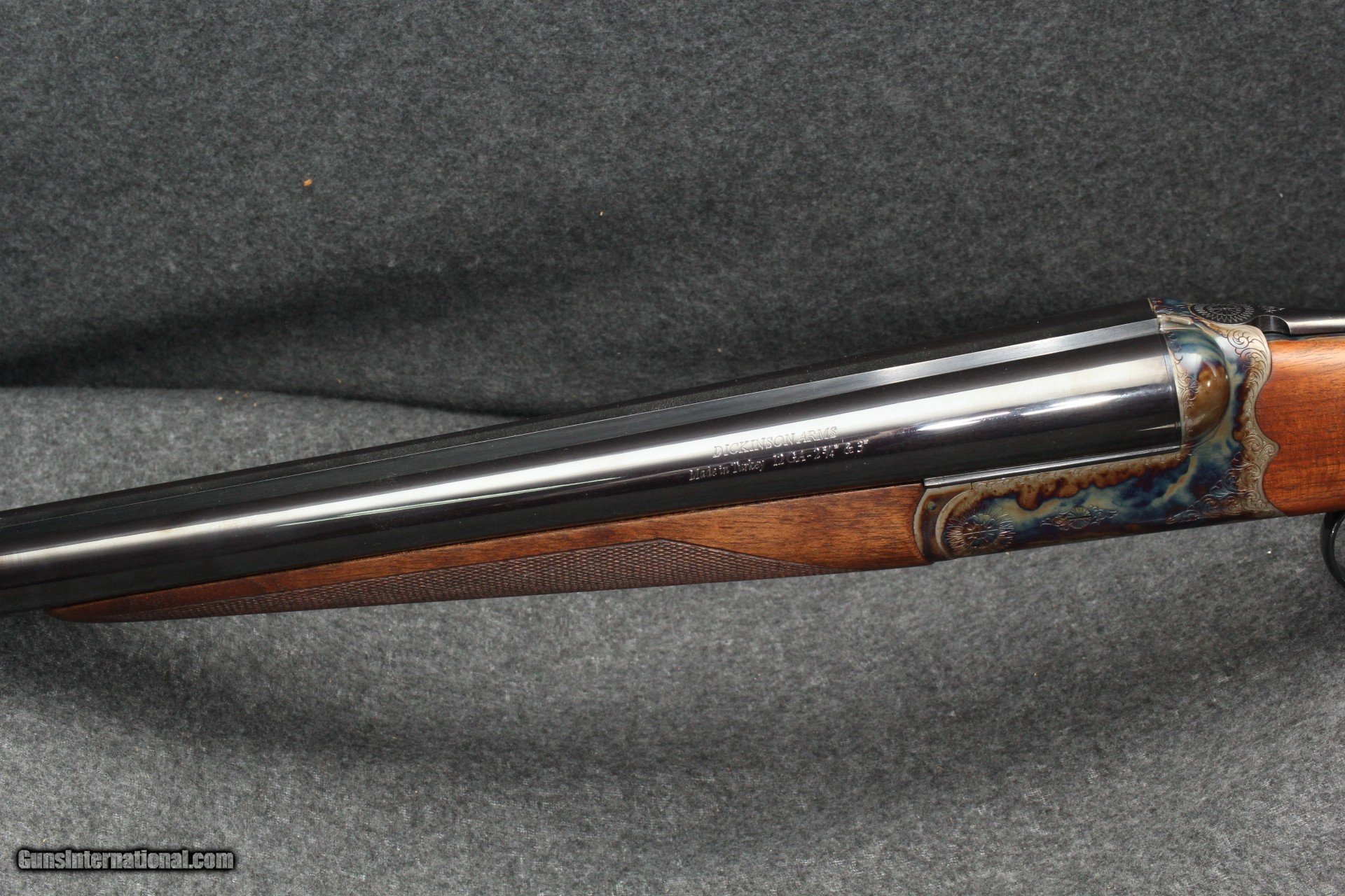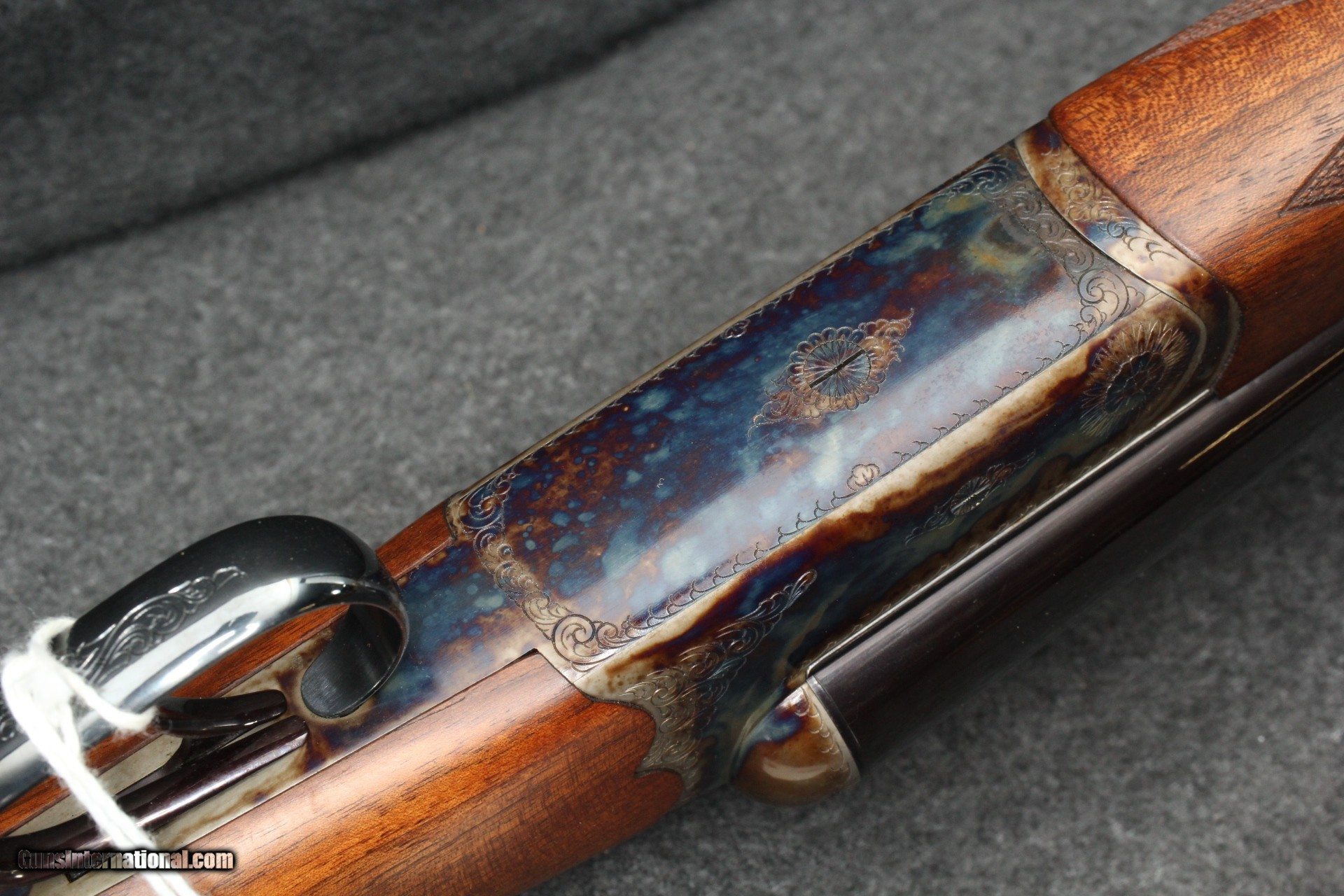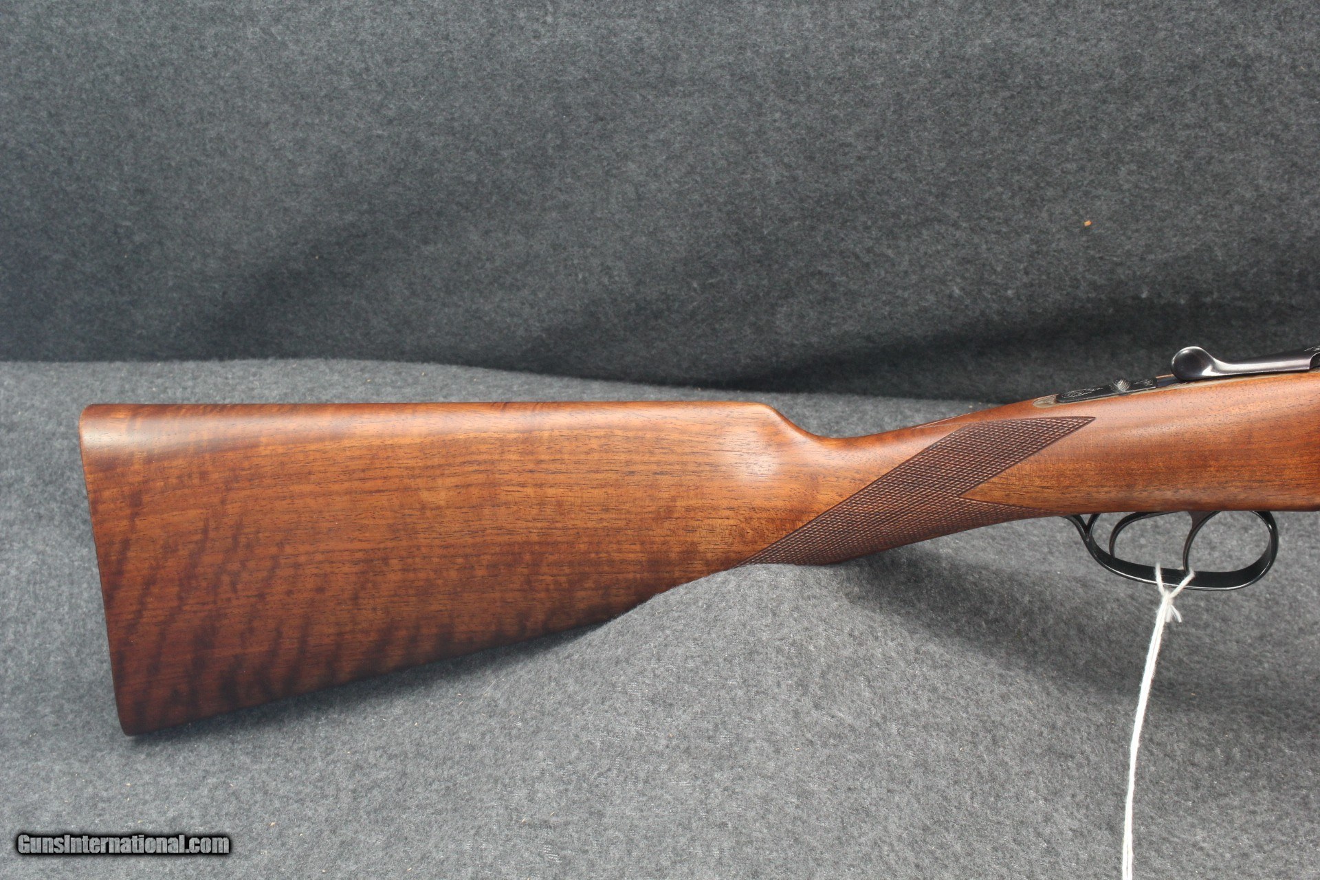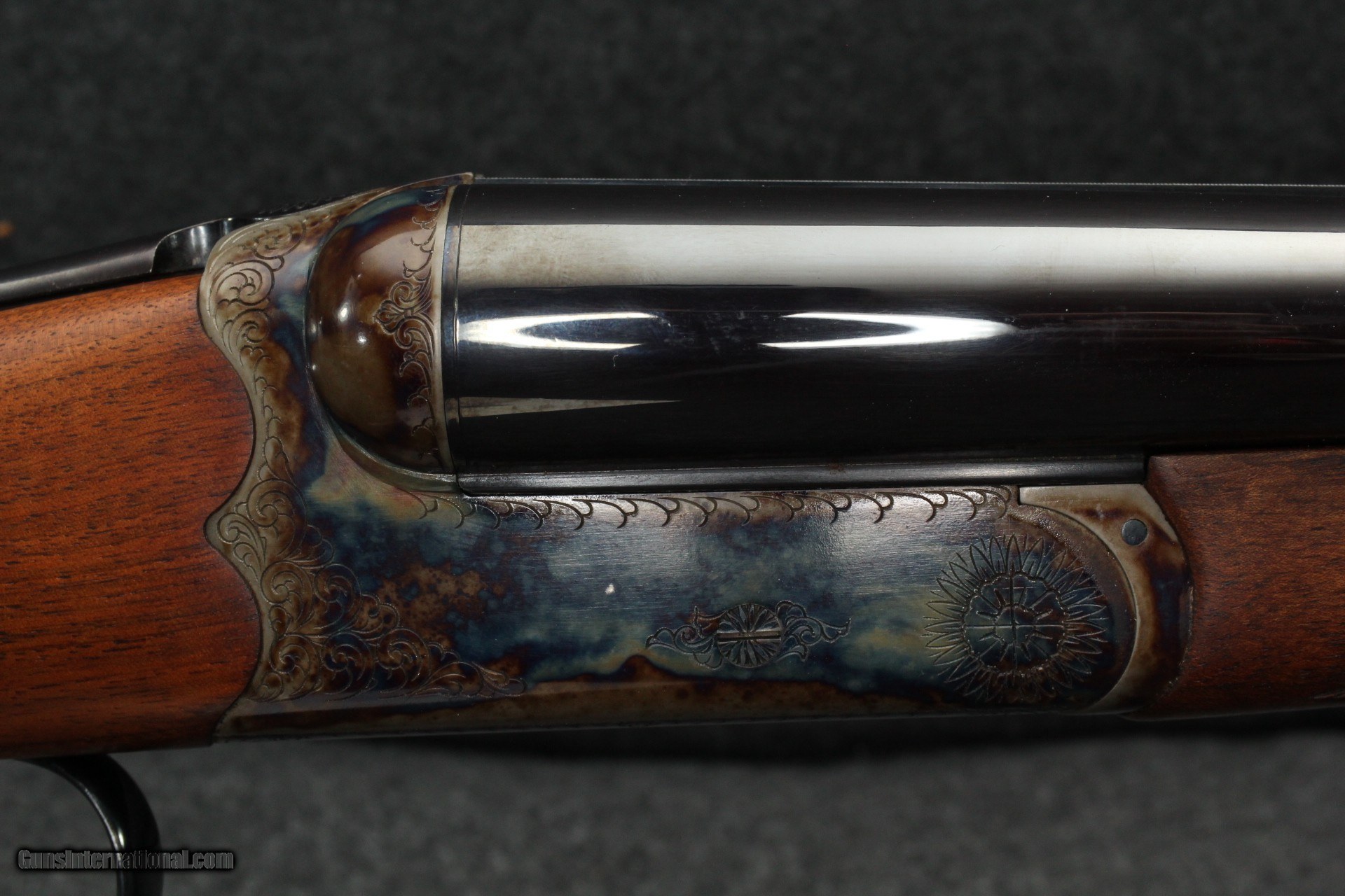Description: 12ga, 3" chambers, 26" barrels, fixed choke (full/modified). Double trigger, boxlock, ejectors, non-automatc tang safety. Overall in excellent condition. Oil finished forend with cut checkering shows little to no wear. Moderately figured buttstock shows little to no wear. Finished wood butt (no recoil pad). Blue barrels, 95%+ finish remains. Case color action, retains 95%+ finish with 20% open scroll engraving. Trigger guard retains 95% blue with 20% open scroll engraving. English straight grip stock with cast off (right hand shooter). LOP to wood 14.5". More photos on request. Please add $50.00 for shipping and insurance. SOLD Shotgun Gauge: 20 Gauge |