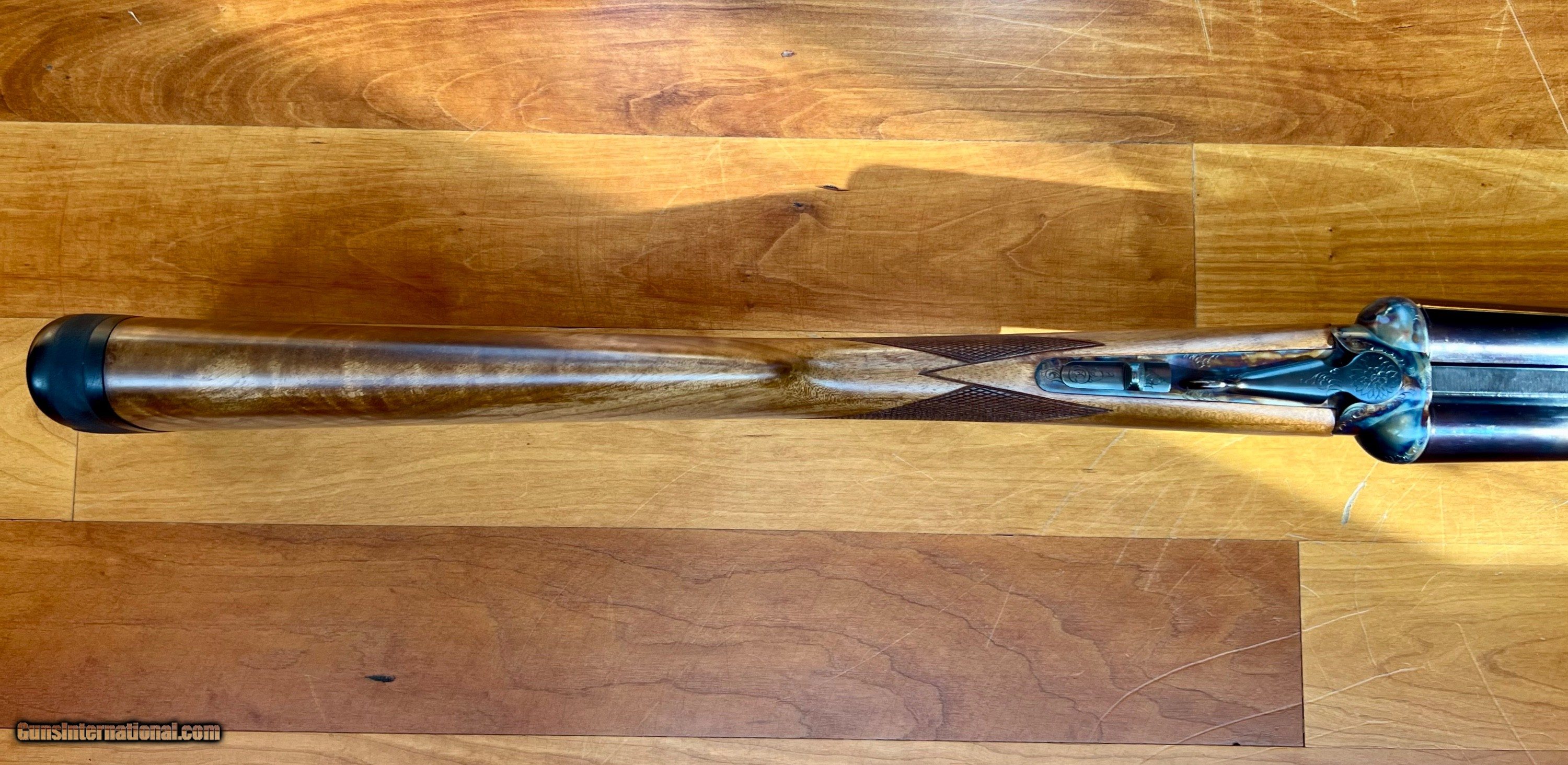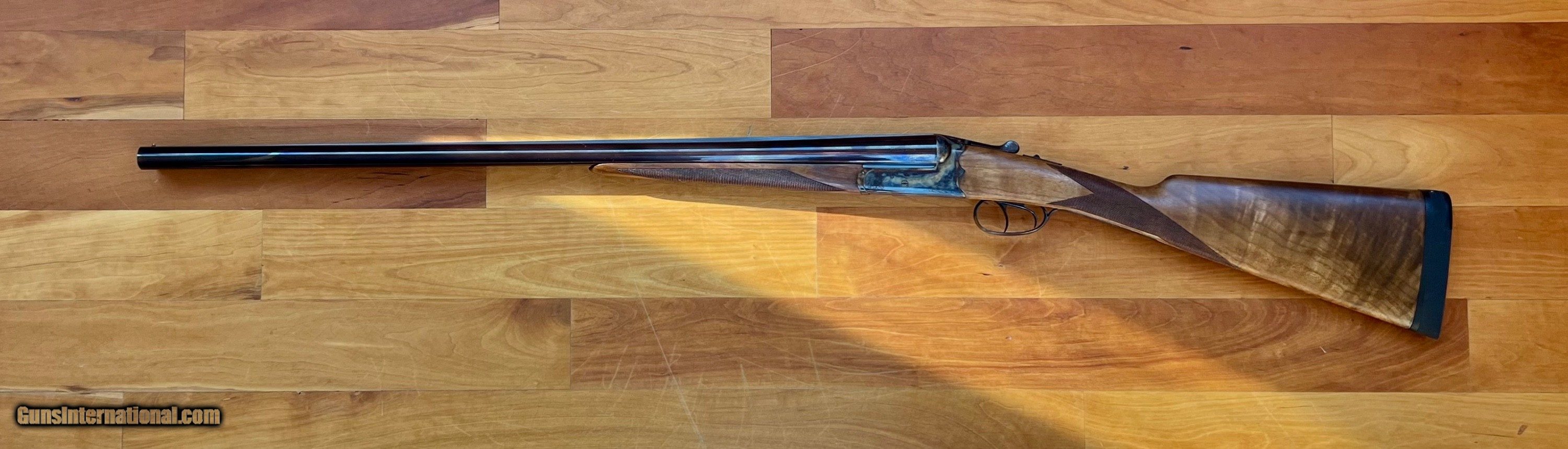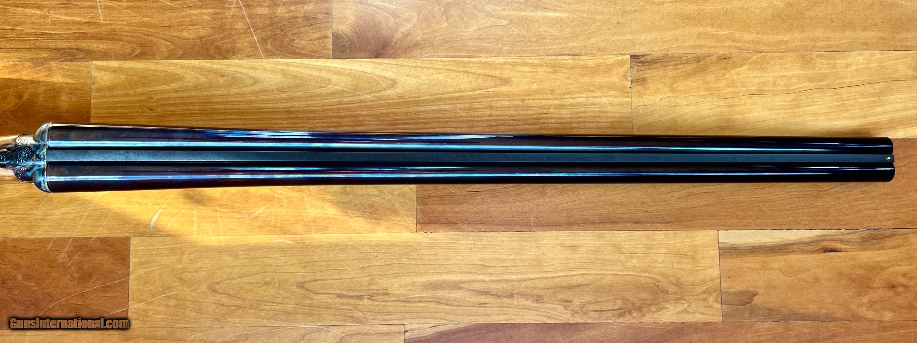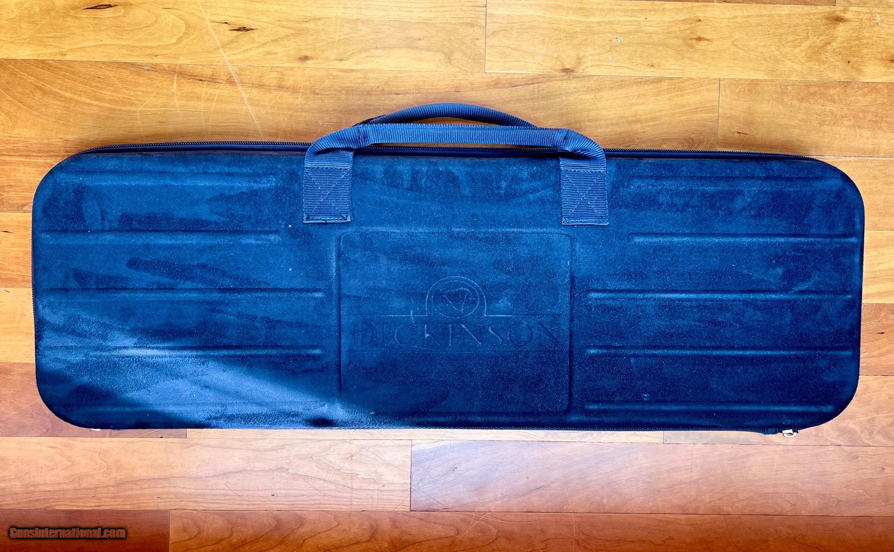 Description: Dickinson Arms Estate, 12 gauge, 28" bbls, five interchangeable thin wall choke tubes (C, IC, M, IM, F), 3" chambers, ejectors, double triggers, non-auto safety, 14 1/2 LOP. A true rounded triggerplate action, somewhat similar in design to a Scottish Round Action, not the typically square Anson & Deeley Boxlock. The hammers, sears, and leaf springs are mounted on the removable triggerplate, not on cross pins as used on the A&D. The result is a nicely rounded action bottom for a comfortable field carry. The action is properly case colored using bone and charcoal, not a cyanide dip. High gloss barrel bluing. Barrels are chrome lined and safe for steel shot. Deeley forend latch. Hand-rubbed oil finish replaces factory stock finish; Pachmayer Decelerator Old English Pad. Takedown case, soft sleeves for barrels and action, snap caps. Gun has been fired but is in near new condition. New, these guns list for $2249. $1899 plus shipping to your FFL. SOLD Shotgun Gauge: 12 Gauge |