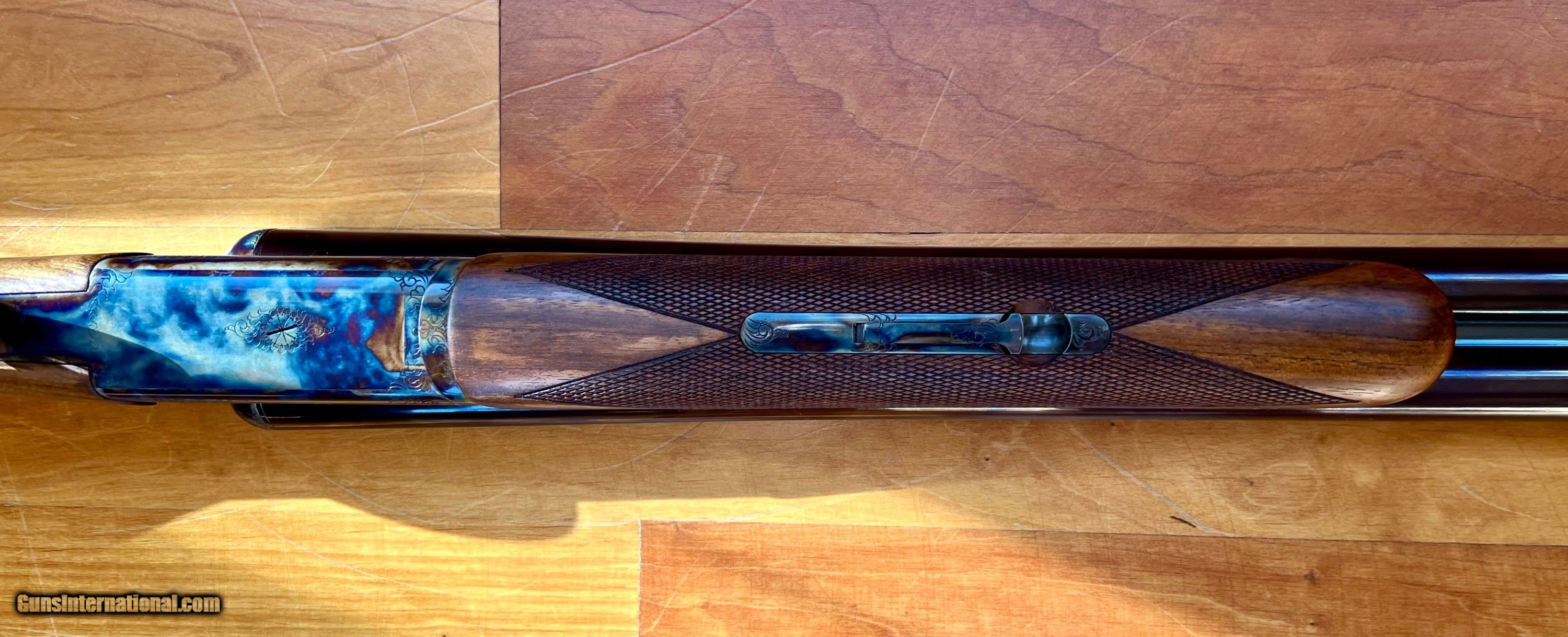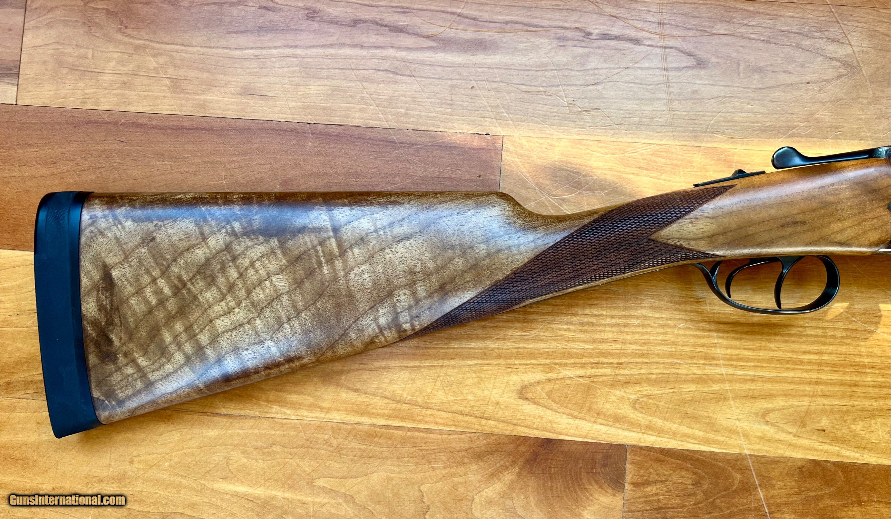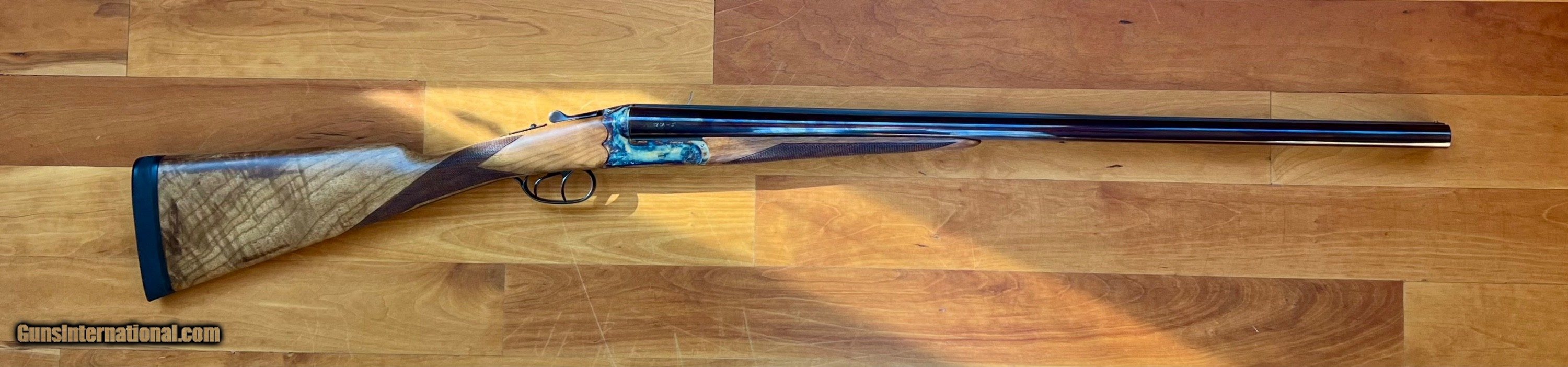 Description: Dickinson Arms Estate, 12 gauge, 28" bbls, five interchangeable thin wall choke tubes (C, IC, M, IM, F), 3" chambers, ejectors, double triggers, non-auto safety, 14 1/2 LOP. A true rounded triggerplate action, somewhat similar in design to a Scottish Round Action, not the typically square Anson & Deeley Boxlock. The hammers, sears, and leaf springs are mounted on the removable triggerplate, not on cross pins as used on the A&D. The result is a nicely rounded action bottom for a comfortable field carry. The action is properly case colored using bone and charcoal, not a cyanide dip. High gloss barrel bluing. Barrels are chrome lined and safe for steel shot. Deeley forend latch. Hand-rubbed oil finish replaces factory stock finish; Pachmayer Decelerator Old English Pad. Takedown case, soft sleeves for barrels and action, snap caps. Gun has been fired but is in near new condition. New, these guns list for $2249. $1899 plus shipping to your FFL. SOLD Shotgun Gauge: 12 Gauge |