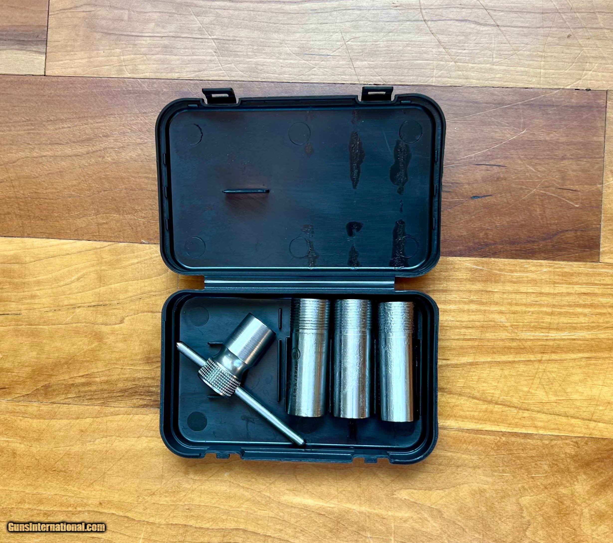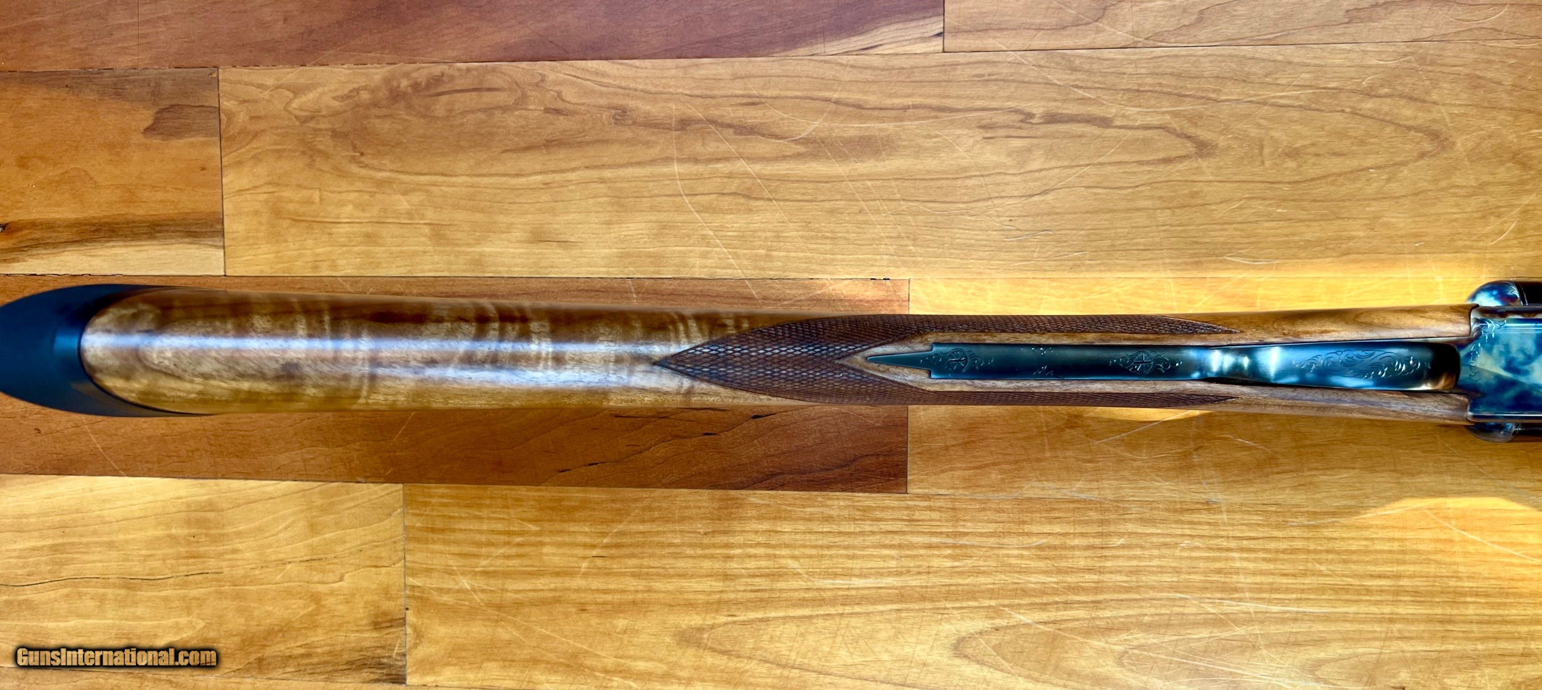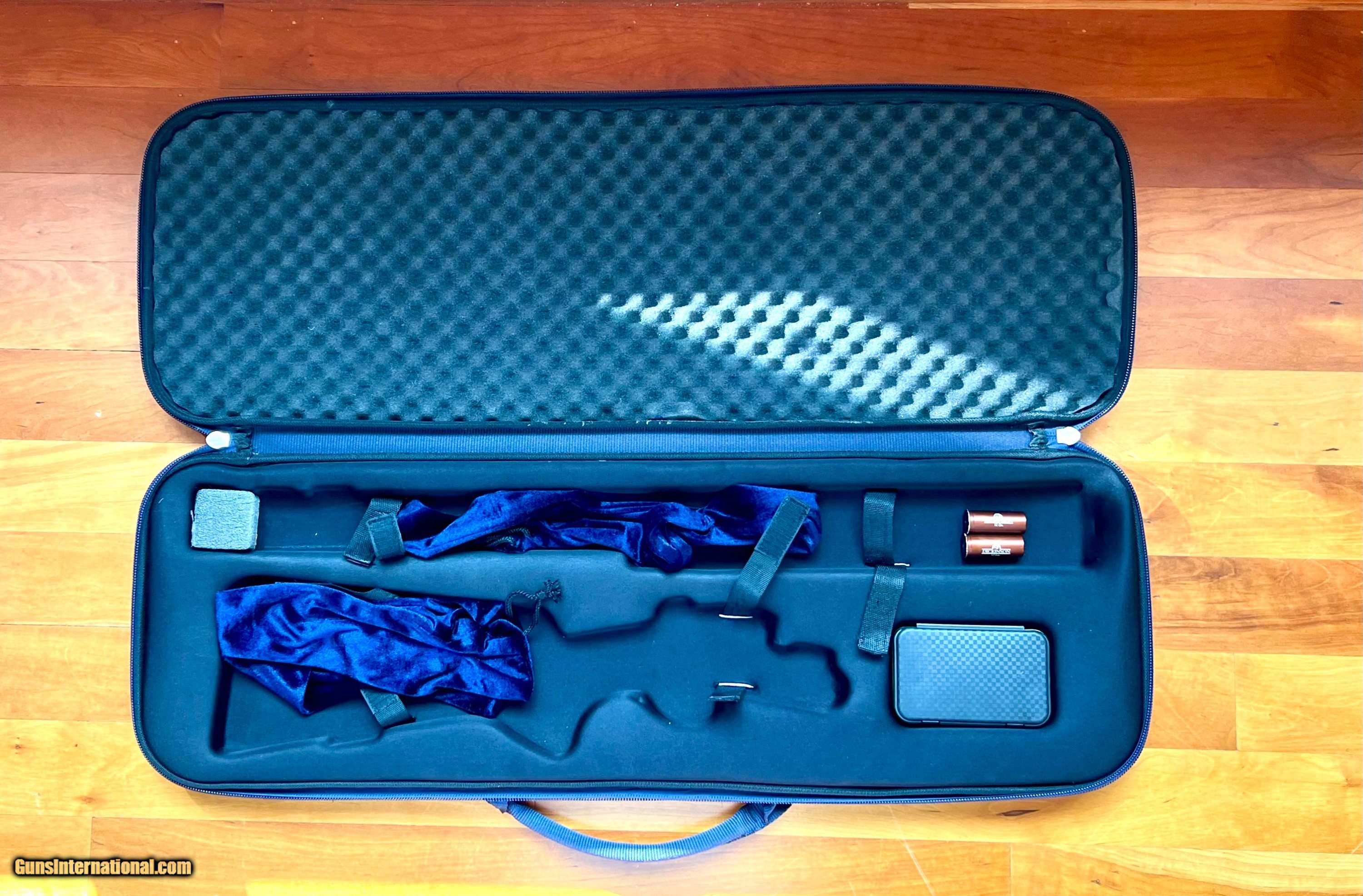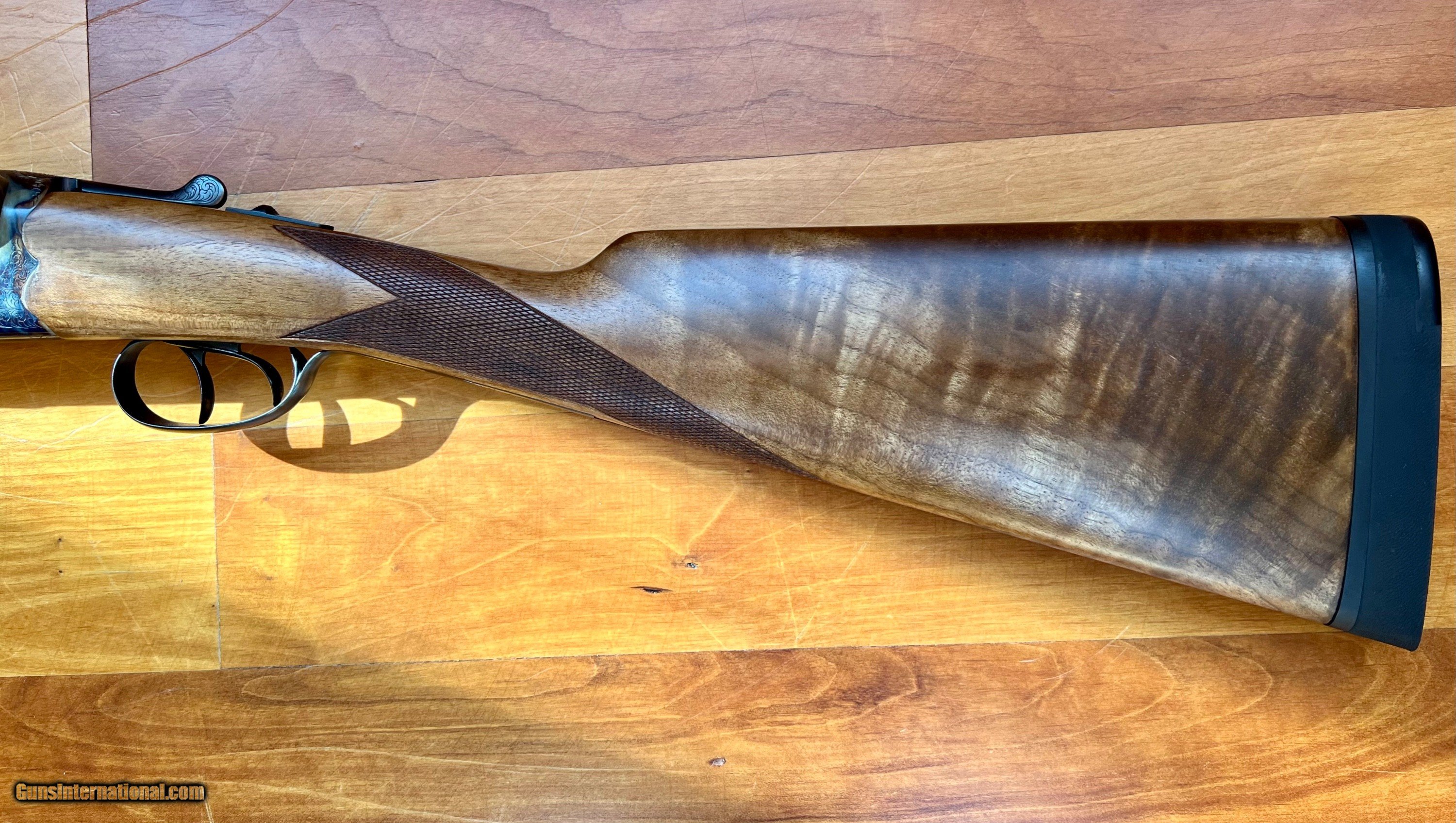 Description: Dickinson Arms Estate, 12 gauge, 28" bbls, five interchangeable thin wall choke tubes (C, IC, M, IM, F), 3" chambers, ejectors, double triggers, non-auto safety, 14 1/2 LOP. A true rounded triggerplate action, somewhat similar in design to a Scottish Round Action, not the typically square Anson & Deeley Boxlock. The hammers, sears, and leaf springs are mounted on the removable triggerplate, not on cross pins as used on the A&D. The result is a nicely rounded action bottom for a comfortable field carry. The action is properly case colored using bone and charcoal, not a cyanide dip. High gloss barrel bluing. Barrels are chrome lined and safe for steel shot. Deeley forend latch. Hand-rubbed oil finish replaces factory stock finish; Pachmayer Decelerator Old English Pad. Takedown case, soft sleeves for barrels and action, snap caps. Gun has been fired but is in near new condition. New, these guns list for $2249. $1899 plus shipping to your FFL. SOLD Shotgun Gauge: 12 Gauge |