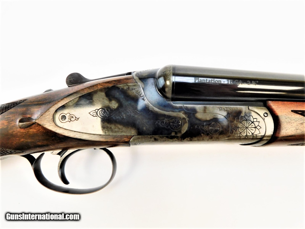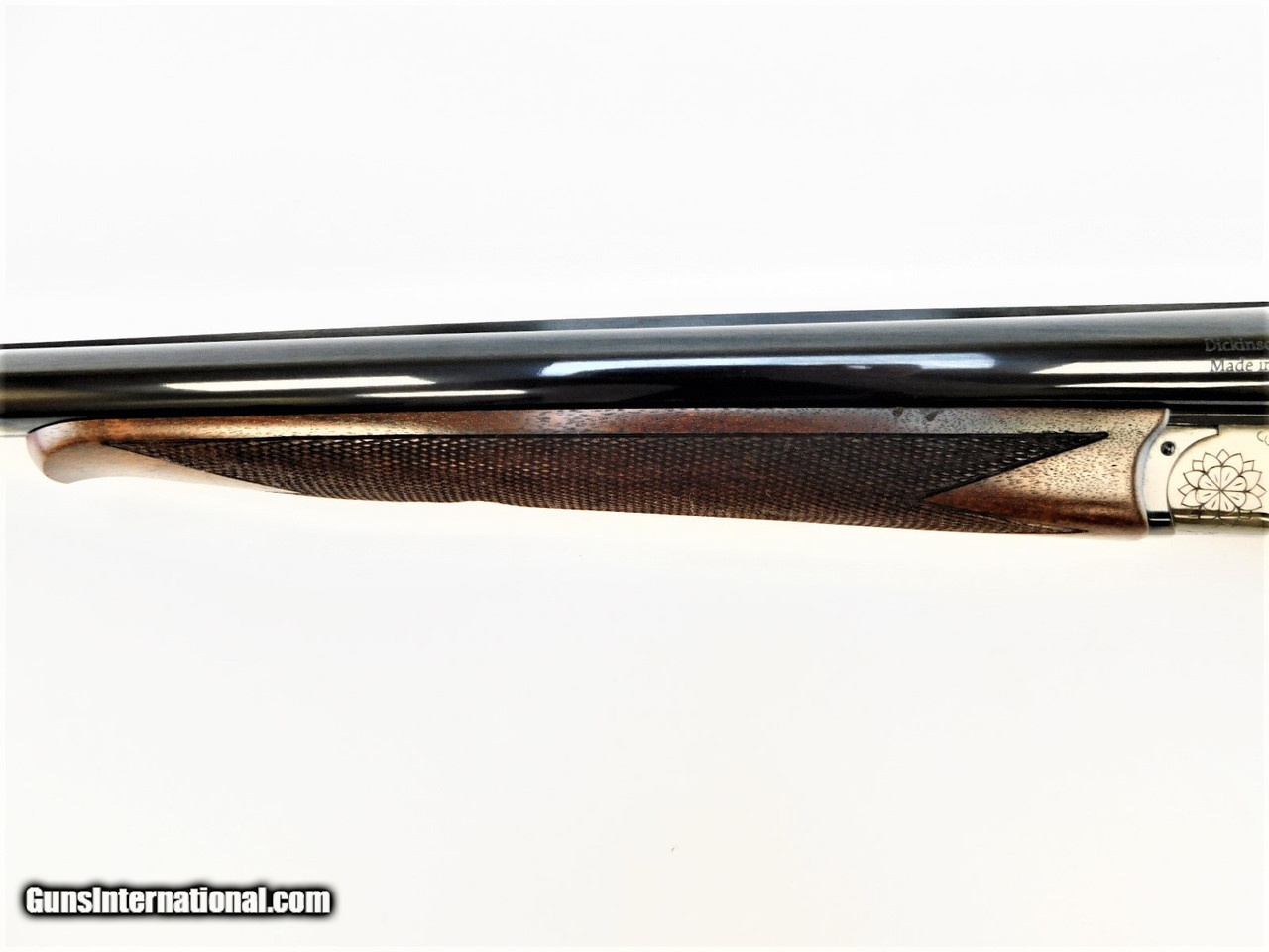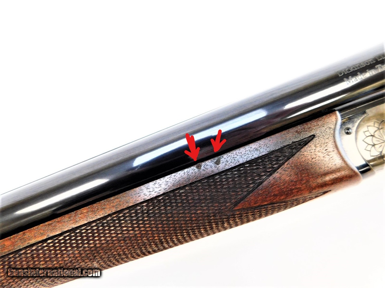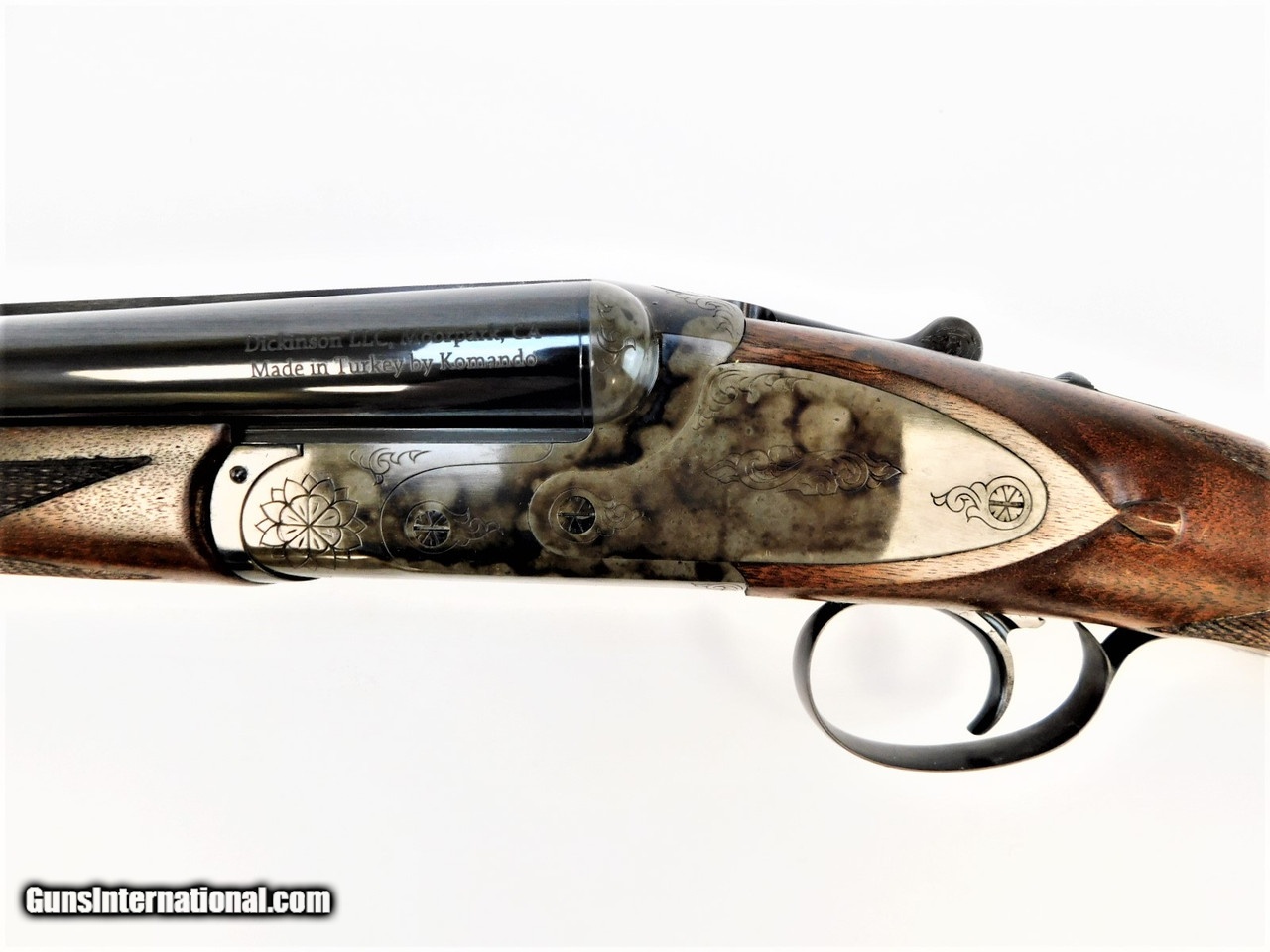 Description: Manufacturer: Dickinson Arms Model: Plantation Action: Sid-by-Side Caliber: 16 Gauge, 3" Chamber Capacity: 2 Rounds Barrel: 28" Blued Receiver: Color Case Hardening, English Scroll Trigger: Single Ejectors Safety: Manual Stock: Premium Grade Turkish Walnut, English Grip, Hand Rubbed Oil Forend: Standard Hand Rubbed Oil Length of Pull: 14.75" Buttplate: Wood Checkered Sight: Brass Bead Chokes: Full, Improved Modified, Modified, Cylinder, Improved Cylinder Overall Length: 45.50" Weight: 6.7 lbs This firearm was displayed in a demo expo showing off the gorgeous wood & features of Dickinson Arms Custom Models. This shotgun is Brand New and may have been fired outside the factory for demo purposes. These models may have extremely minor handling marks. Any handling marks or blemishes will be pointed out with red arrows in the pictures above. Pictures above are of the actual firearm you'll be receiving. SOLD |