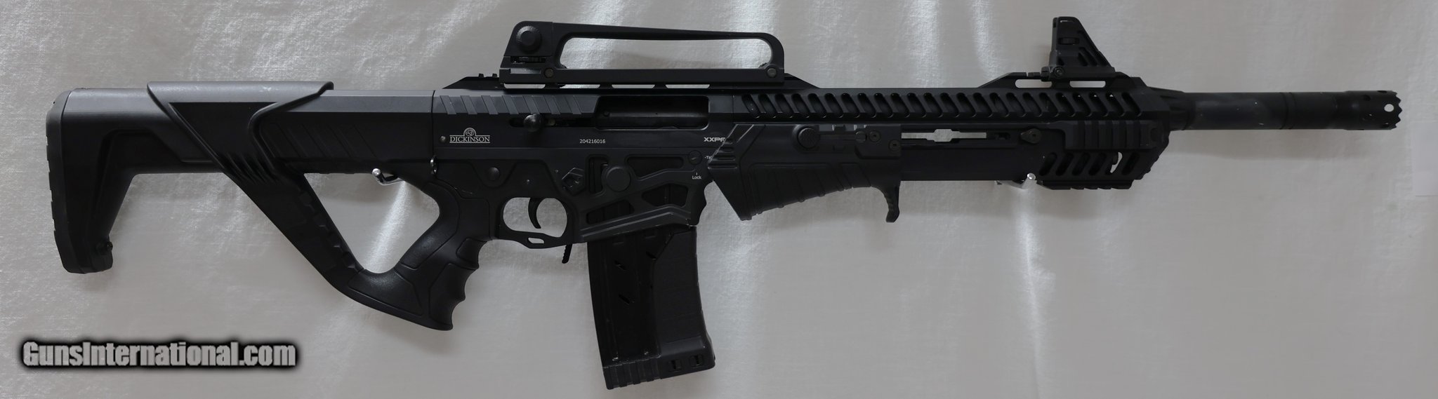 Description: Guns Listing ID: 1417030 This is a pre-owned shotgun made by Dickinson Arms model XXPA, chambered in 12ga. This shotgun has a unique feature, it is both a pump and a semi-auto shotgun. The theory being, if the semi-auto jams, you can switch to a pump and still have a working firearm. Overall condition is fair. The body is in good condition. The barrel is discolored possibly from heat exchange or weather. There is signs of rust on the screw heads. It appears there have been several rounds shot through this firearm. It is fully functional, and a great security firearm or hog hunter! Includes three 10 round magazines. Dickinson XXPA-12SB: Dickinson shotguns are constructed using a new design that allows for strength simplicity of operation and lightweight. You will notice the ease that the barrel fore-end and bolt may be removed as a unit to facilitate cleaning. And the smoothness of function is uniform, whether firing light 2 3/4\" shells or heavy 3\" shells. All materials are the finest for their intended purpose, assuring years of trouble-free operation. This model is considered a \"hybrid\" as it features pump-action and semi-automatic operation. This system is excellent as it allows this model to be 100% functional, no matter the situation! These photos represent the exact firearm for sale. As with many used firearms, this item may contain scratches and/or signs of wear. This is not always the case but should not be unexpected. No original box or other accessories. SOLD Manufacturer: DICKINSON ARMS Model: XXPA Condition: Used - Non-Certified Barrels: 18.5 BARREL Gauge Info: 12 GA Finish: BLACK |