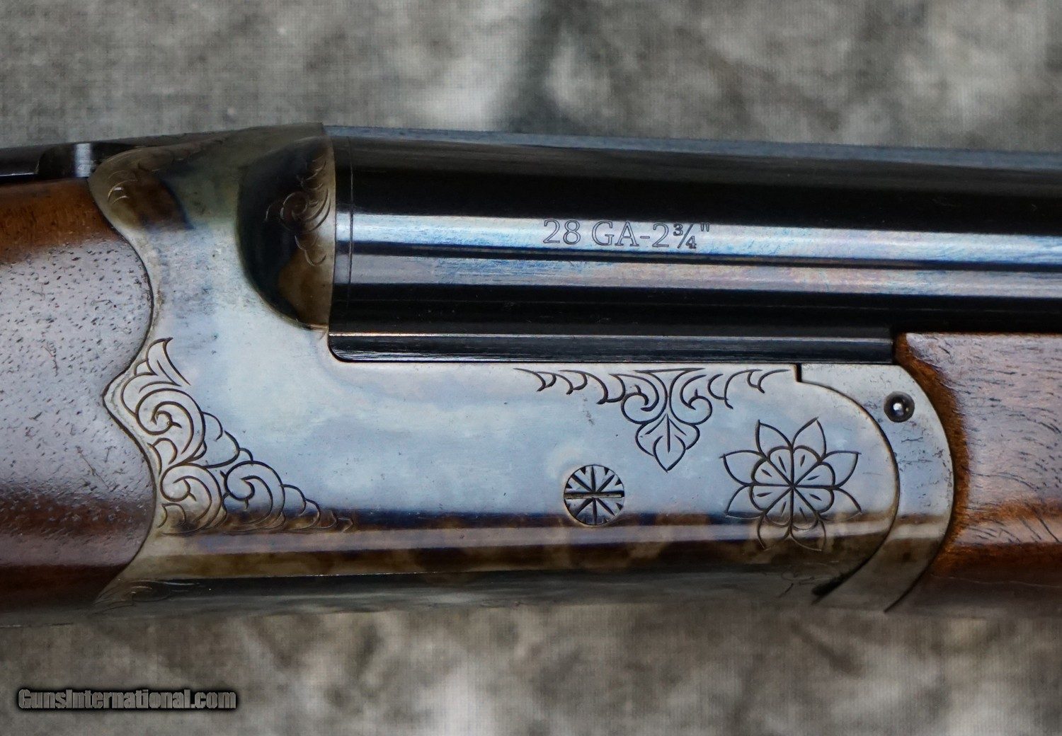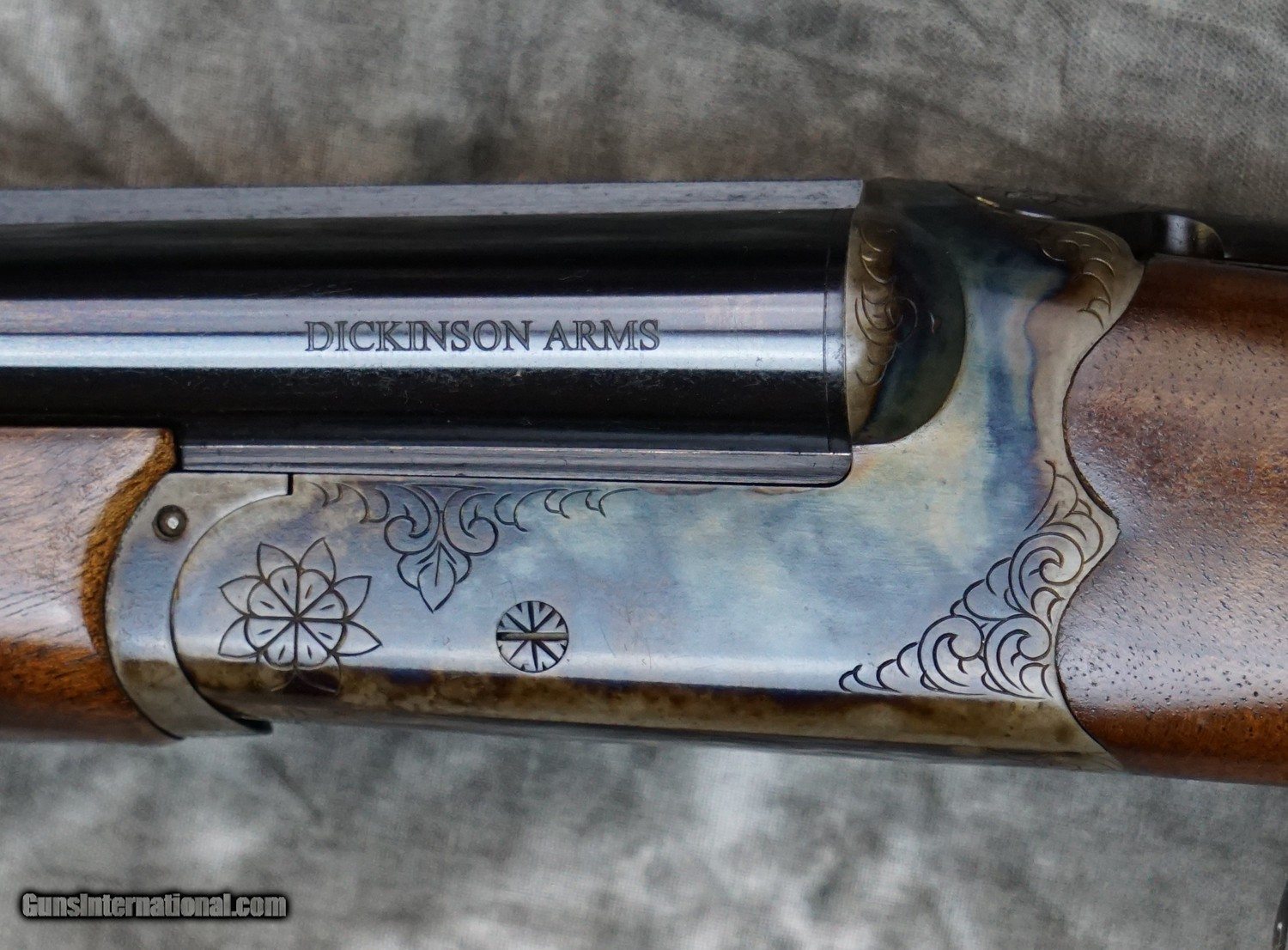 Description: New Dickinson Estate boxlock side by side field 28GA with 28" factory choke tubed barrels, solid rib. Case color hardened boxlock action with single, non-selective trigger. Factory English straight-hand stock to checkered butt, splinter forearm. Includes factory case, chokes and tools. SOLD Shotgun Gauge: 28 Gauge |